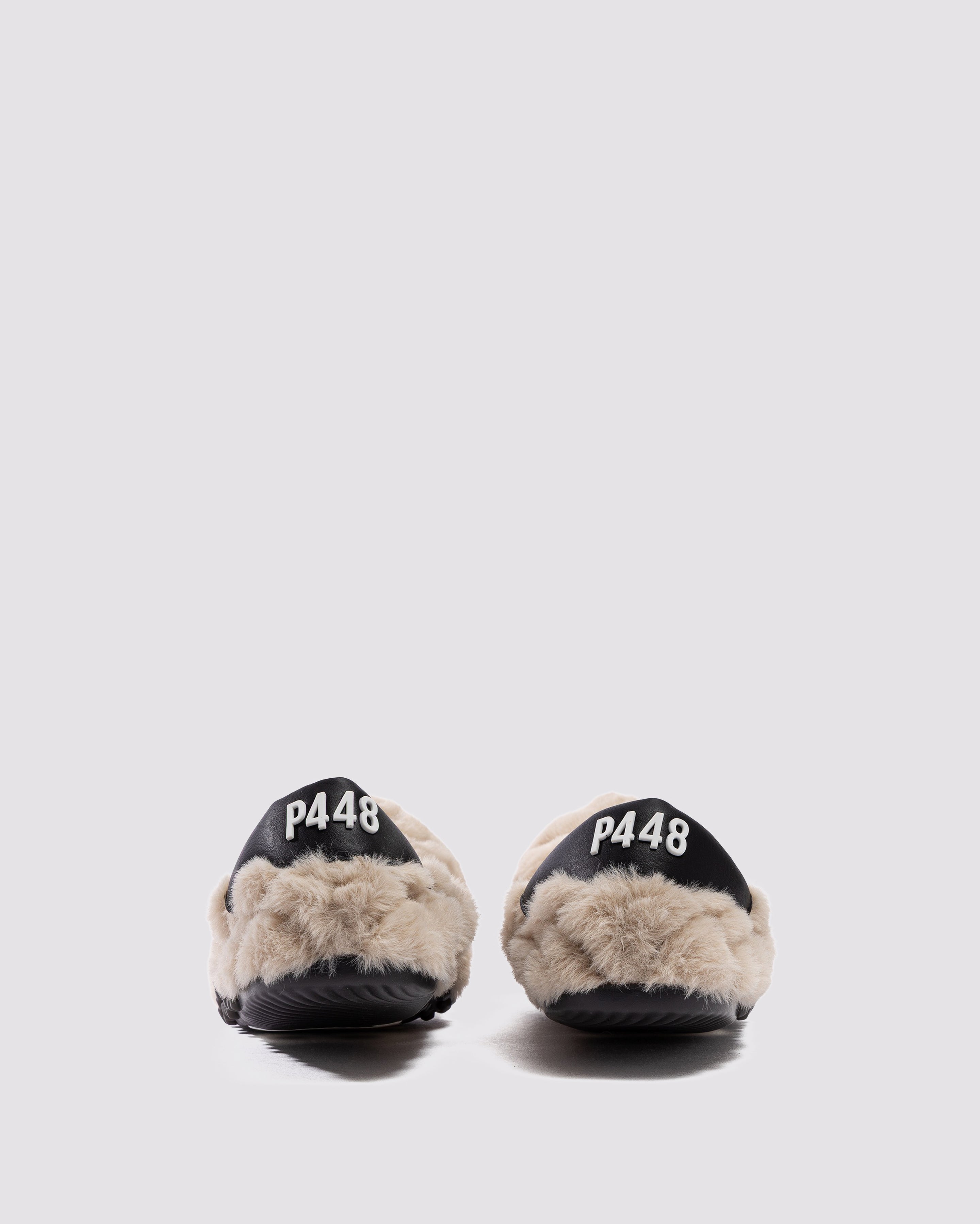 The Stella Fur Beige is the faux fur trim flat that always makes a statement. It features an all-over quilted taupe faux fur design with a black recycled leather heel tab. Our P448 raised black rubber soles off the look.