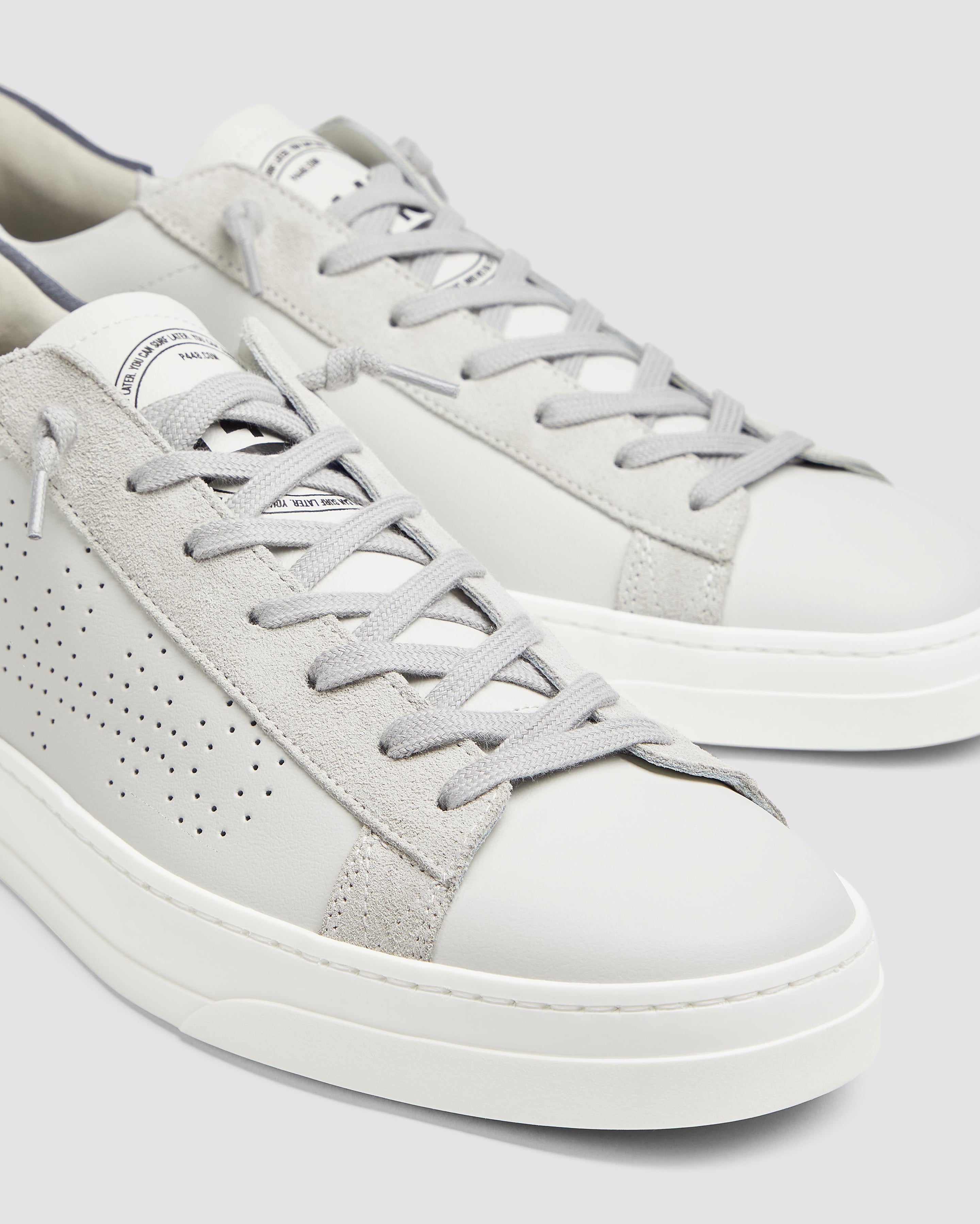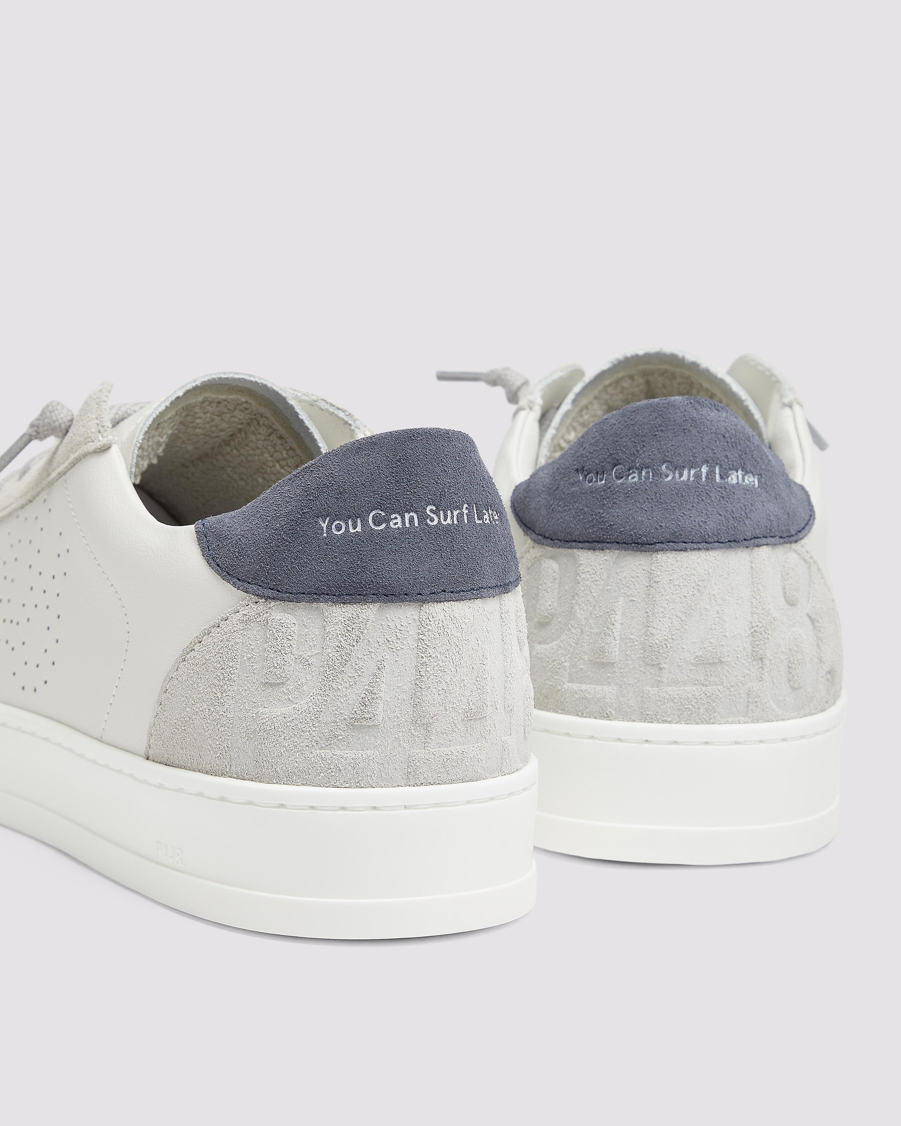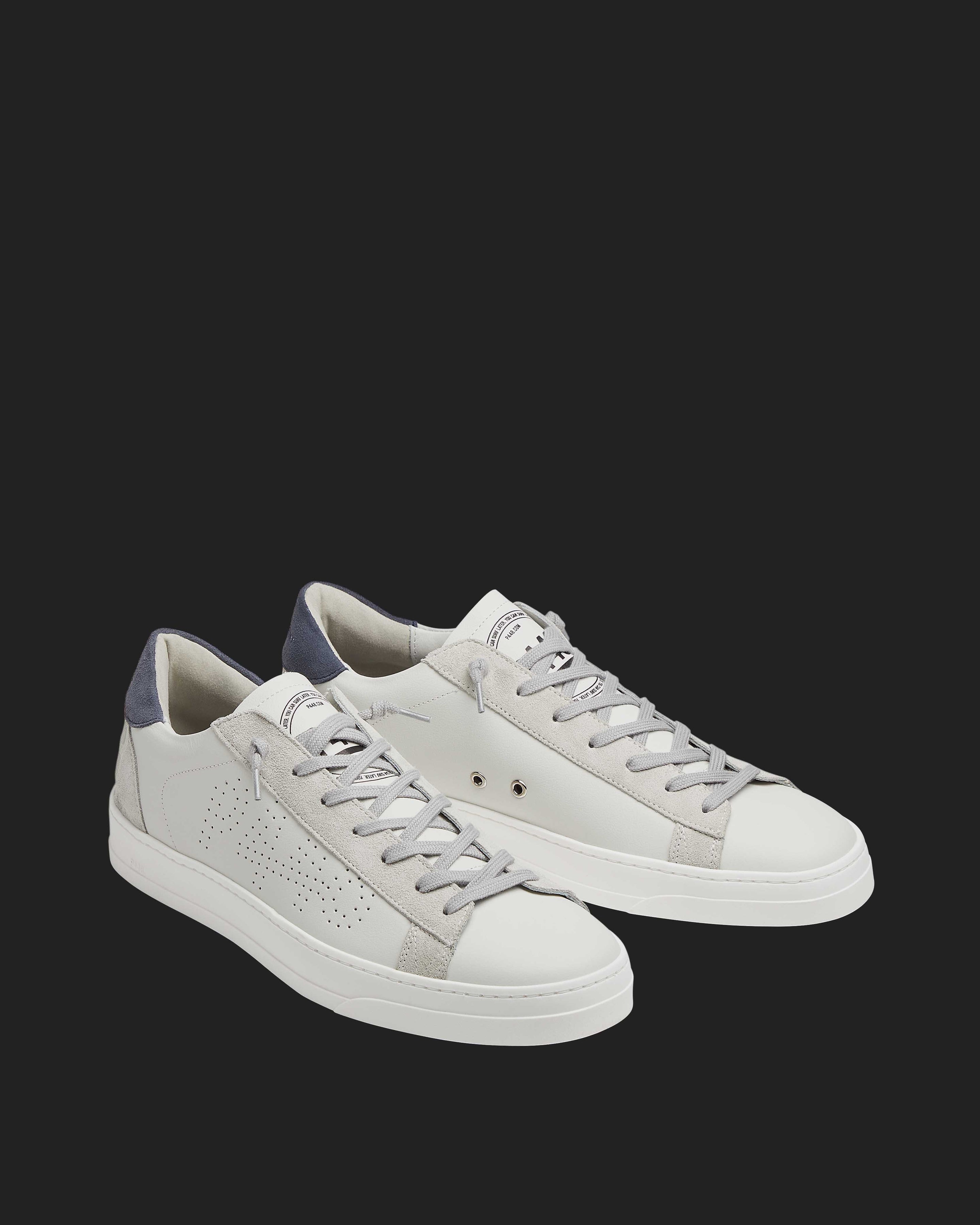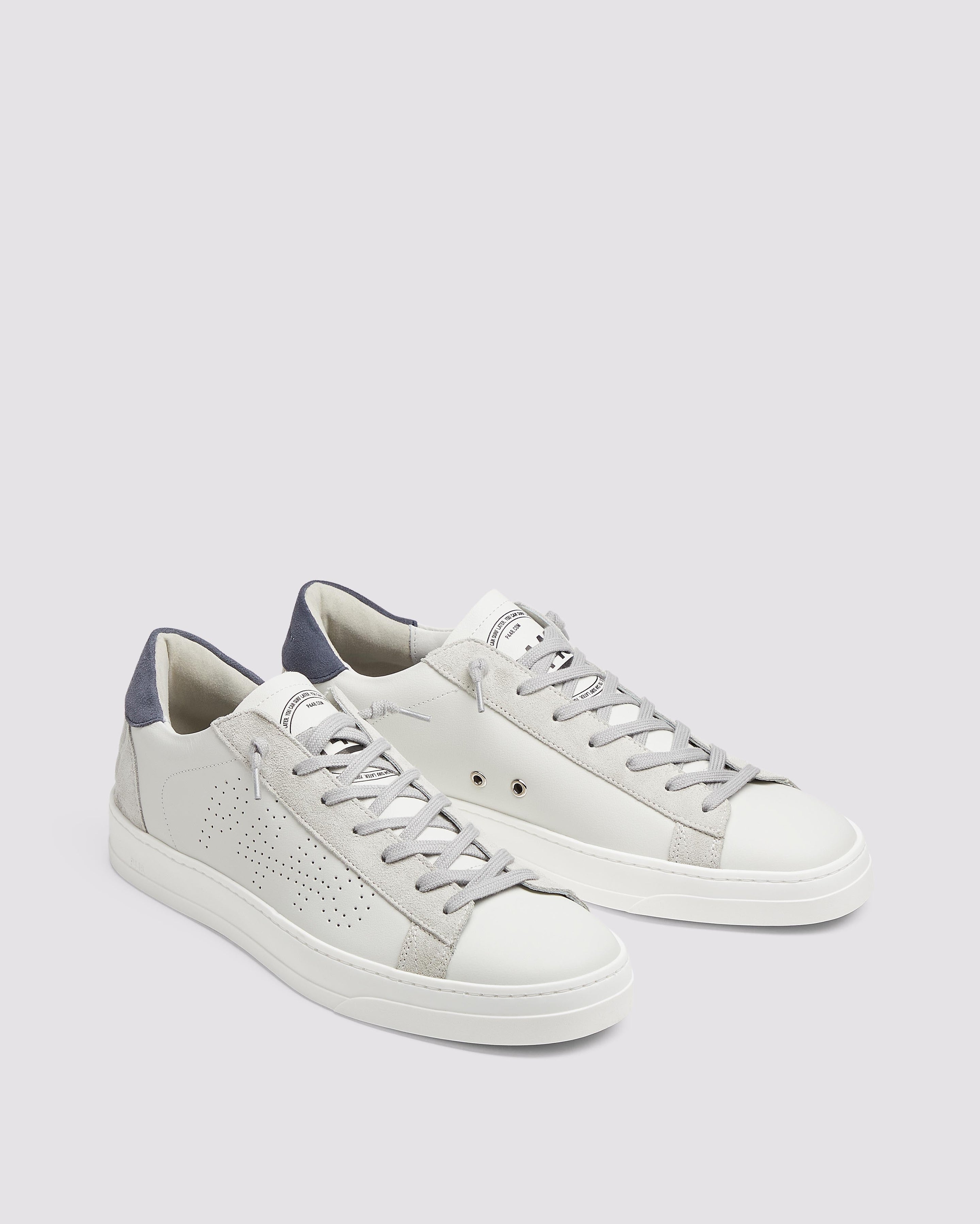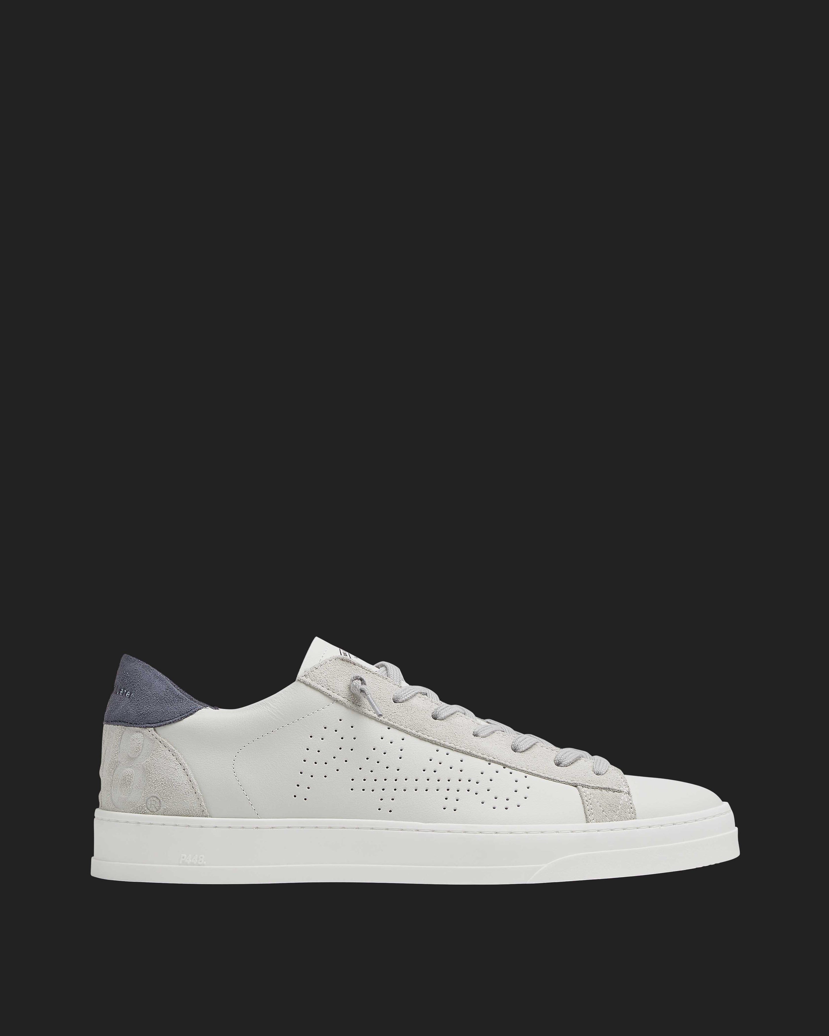 The Jack White/Navy features a white leather upper with a perforated P448 logo, complemented by grey suede trims and a...
