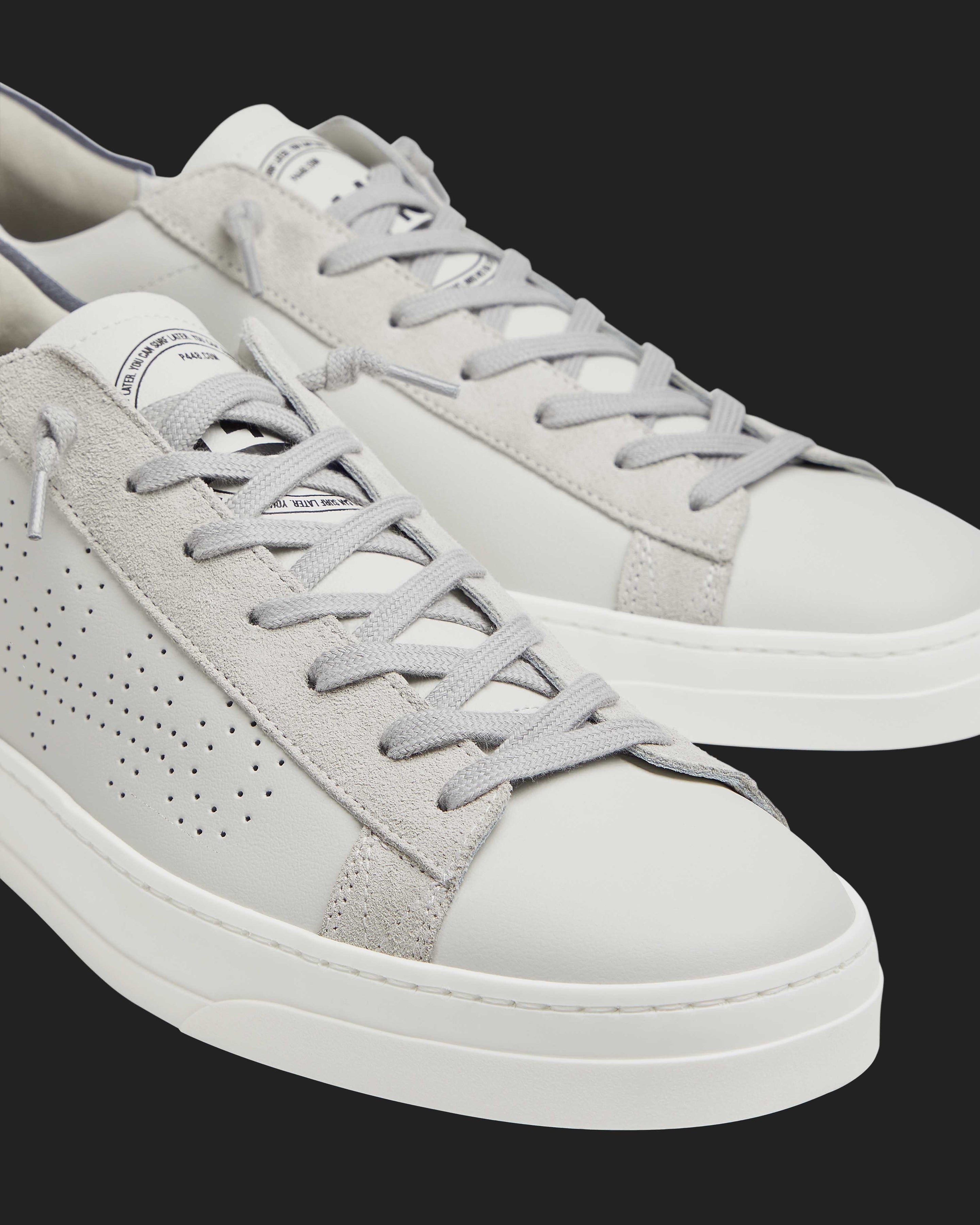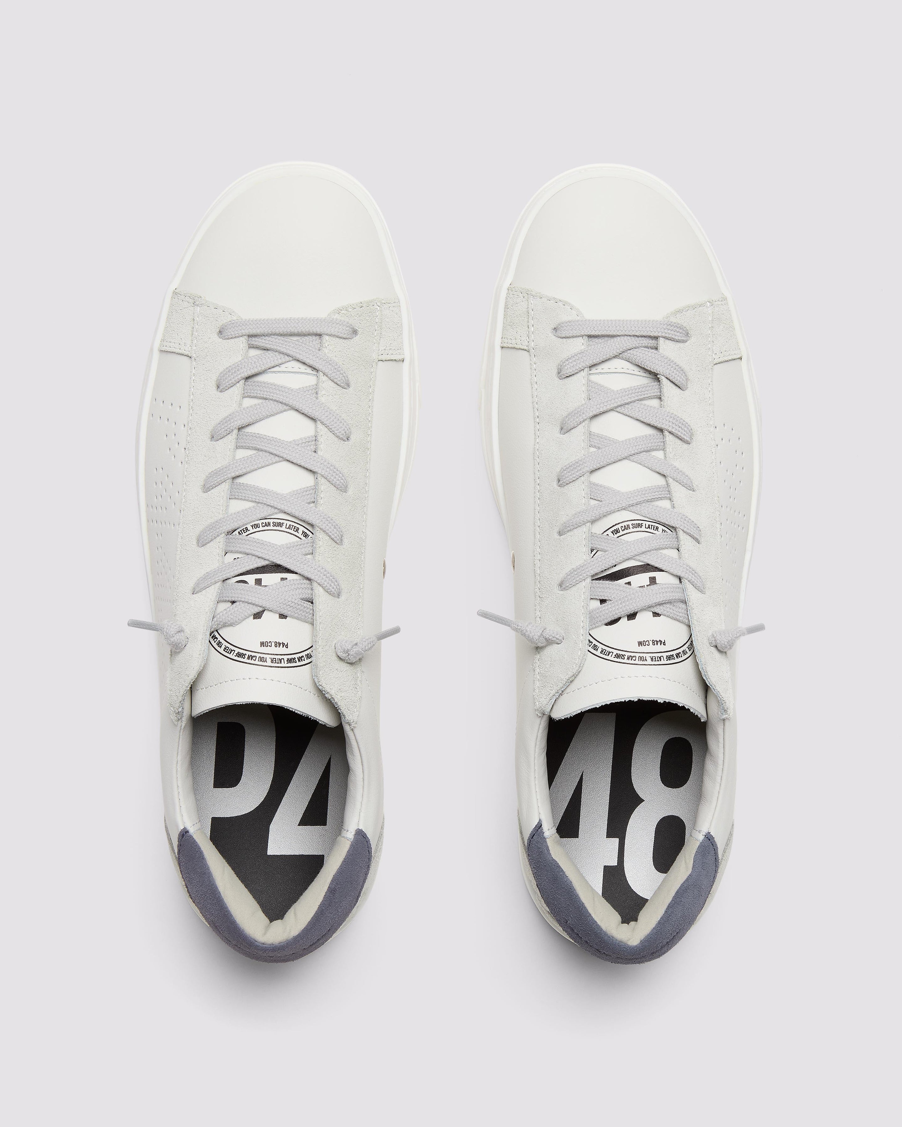 The Jack White/Navy features a white leather upper with a perforated P448 logo, complemented by grey suede trims and a navy leather heel tab. Grey cotton laces and our signature P448 rubber soles with a amber tread ground the look.