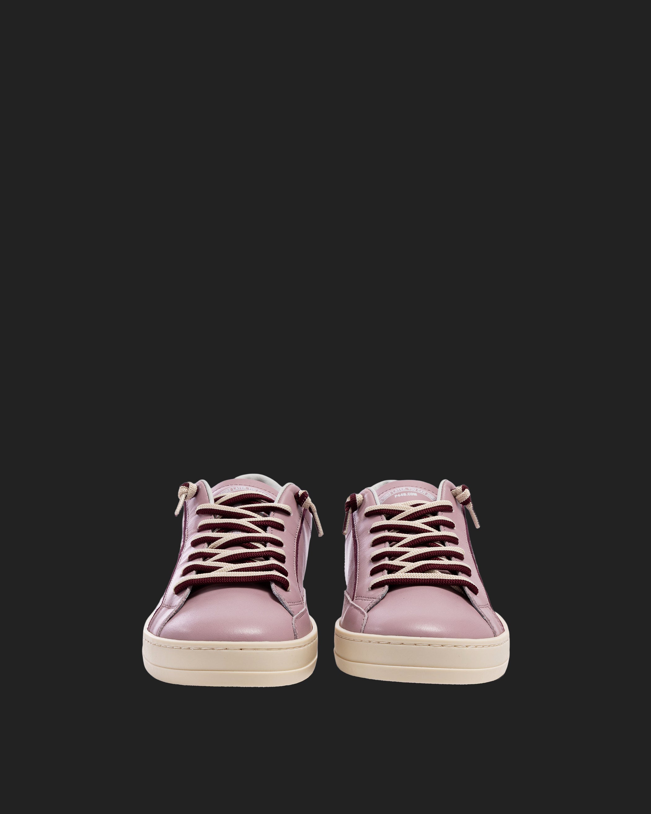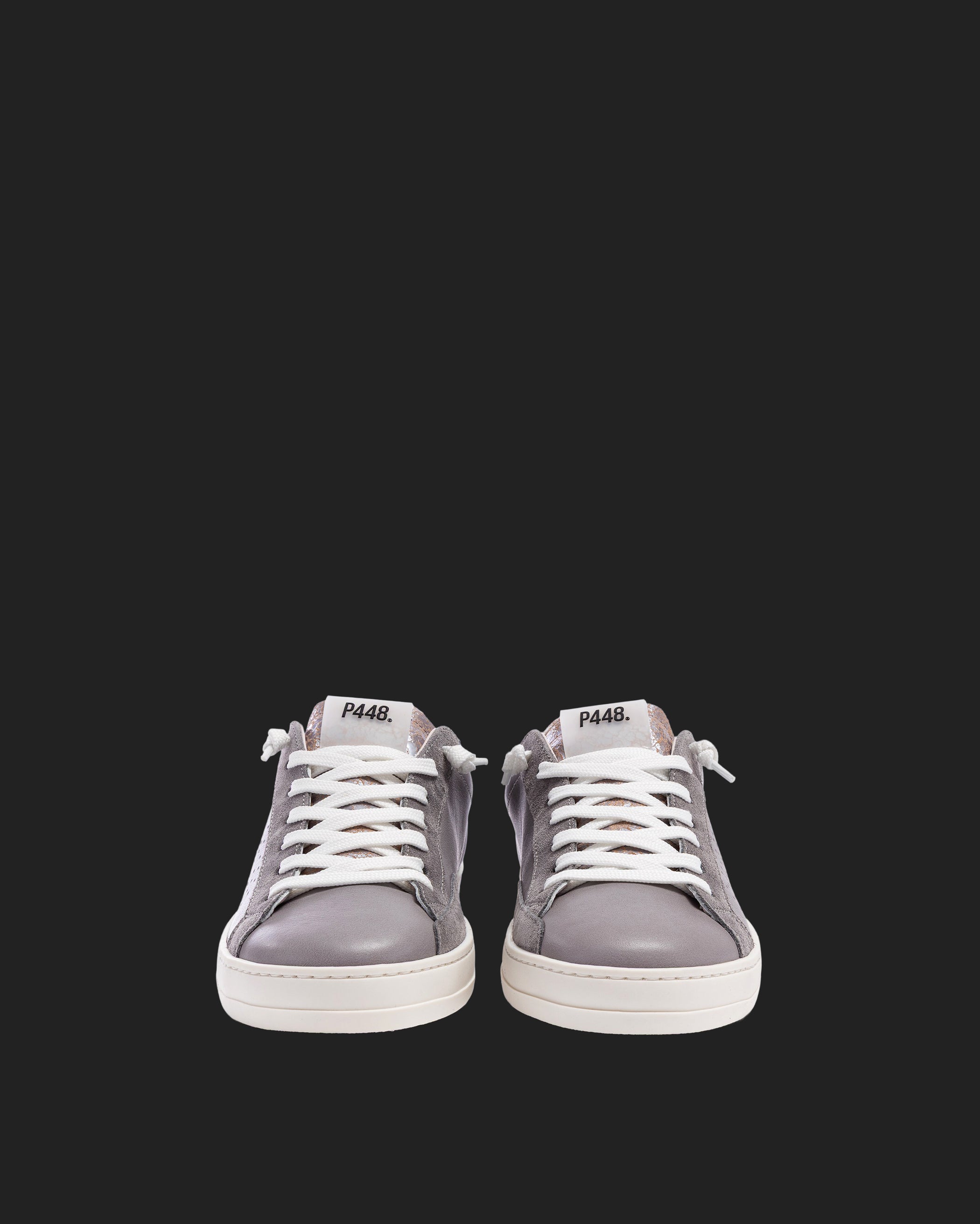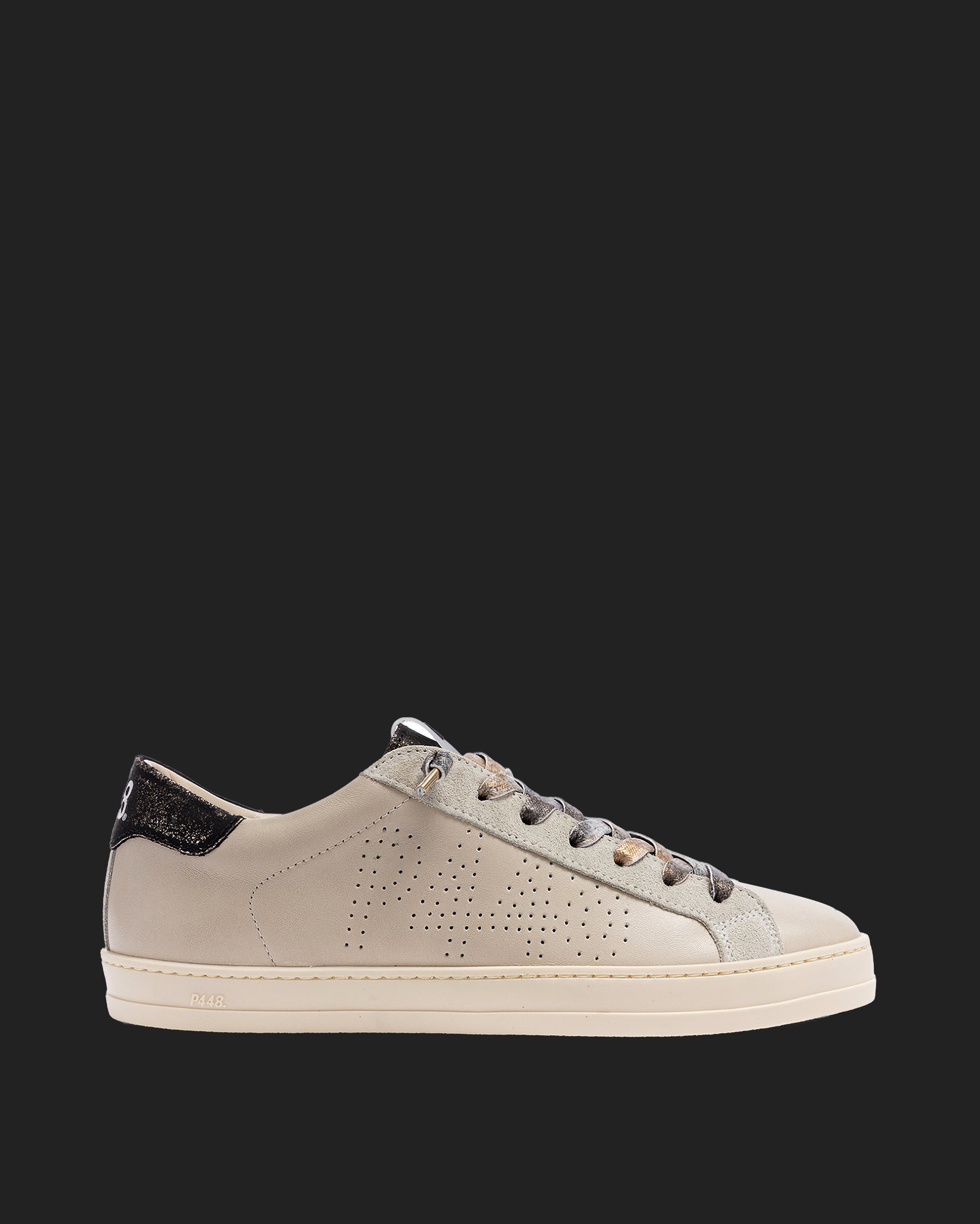 The John Black/Rame is wrapped in black and silver leather with matching tongue, grounded by a black leather toe and heel tab. Black cotton laces and our signature P448 hand-distressed rubber soles with black treads ground the look.