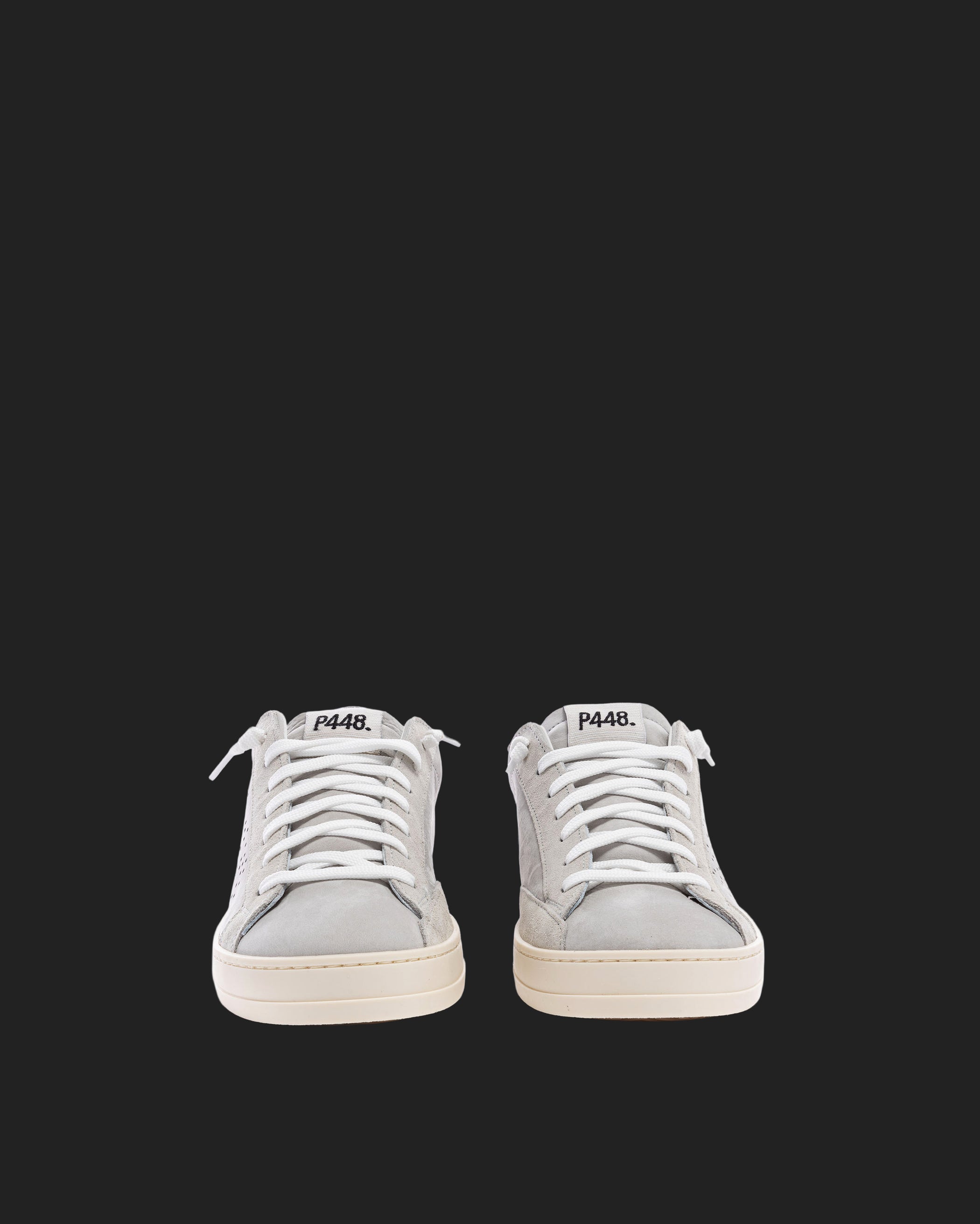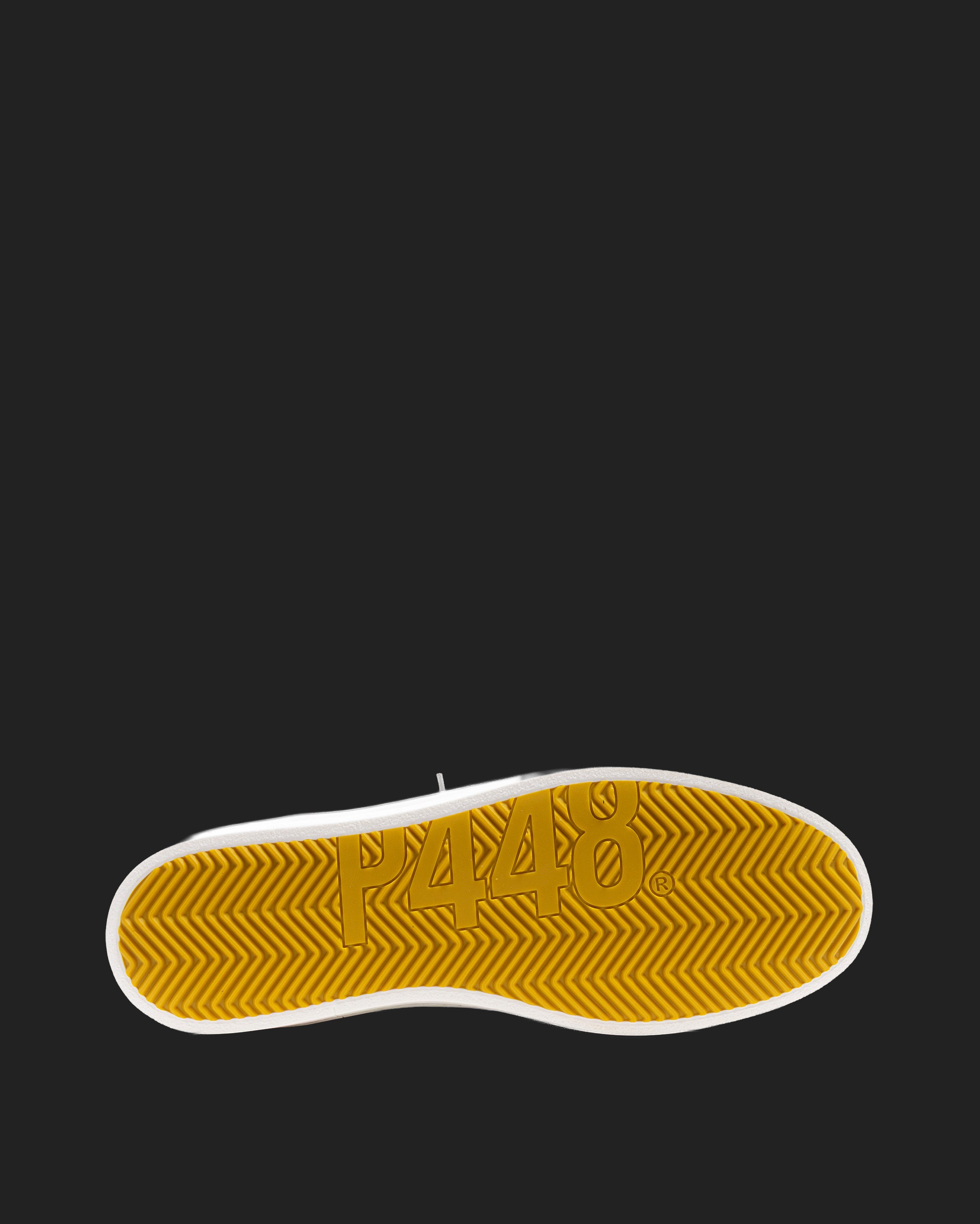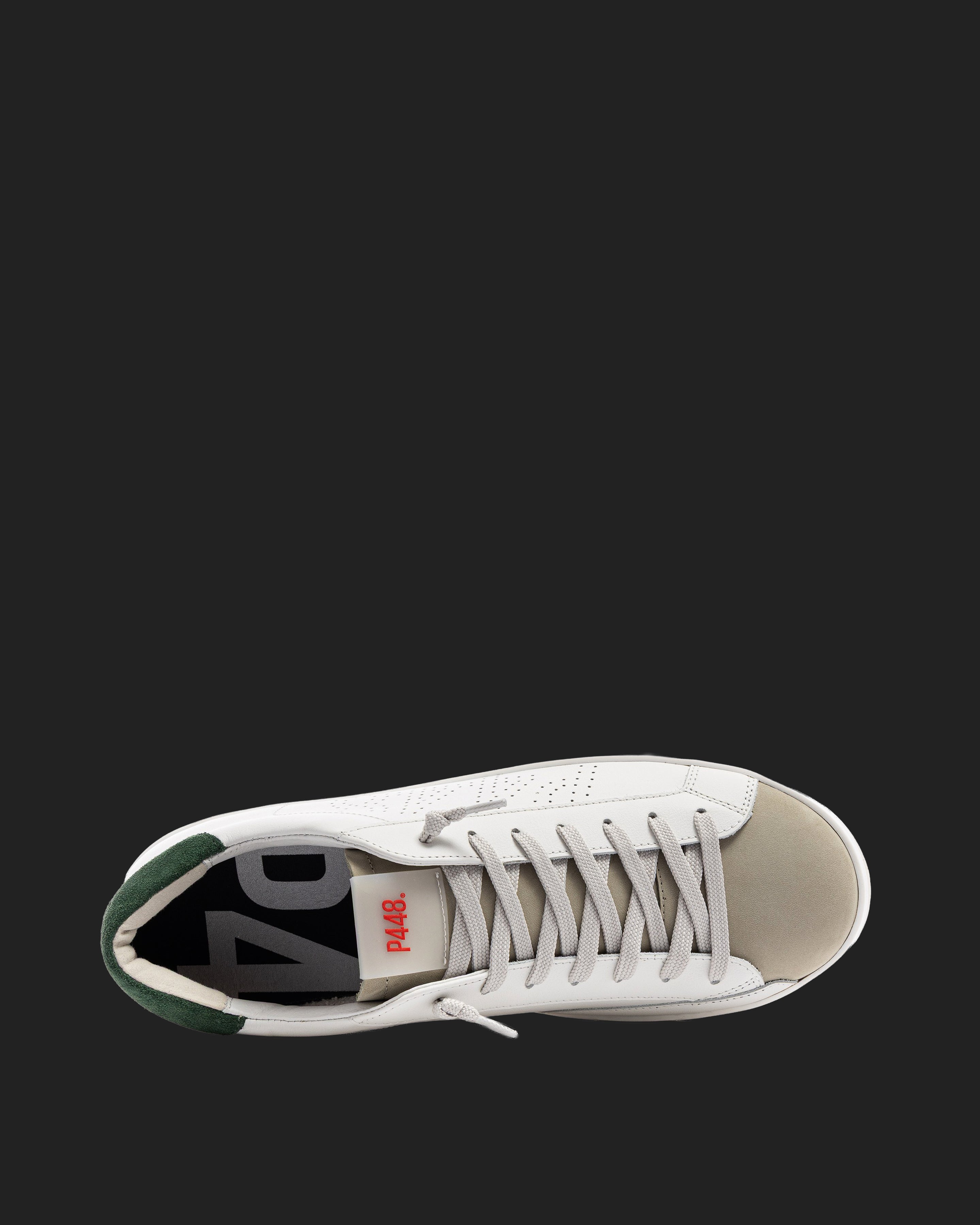 The John Green features a white leather upper with a perforated P448 logo, accented by a green suede tongue and toe. A dark green heel tab and grey silver laces complete the look, grounded by our signature P448 rubber soles with a brown tread.