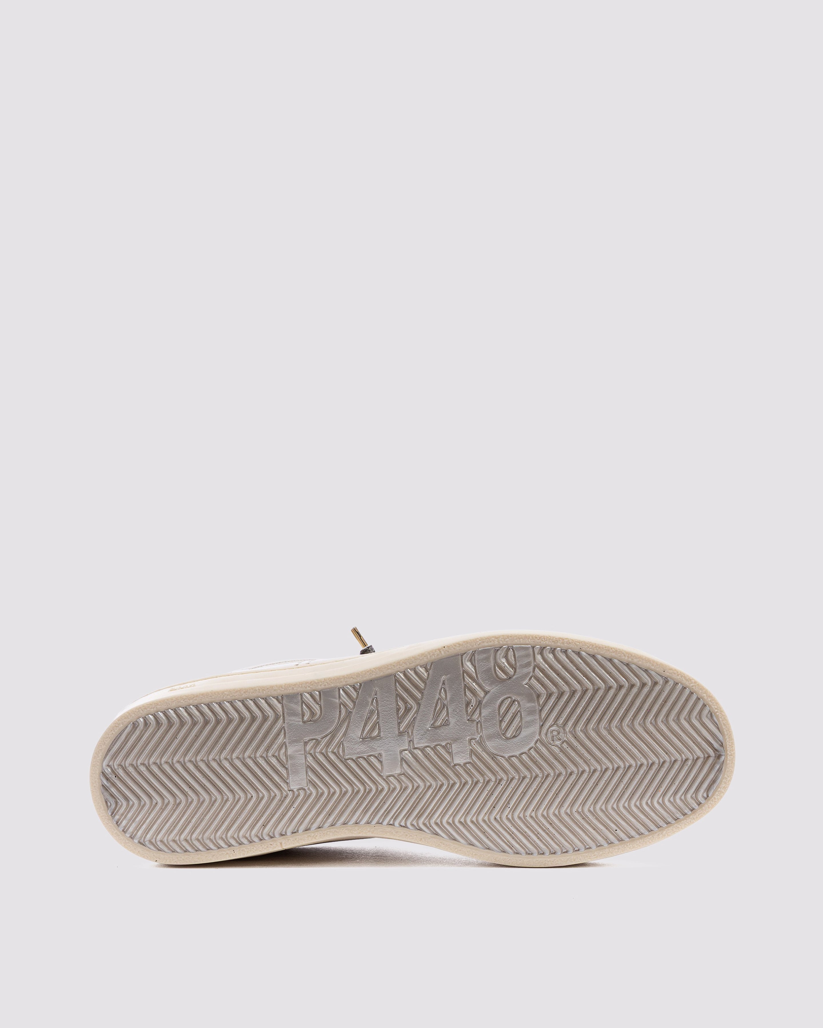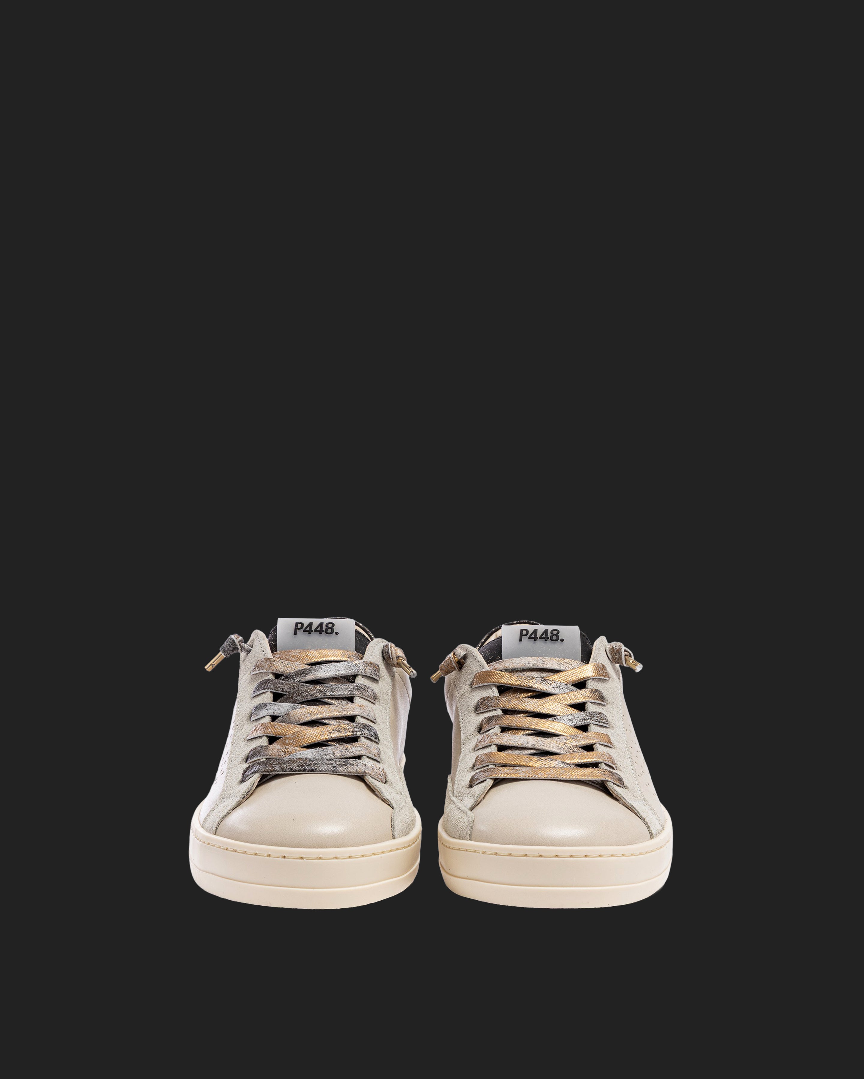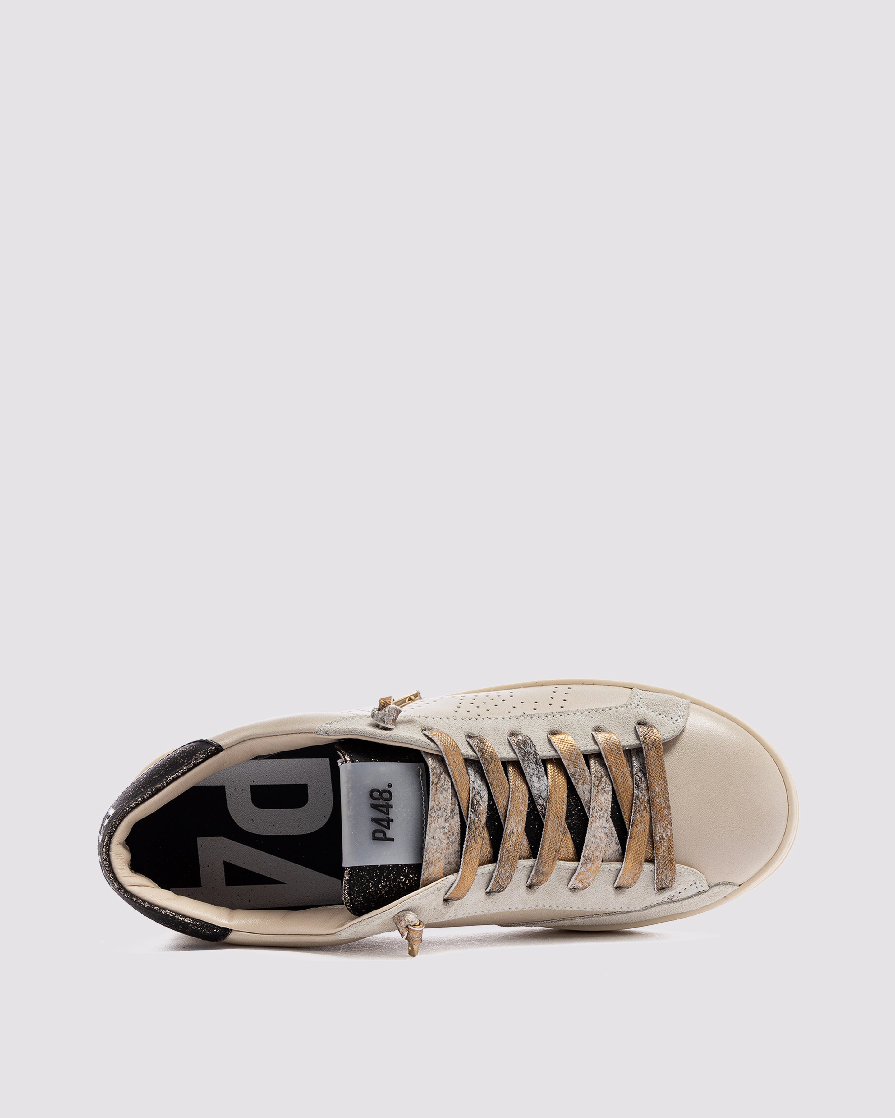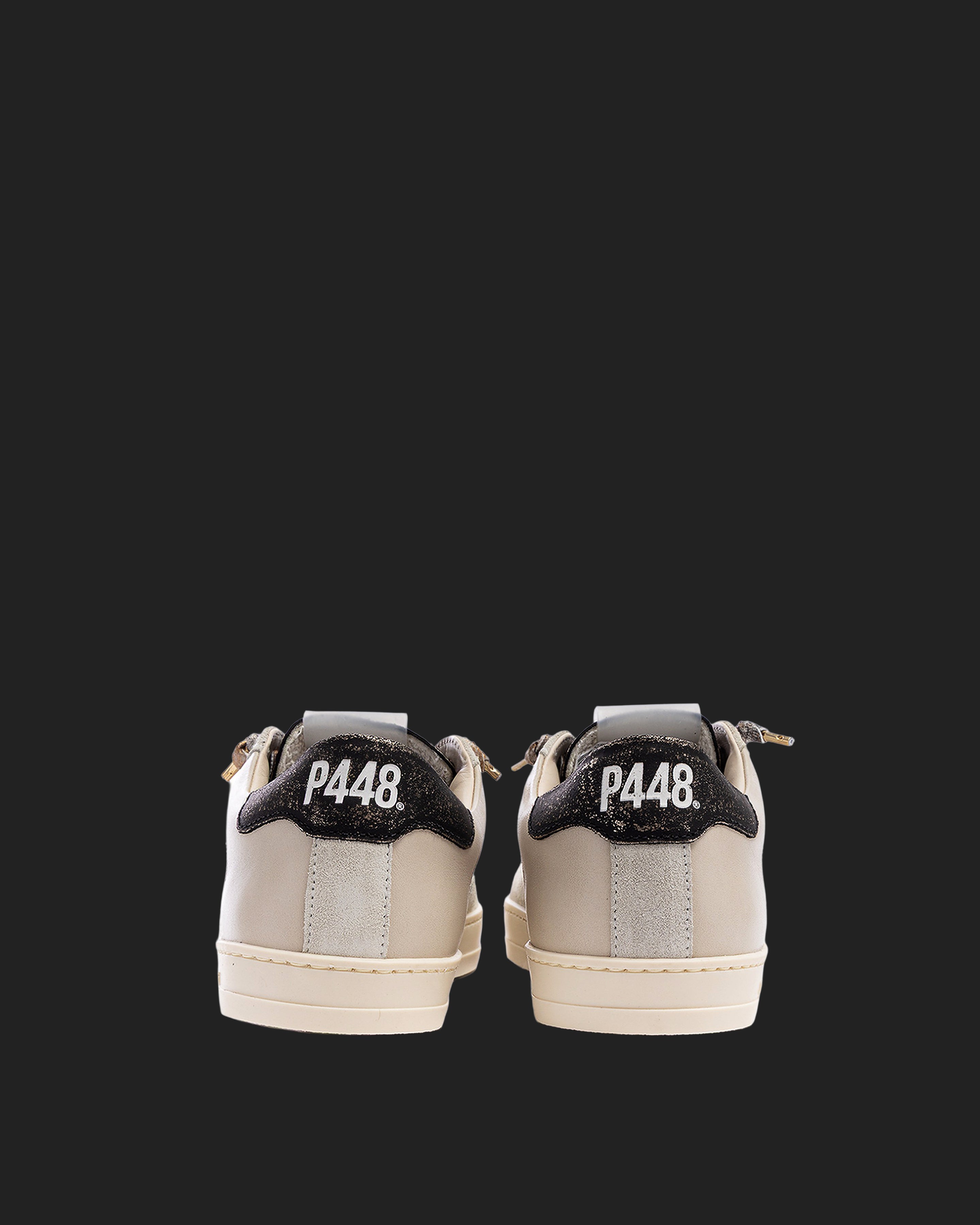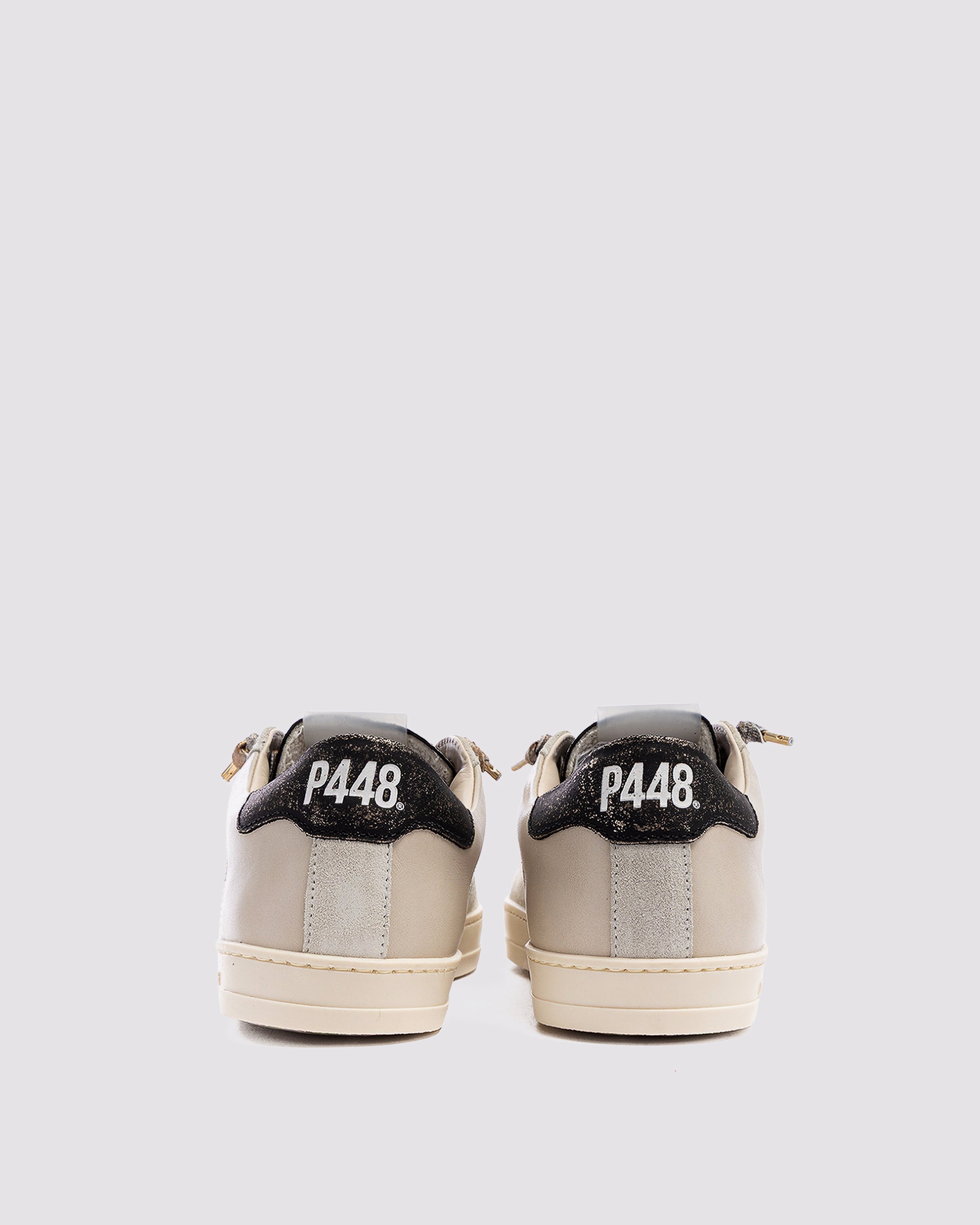 The John Panna is wrapped in cream leather accented by a black metallic leather tongue and heel tab and matching multi-color laces with gold metallic tips. Our signature P448 rubber sole and silver tread finish off the look. Swap in the extra pair of white laces to tie it all together.