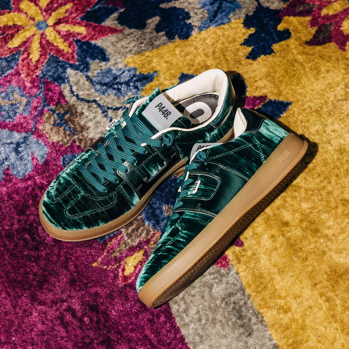 The Monza Velvet/Green features all-over dark green velvet complemented by a dark green metallic heel tab and tongue. Dark green laces and our signature P448 amber gum soles finish off the look.