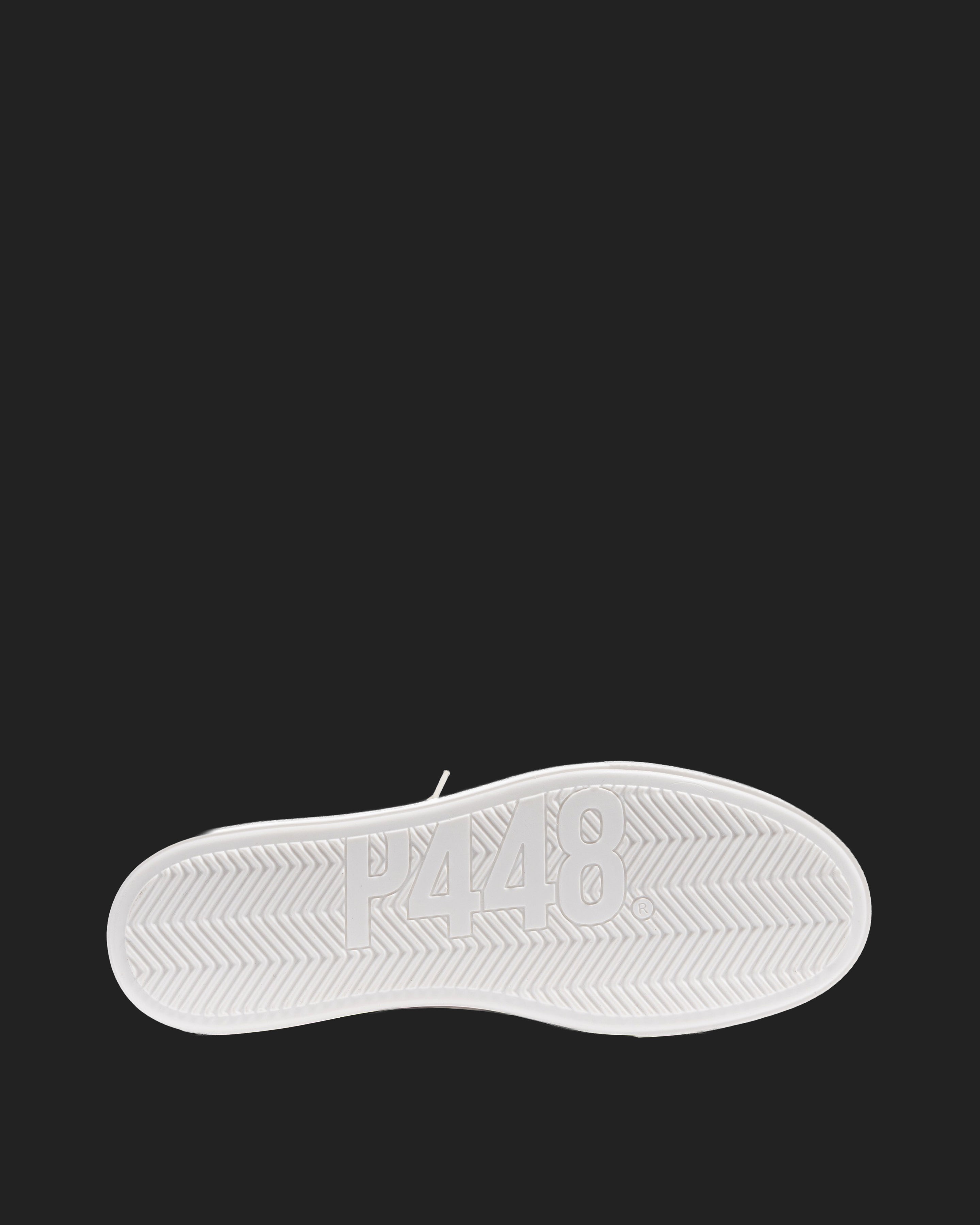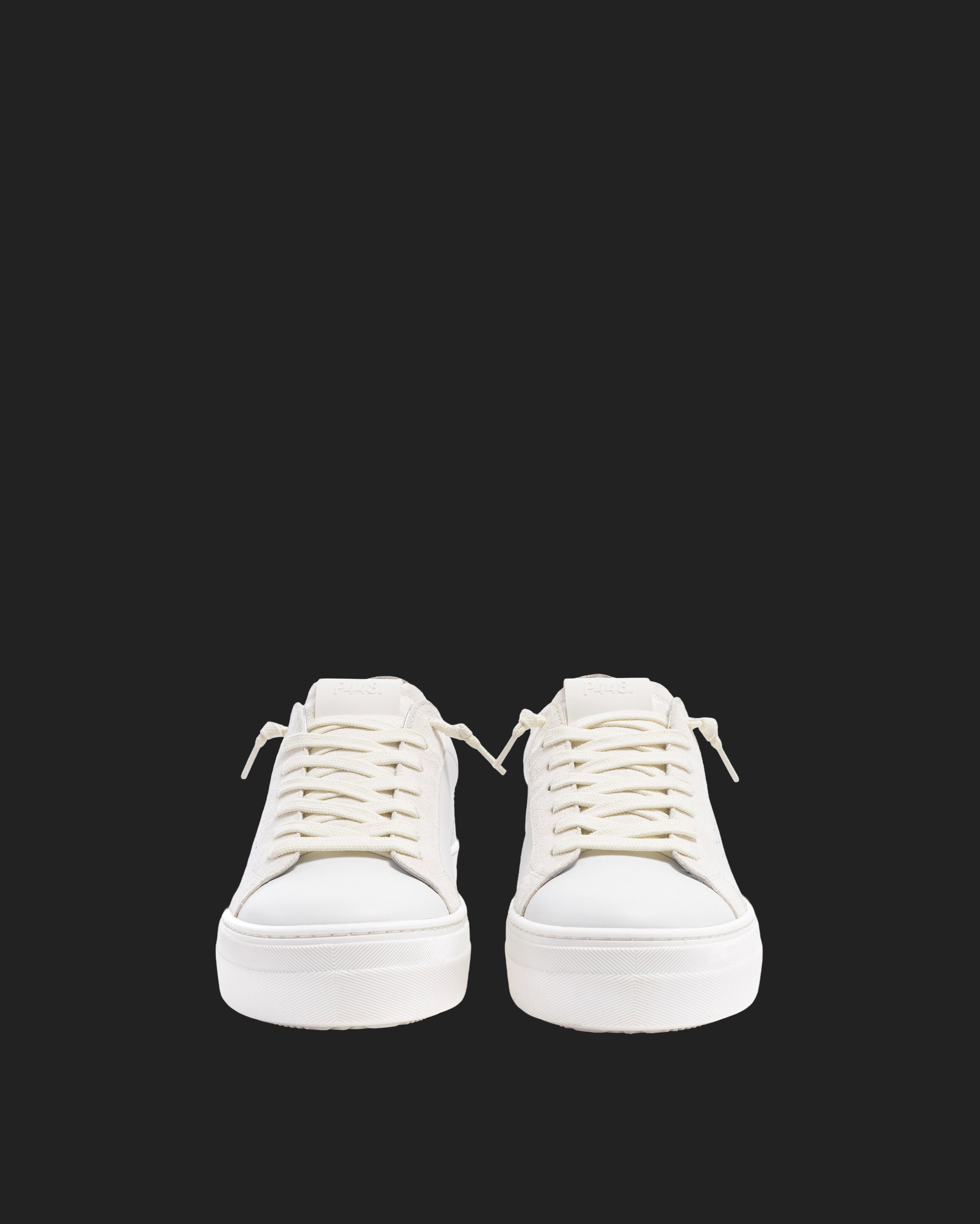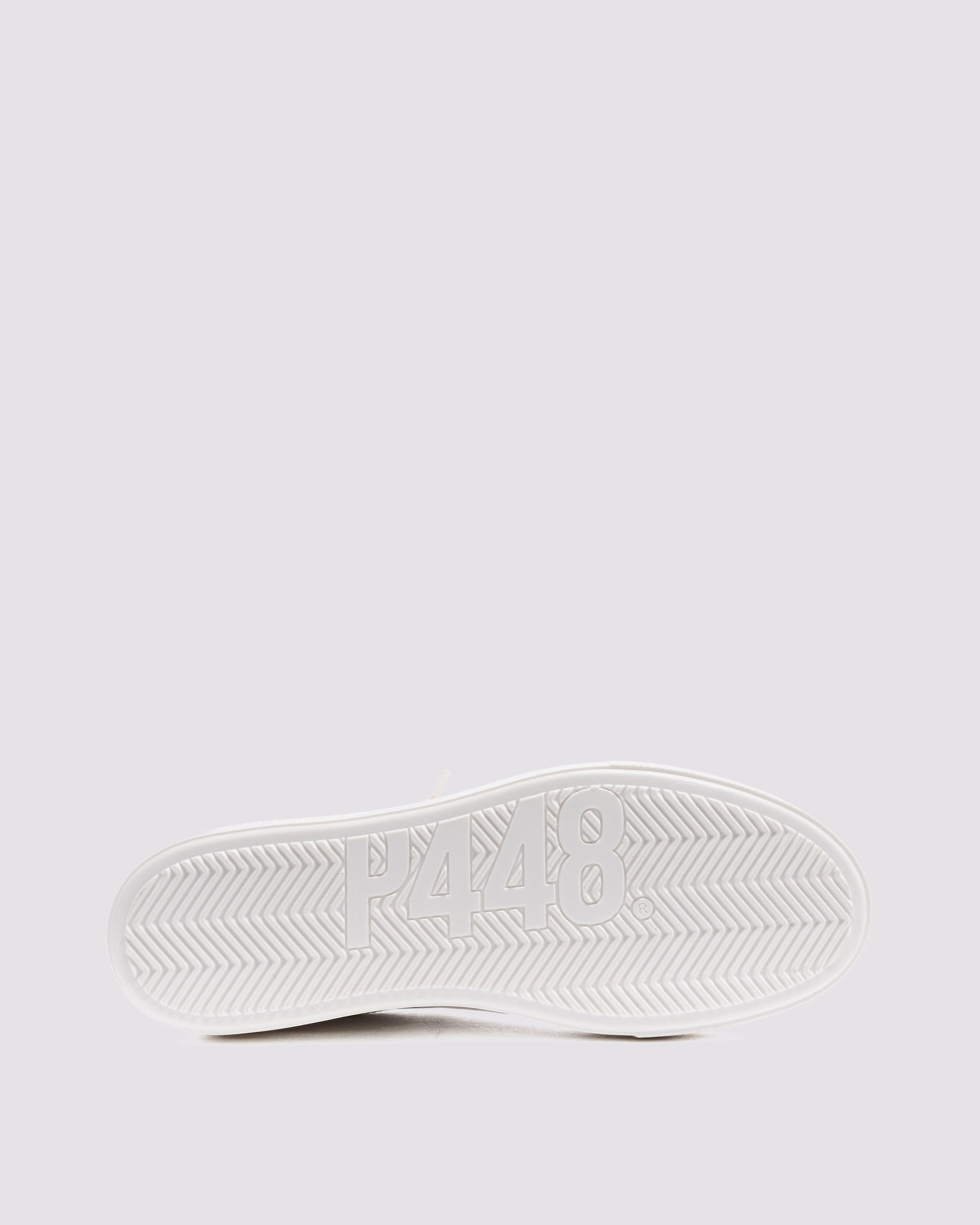 The Thea Flok/White features a white leather upper with a perforated P448 logo, complemented by off-white suede trims and tongue. A beige sparkling suede heel tab and ivory cotton laces complete the look, grounded by our signature P448 platform rubber soles with white treads.