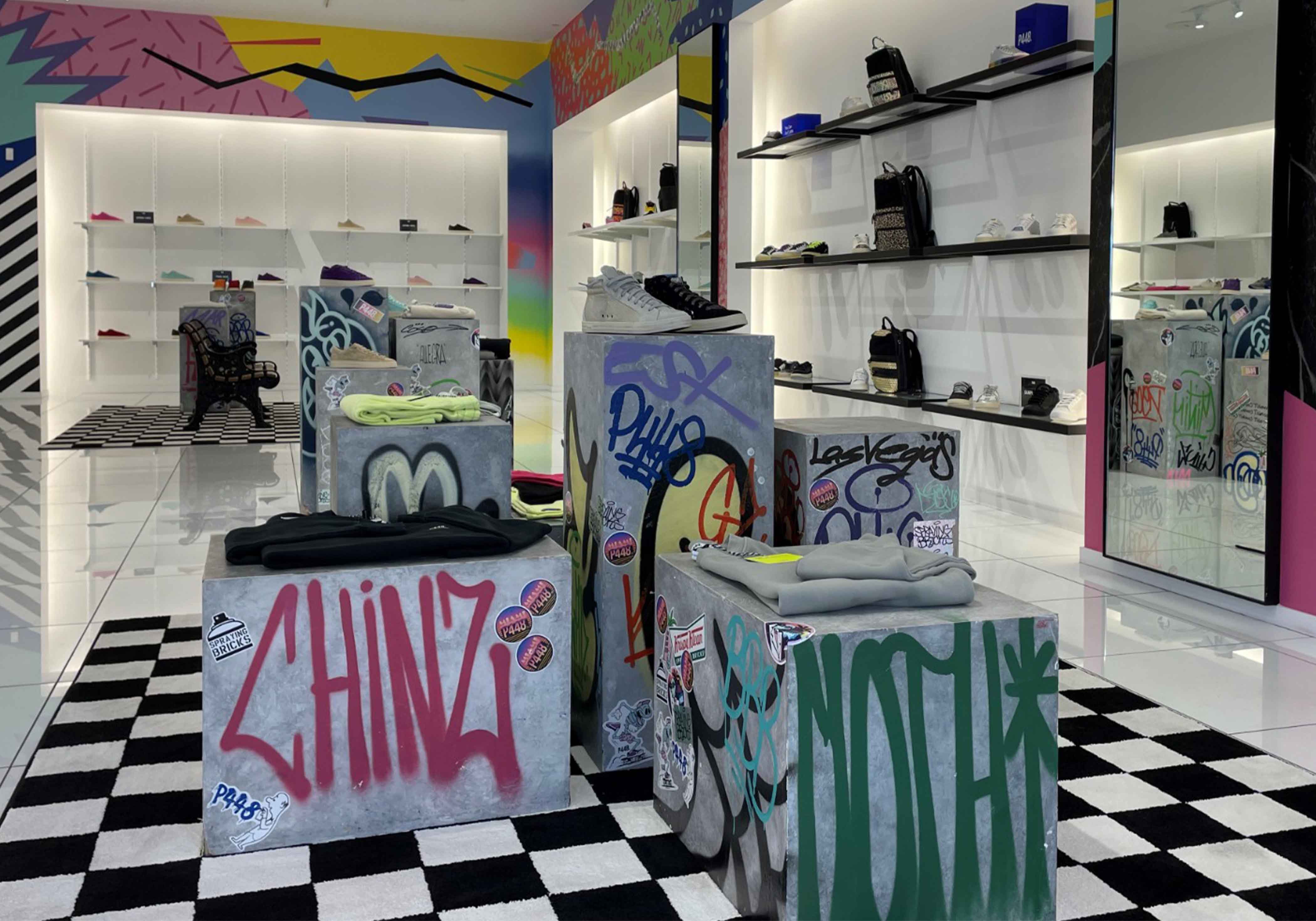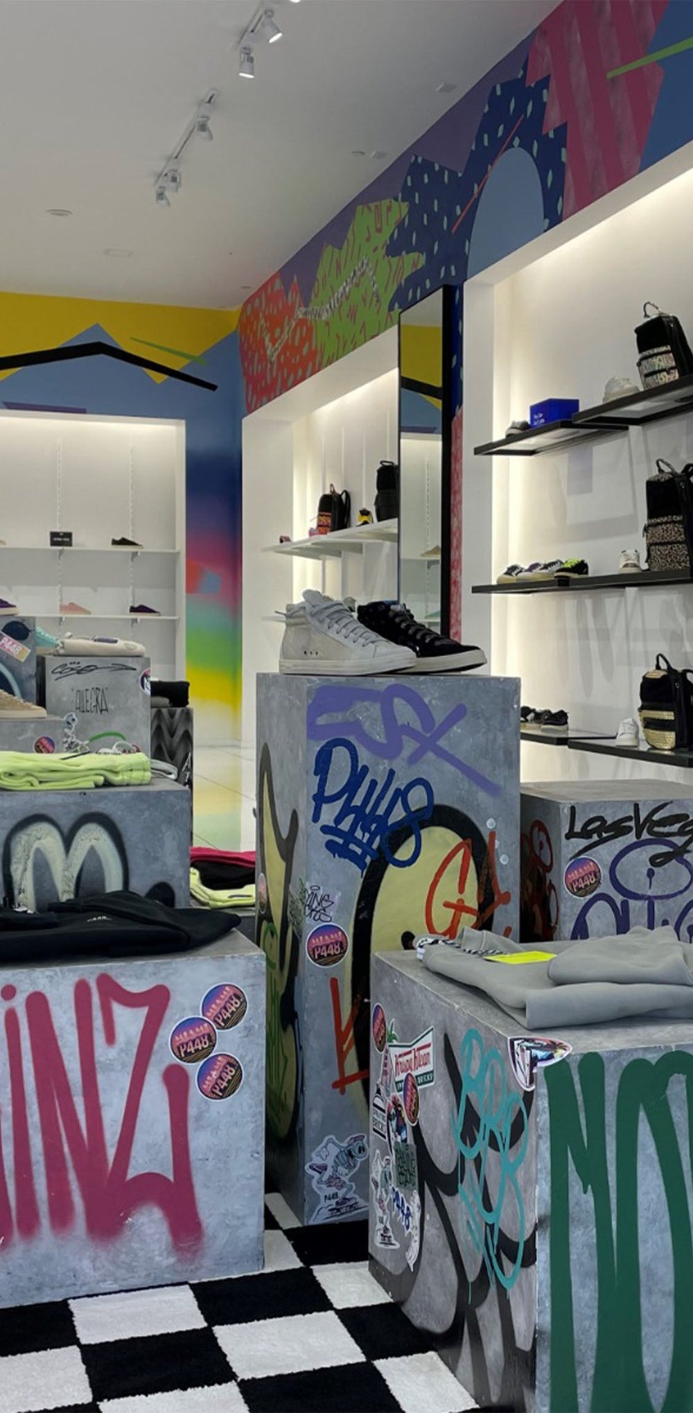Non appena entri nel nostro vivace negozio, ti immergi immediatamente in murales e installazioni artistiche. Le opere d'arte dipinte a mano dall'artista Antonyo Marest avvolgono le pareti in colori inaspettati dal pavimento al soffitto, mentre i nostri caratteristici piedistalli graffiti e le pareti della galleria con display invisibile mettono in mostra le nostre ultime collezioni di sneaker, collaborazioni in edizione limitata e abbigliamento extra-morbido.