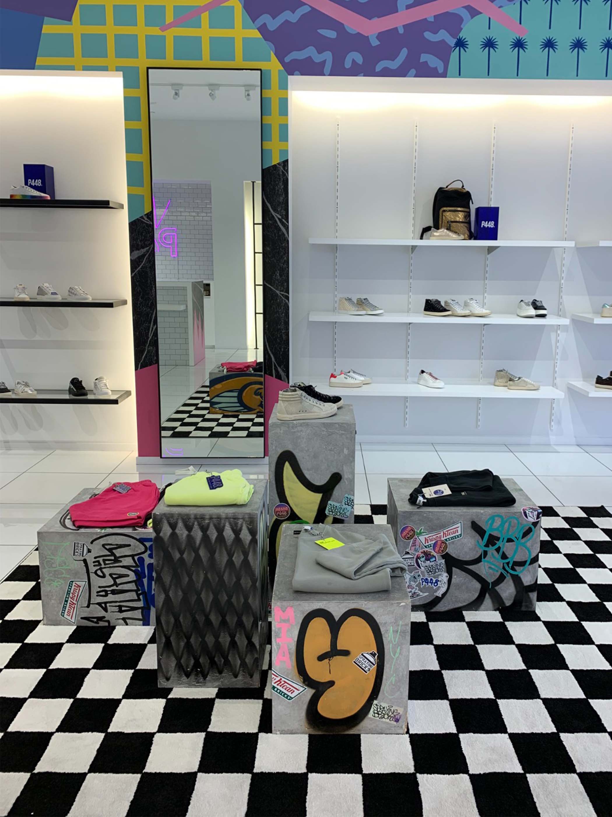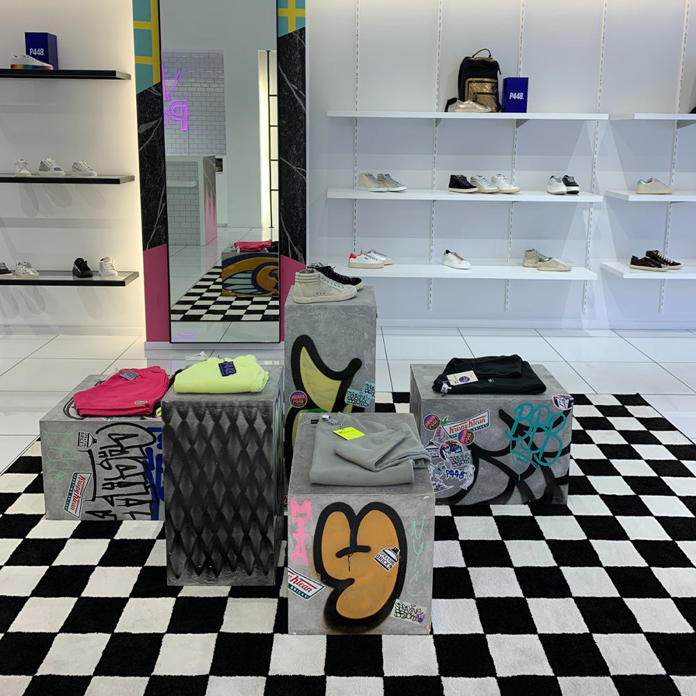 Nel negozio potresti riconoscere pezzi dei precedenti spazi P448, che rappresentano il nostro approccio sostenibile alla creazione di qualcosa di nuovo. C'è tanto spazio per esplorare, provare il tuo nuovo paio di scarpe preferite e scoprire un nuovo modo di esprimere te stesso e il tuo stile personale.