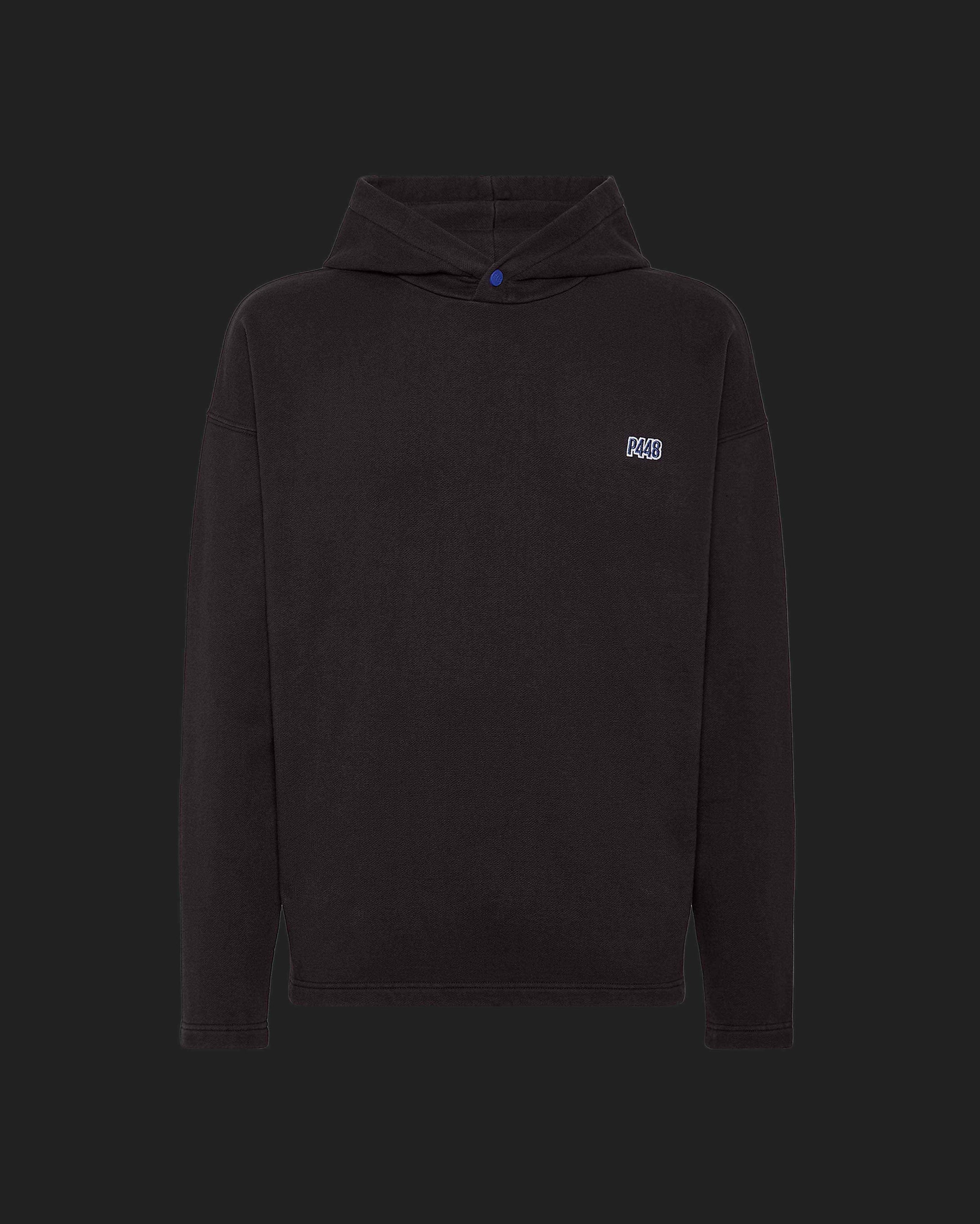 La Felpa con Cappuccio perfetta da indossare e uscire subito dopo per uno stile semplice e comodo. La nostra Felpa con Cappuccio Unisex nera presenta il logo P448 ricamato sul davanti in blu, oltre a un logo con effetto bolle di colore nero stampato sul retro. Questa felpa con cappuccio è realizzata in Italia con 100% cotone biologico per una sensazione extra morbida.