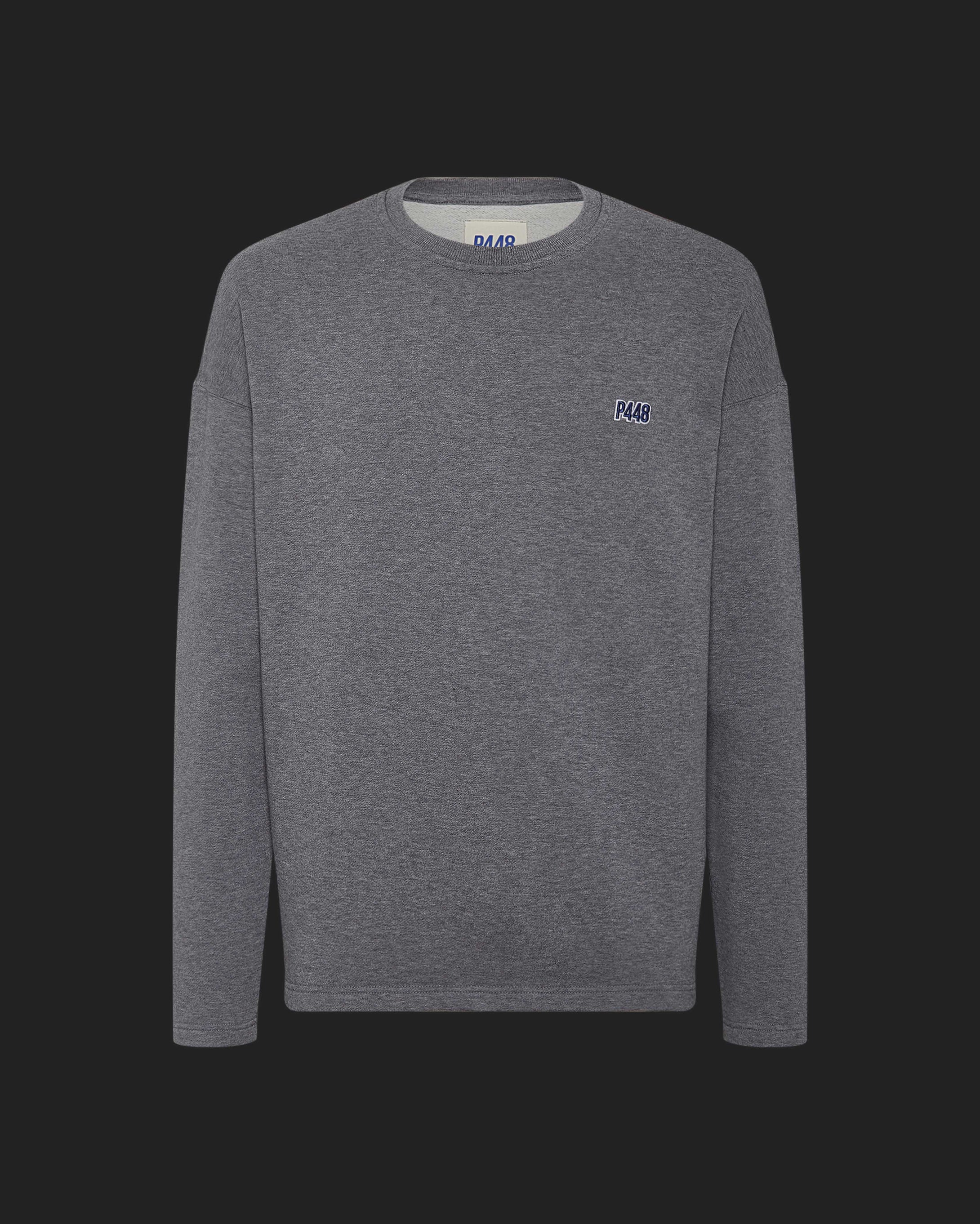 Il comfort incontra lo stile con questa felpa per tutti i giorni, perfetta per rilassarsi a casa o per un look fuori ufficio. La nostra felpa Unisex in grigio presenta il logo P448 ricamato sul davanti in blu, oltre a un logo con effetto bolle di colore grigio stampato sul retro. Questa felpa è realizzata in Italia con 100% cotone biologico per una sensazione extra morbida.