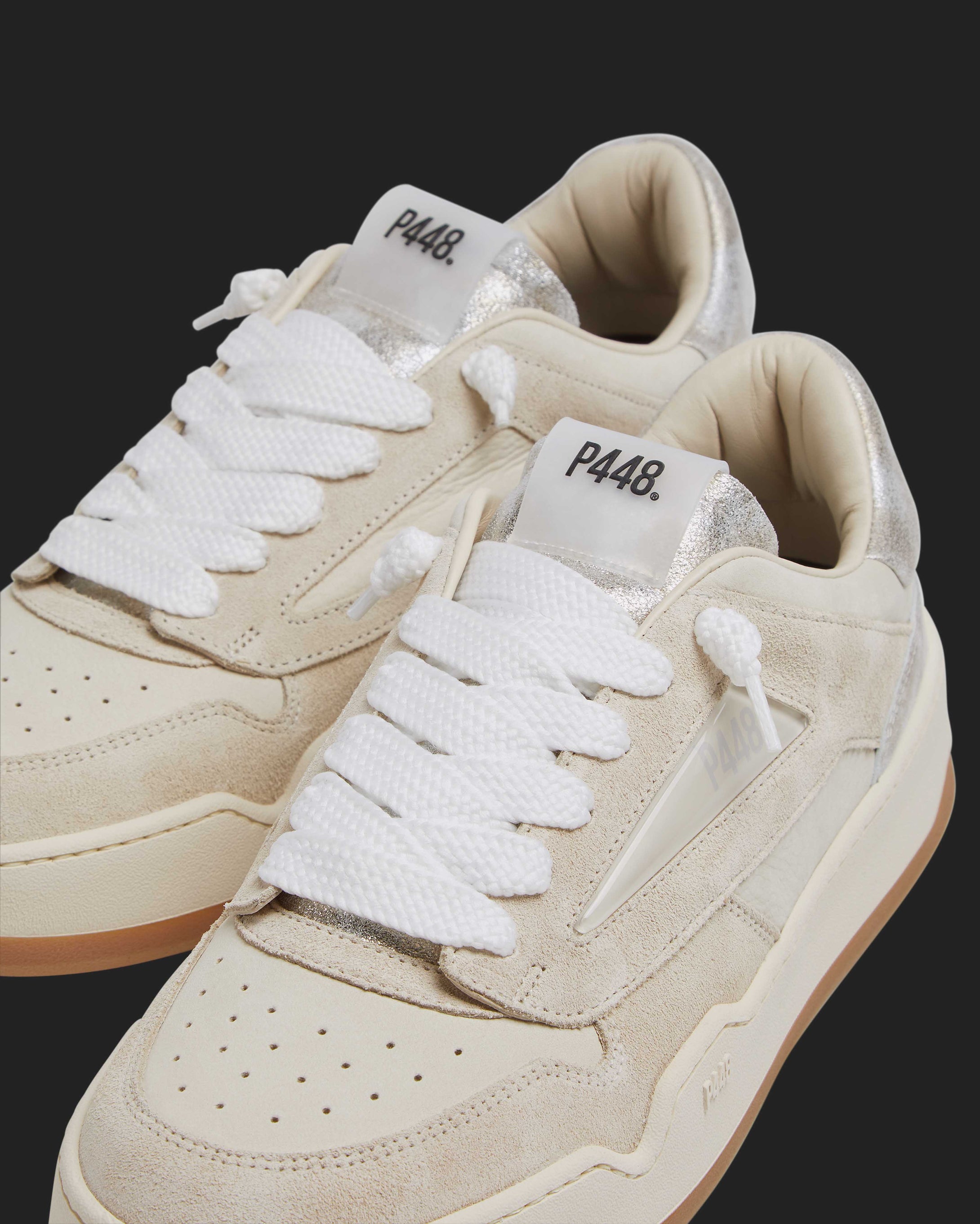 Le Brixton Metallico presentano un design interamente in suede beige e nabuk color crema, impreziosito da una linguetta e un talloncino in pelle argento e oro con dettagli vintage. I lacci bianchi e la nostra esclusiva suola in gomma P448, con battistrada color ambra a contrasto, completano il look.