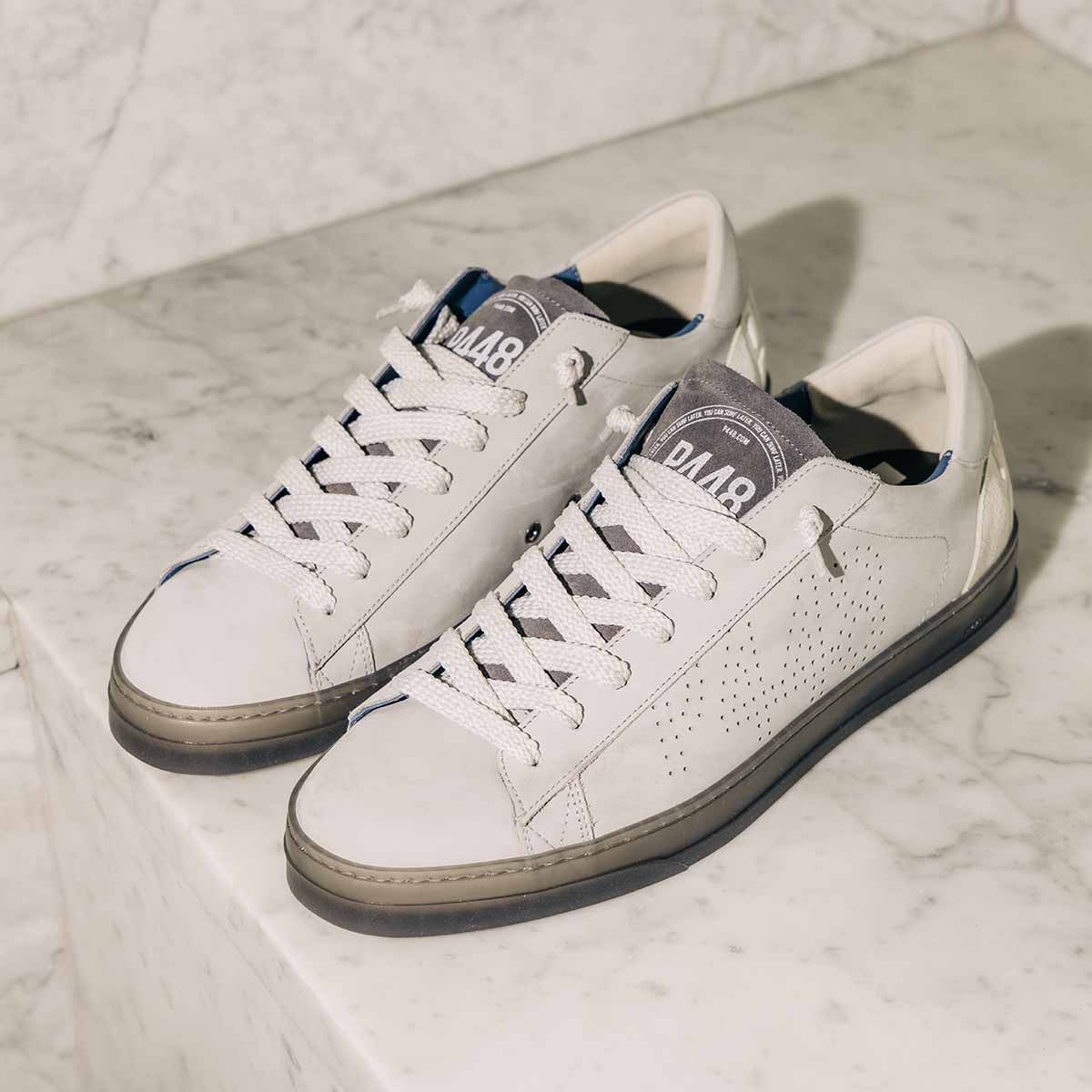 La Jack Shadow è realizzata in pelle nabuk grigia e completata da una linguetta in suede grigio scuro. I lacci bianchi e argento e la nostra suola in gomma grigia trasparente P448 completano il look.