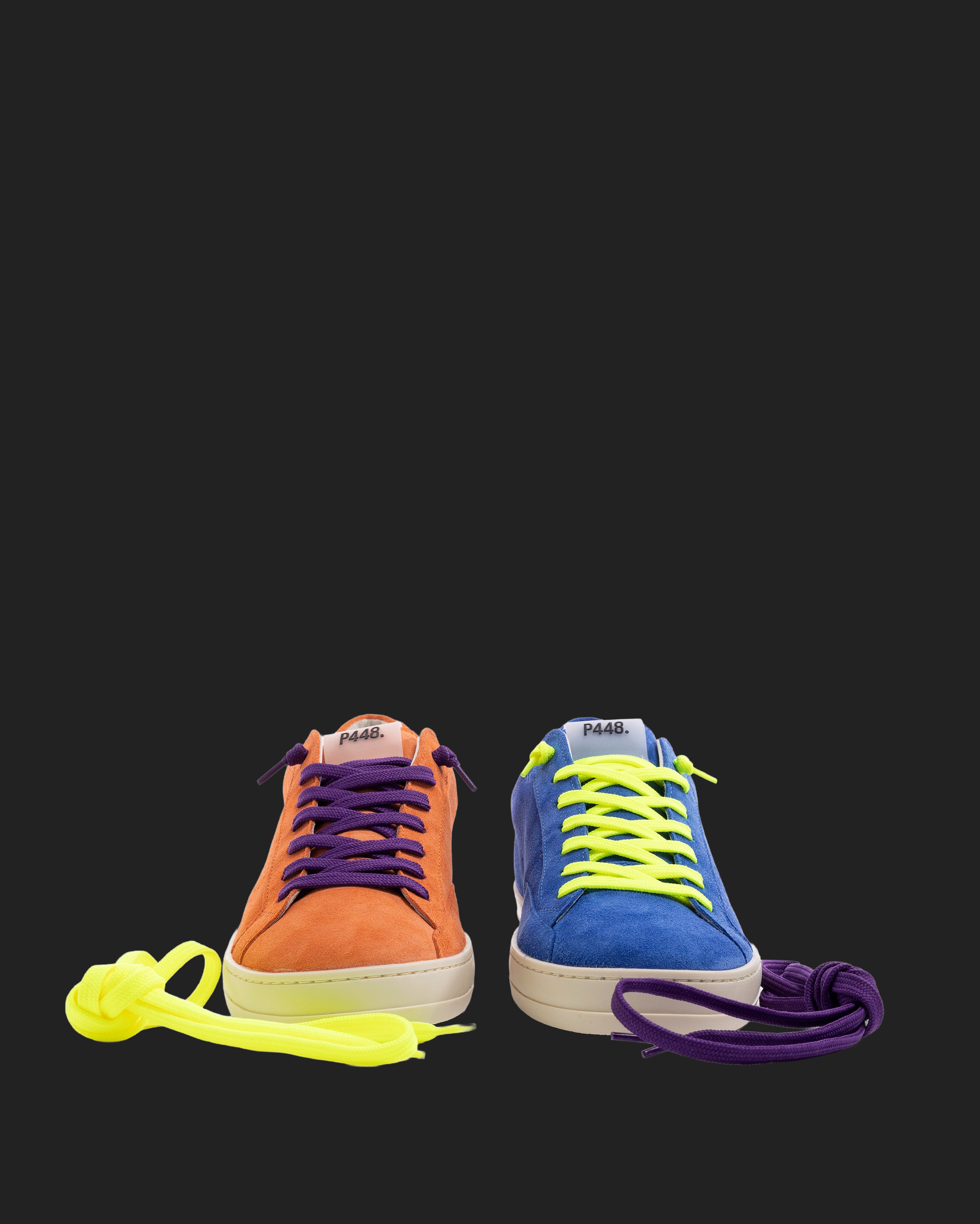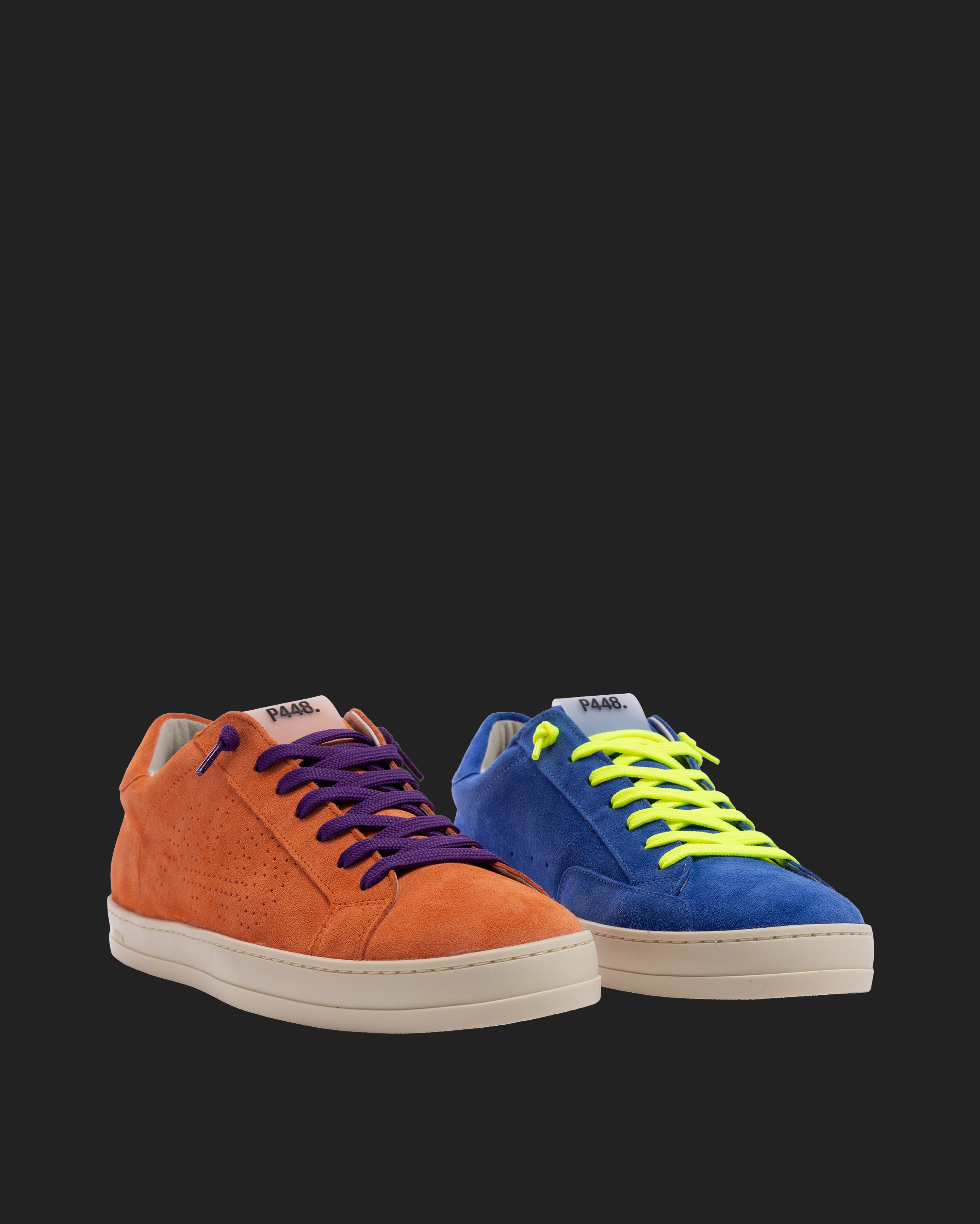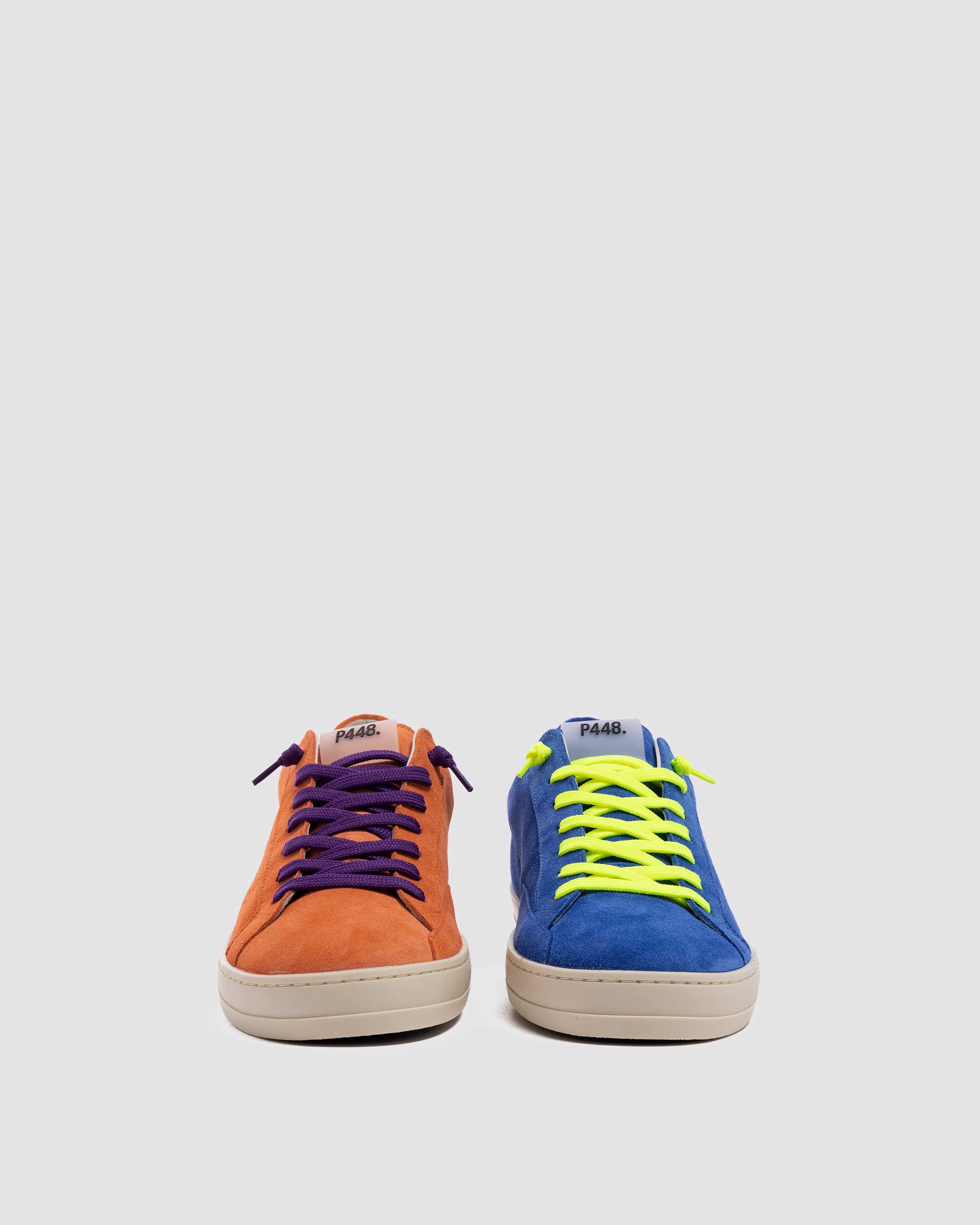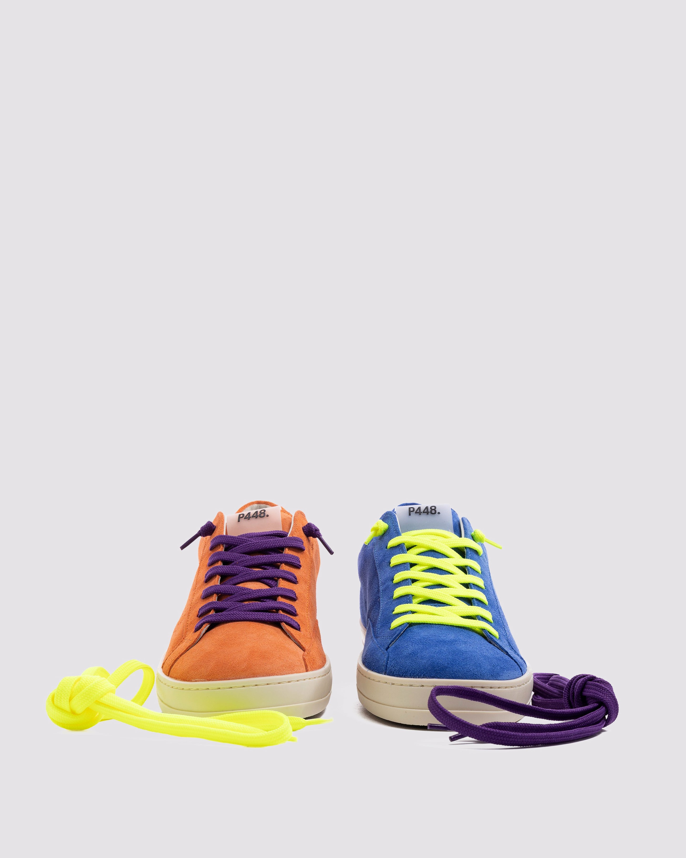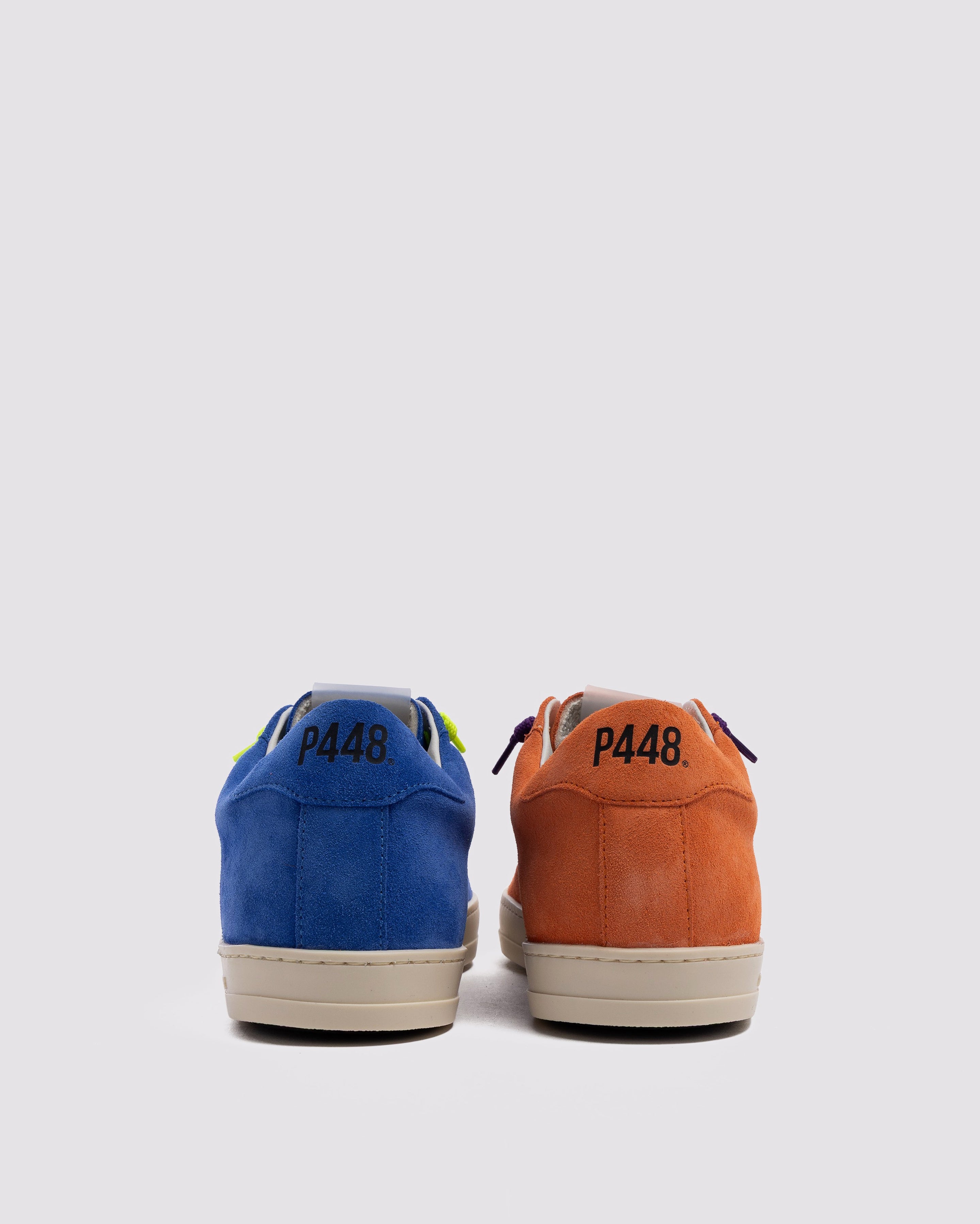 Both feature matching suede tongues, trims, toes, and heel accents. Violet laces on one and yellow laces on the other, along with our signature P448 rubber soles finished with black treads, tie it all together.