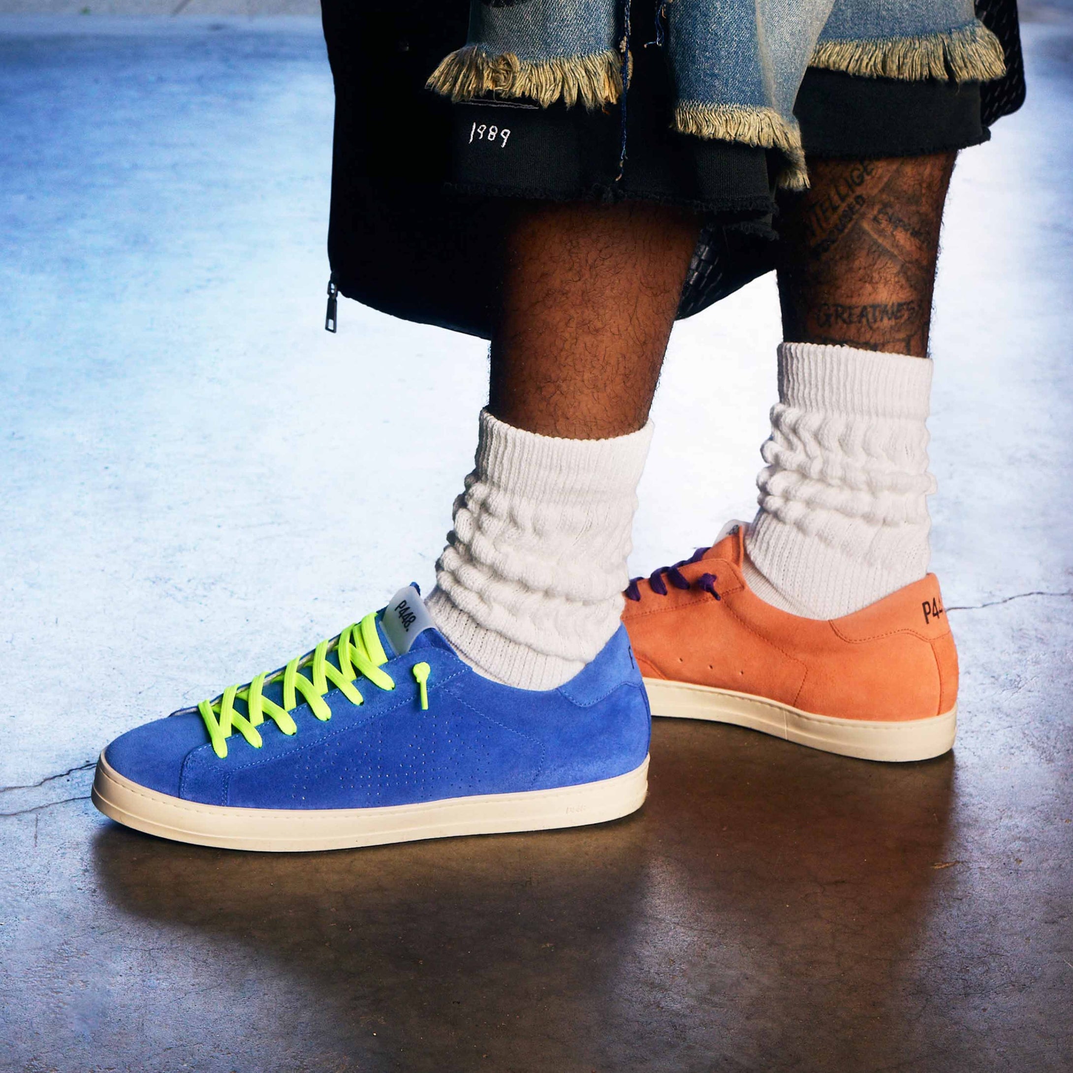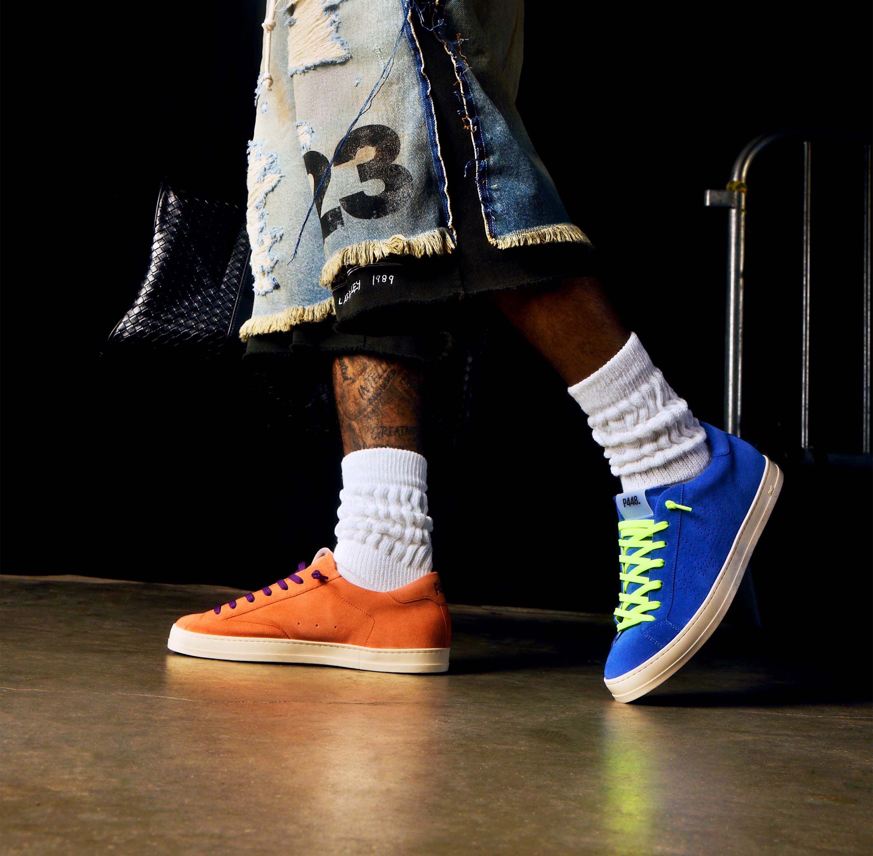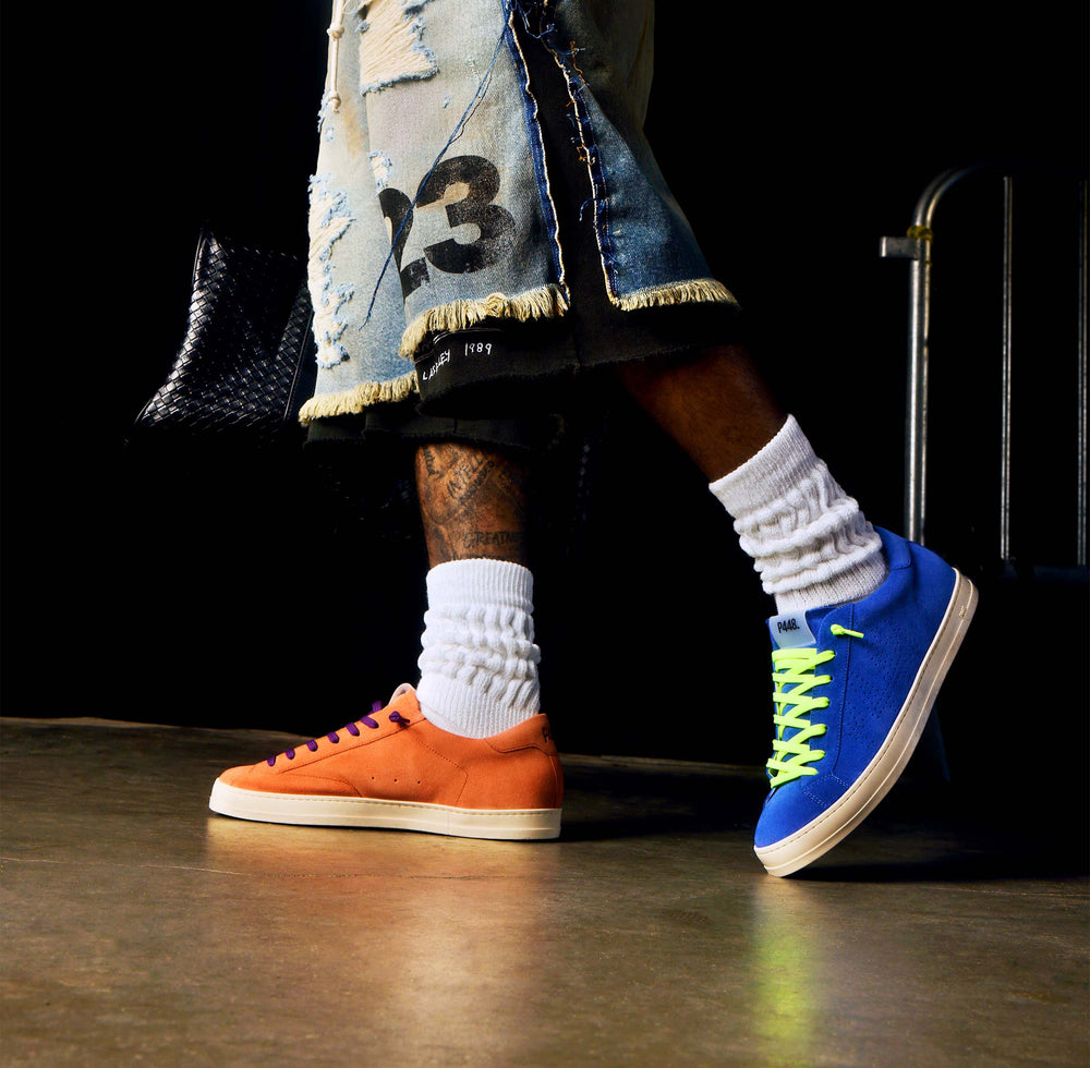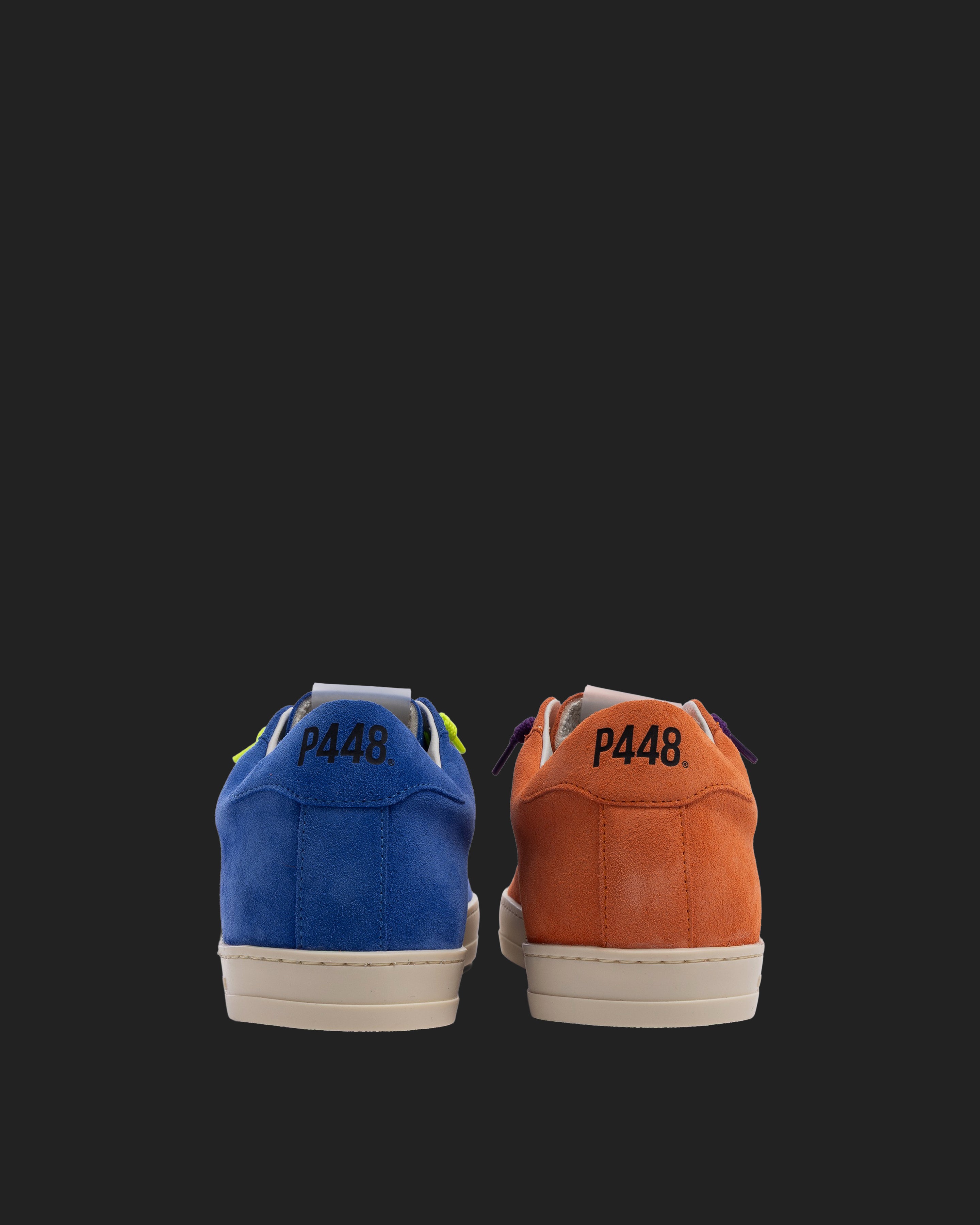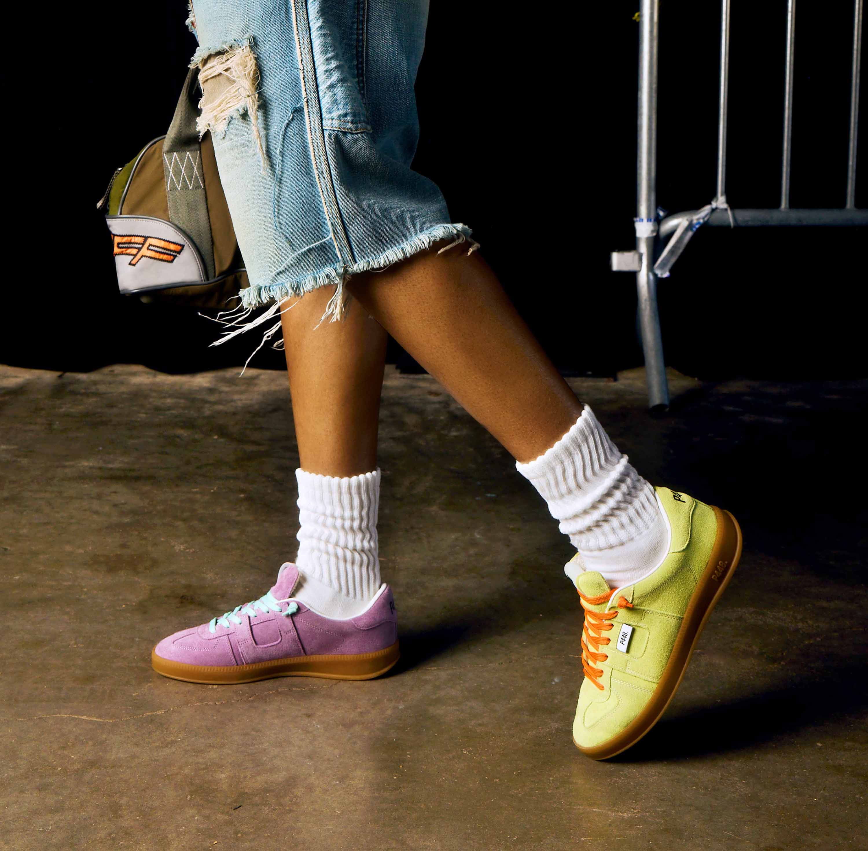 Both feature matching suede tongues, trims, toes, and heel accents. Violet laces on one and yellow laces on the other, along with our signature P448 rubber soles finished with black treads, tie it all together.