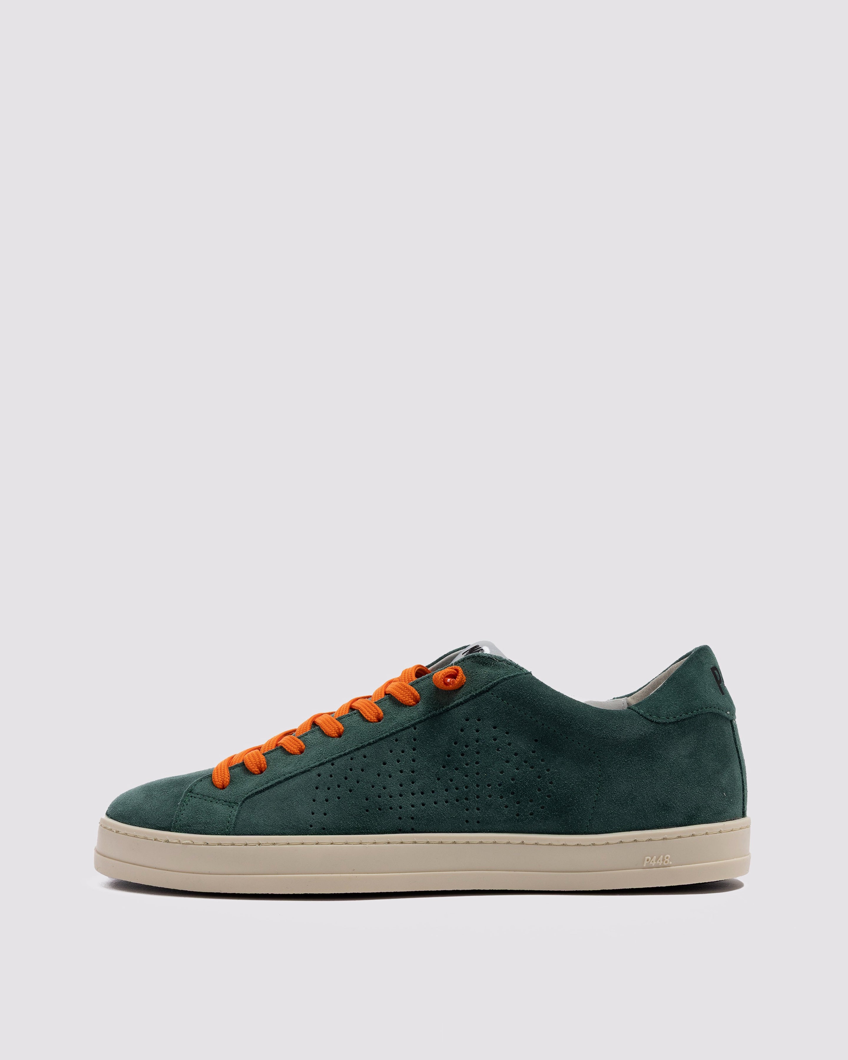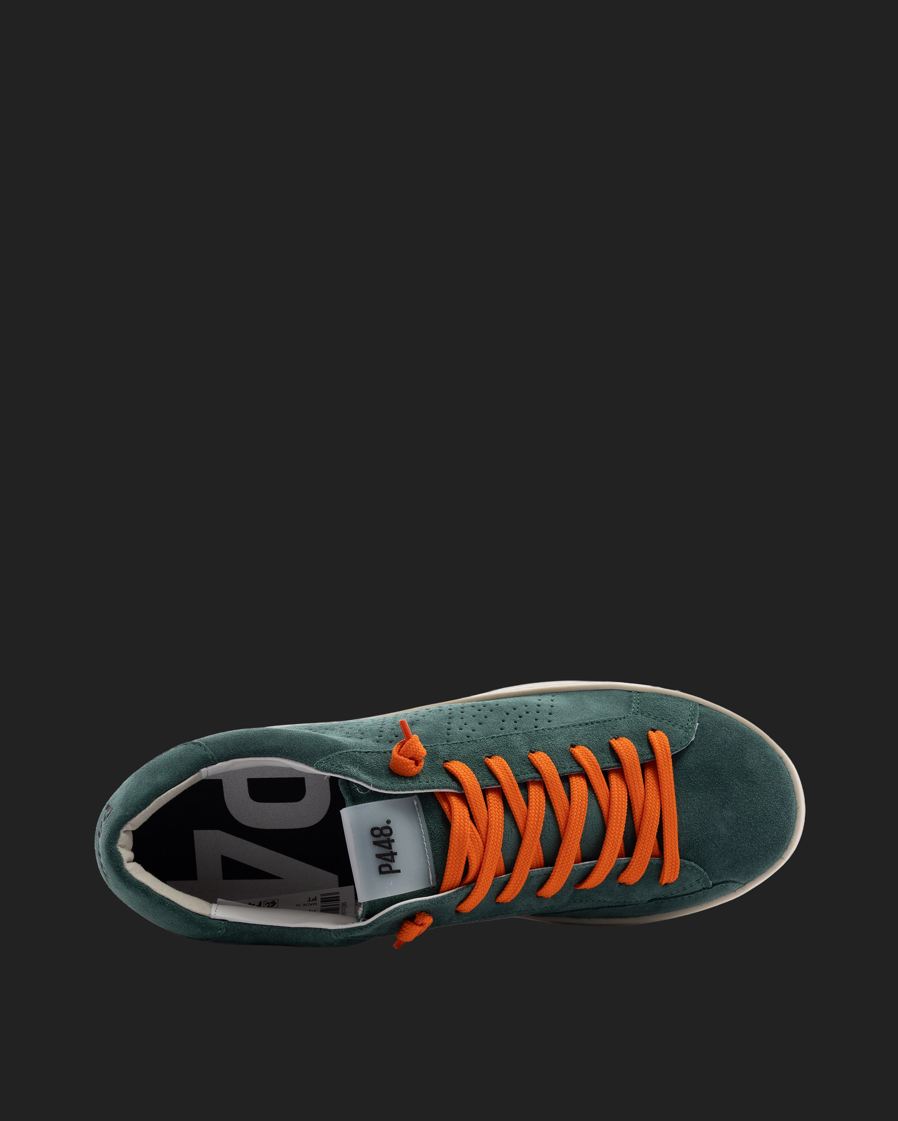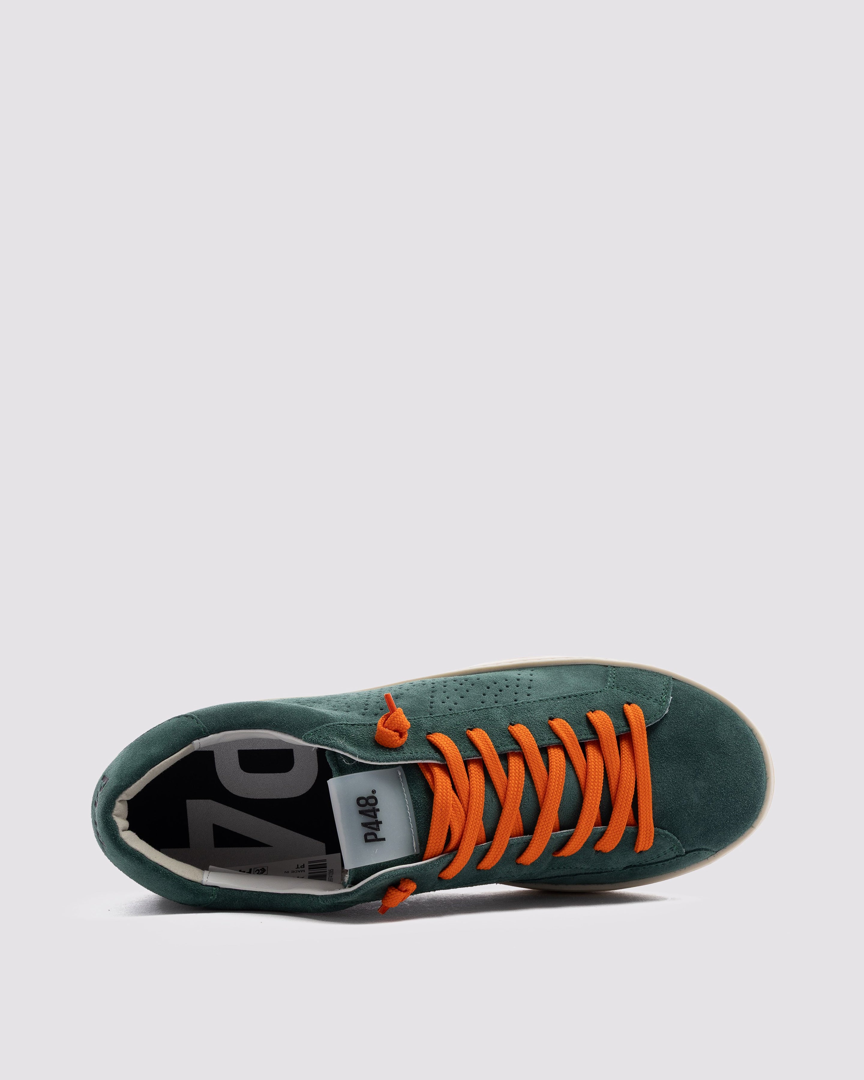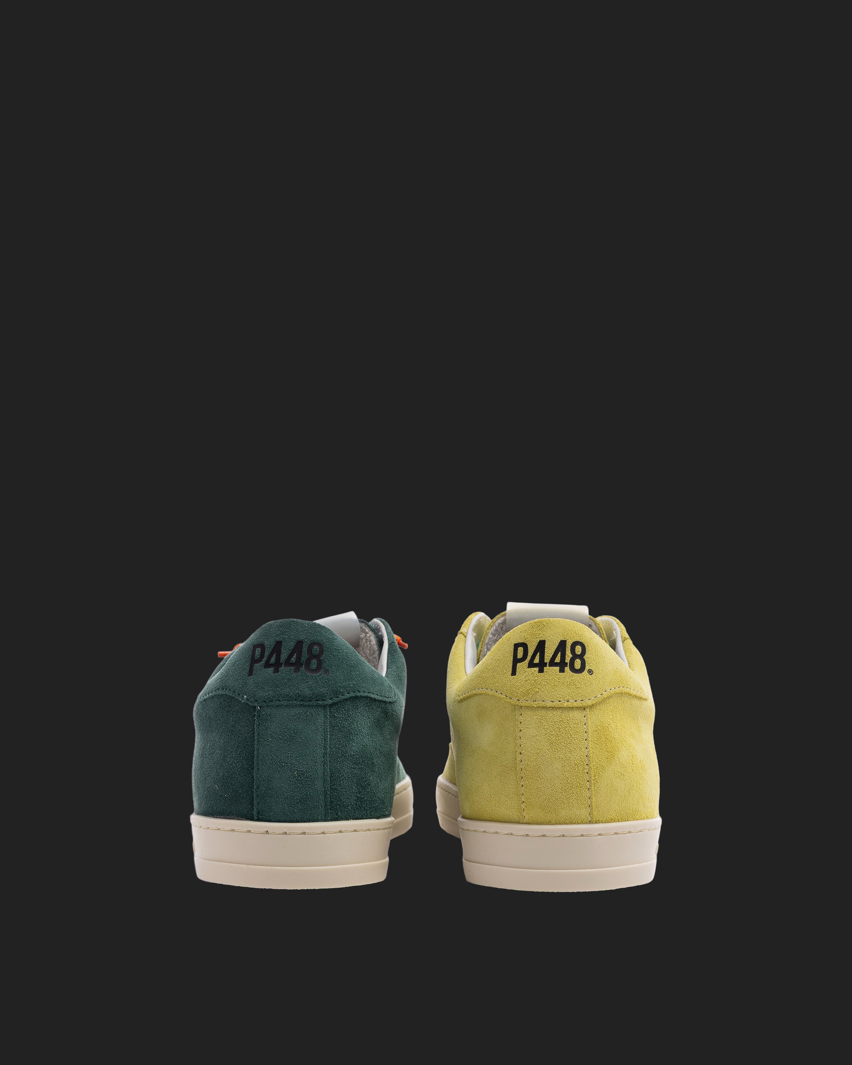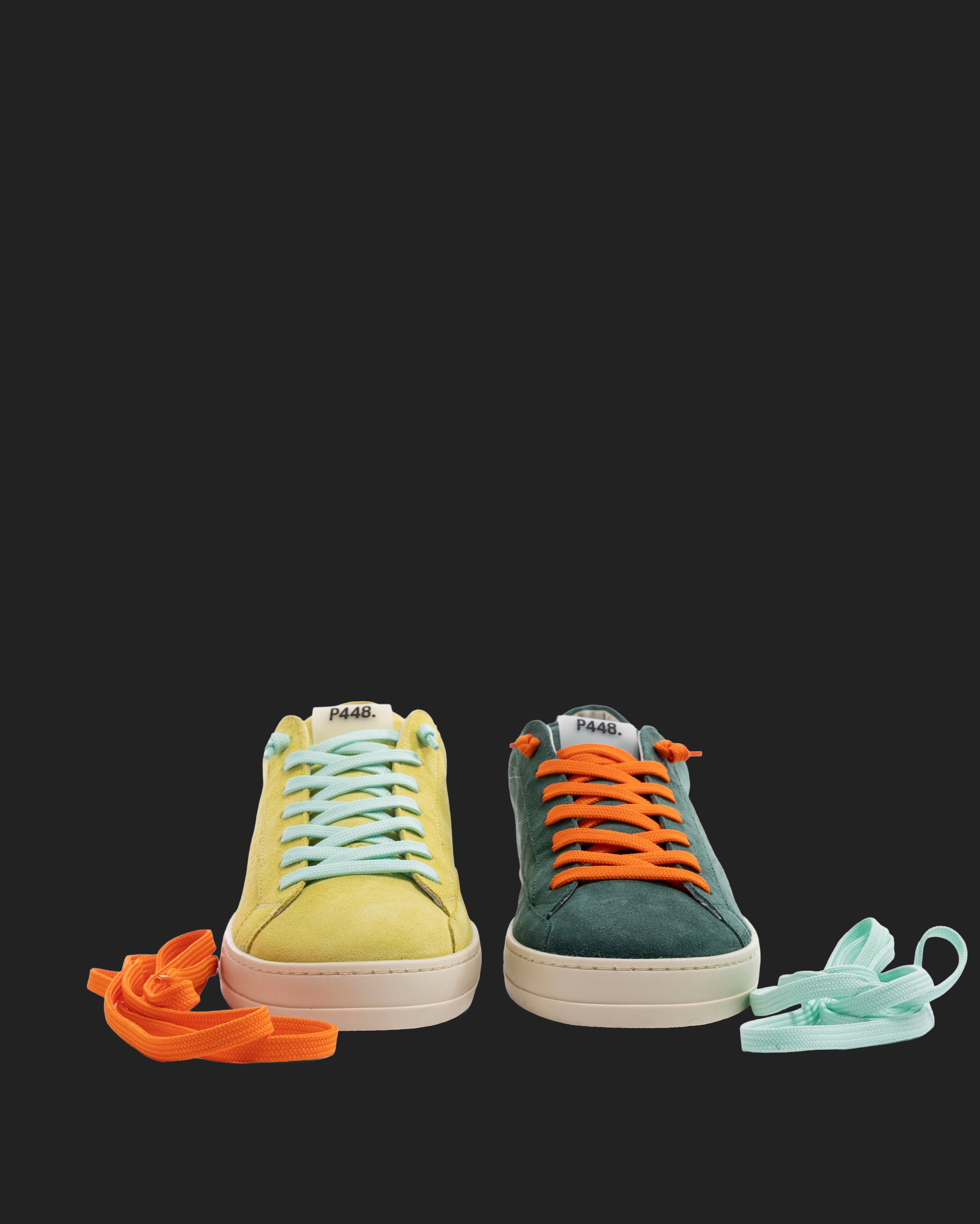 Both feature matching suede tongues, trims, toes, and heel accents. Light blue laces on one and orange laces on the other, along with our signature P448 rubber soles finished with black treads, tie it all together.