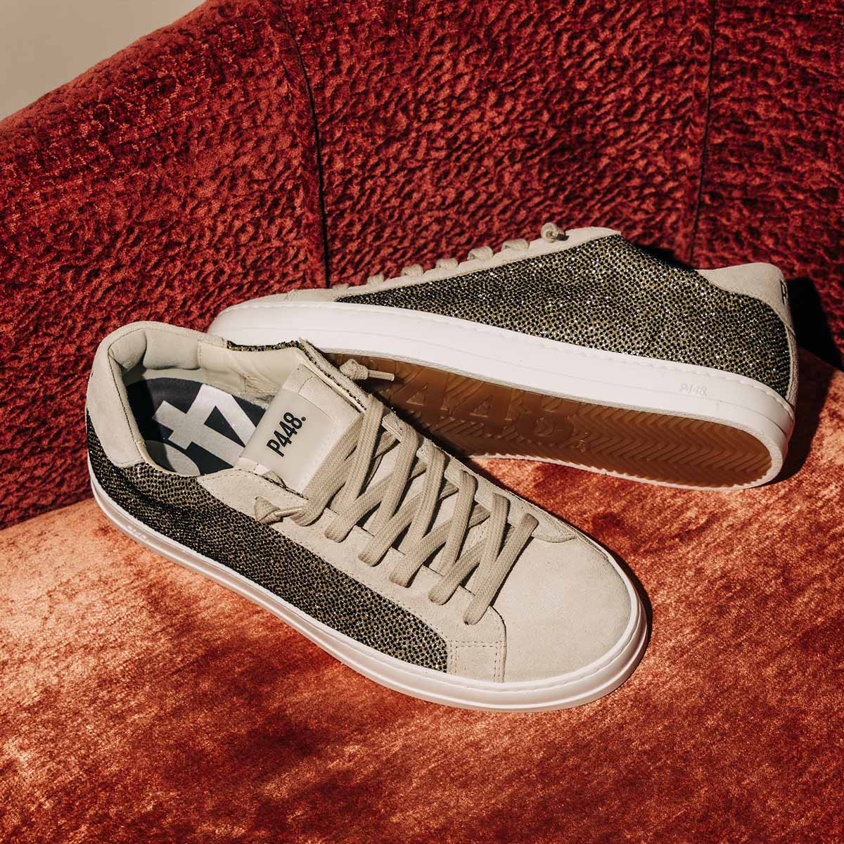 The John Felix/Gold is wrapped in black and gold dotted velvet, grounded by sand suede accents. Beige cotton laces and our signature P448 rubber soles tie it all together.