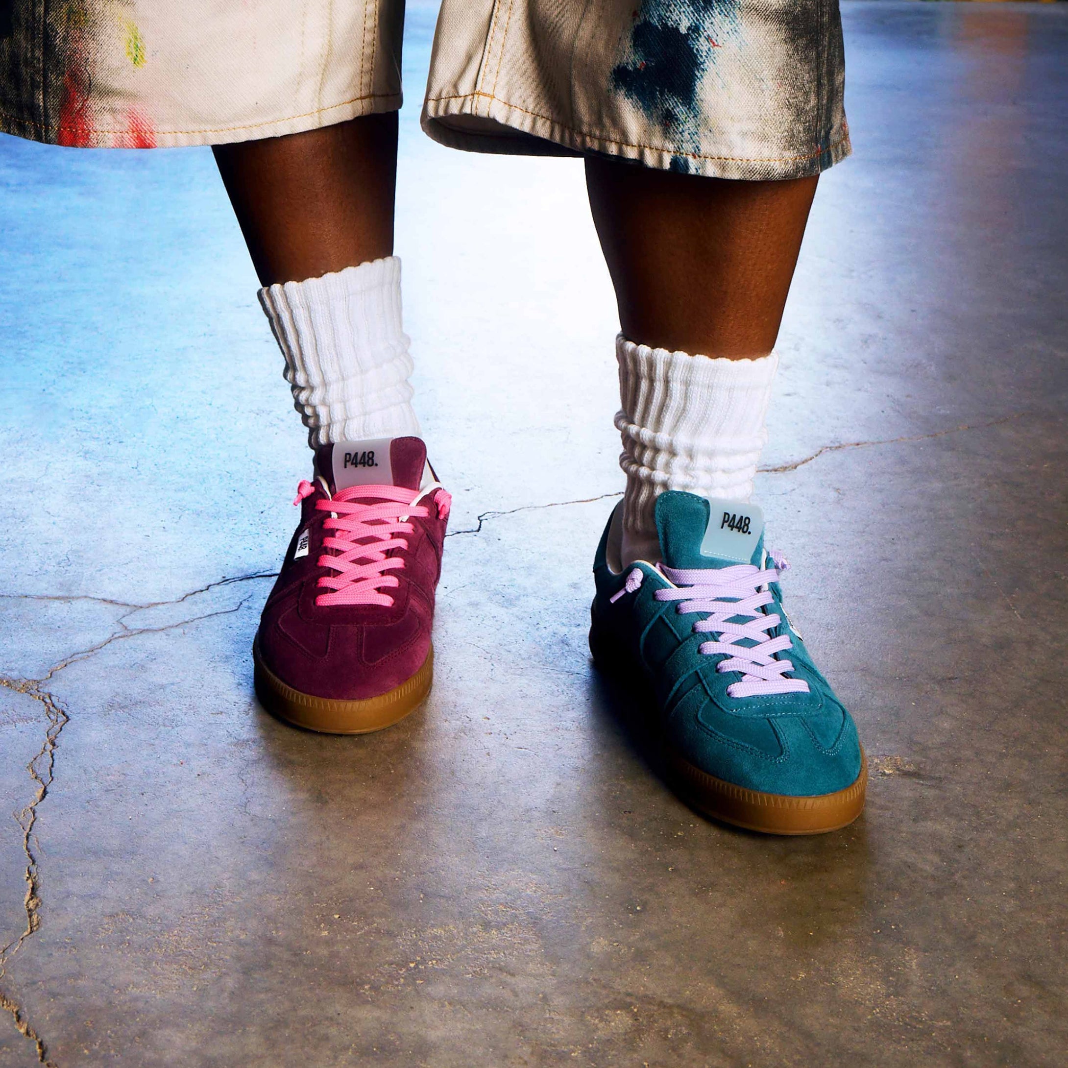 Both feature matching suede tongues, trims, toes, and heel accents. Light blue laces on one and orange laces on the other, along with our signature P448 rubber soles finished with black treads, tie it all together.