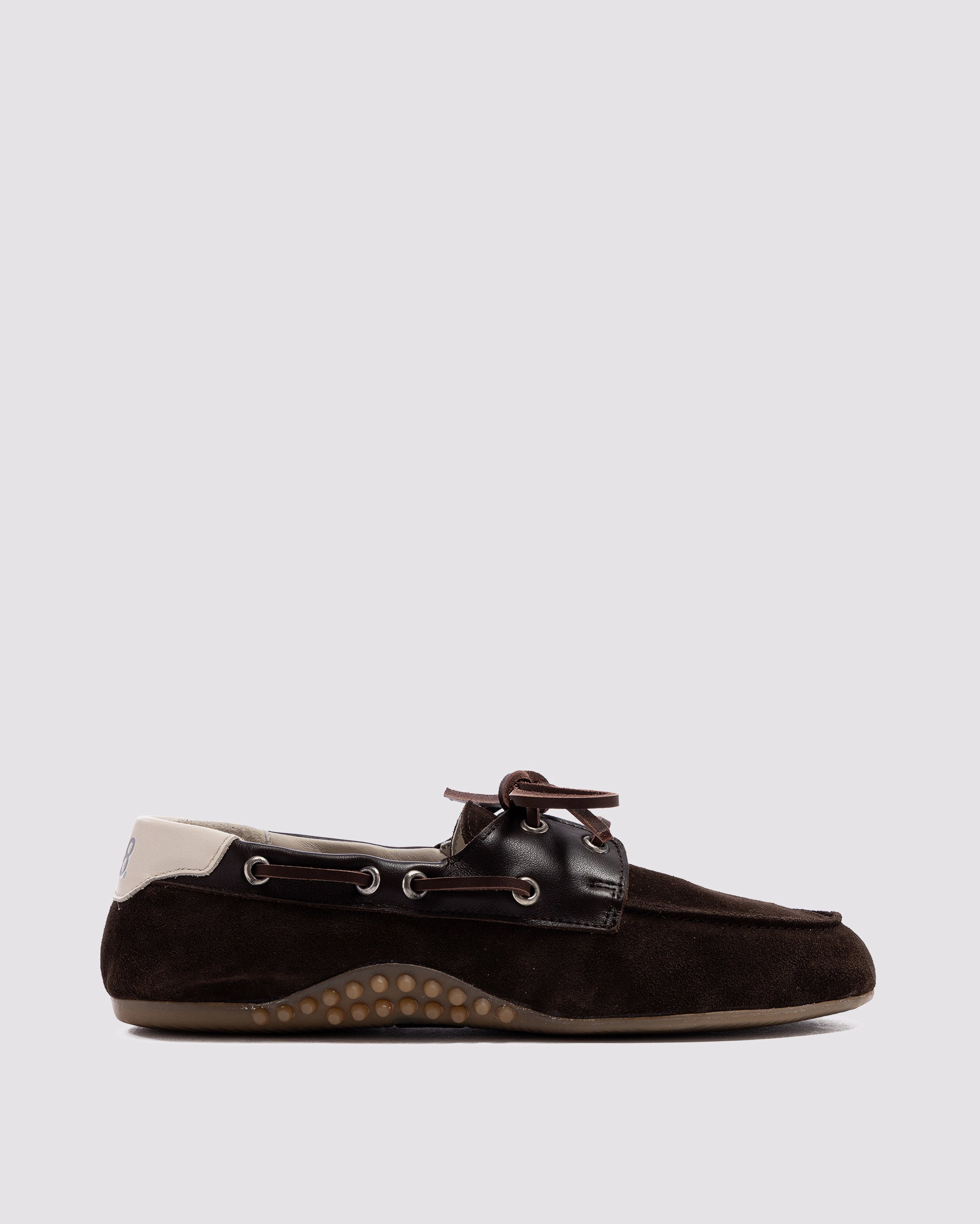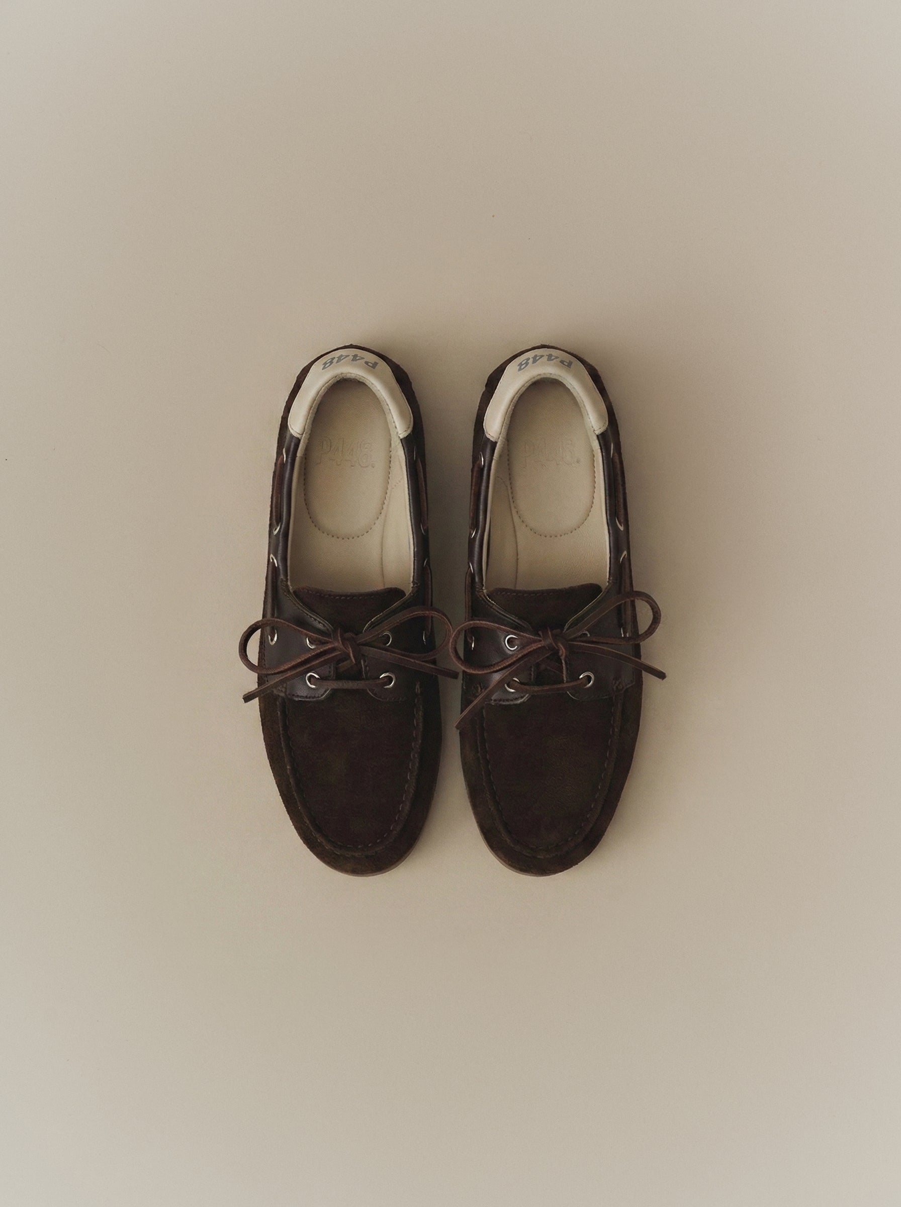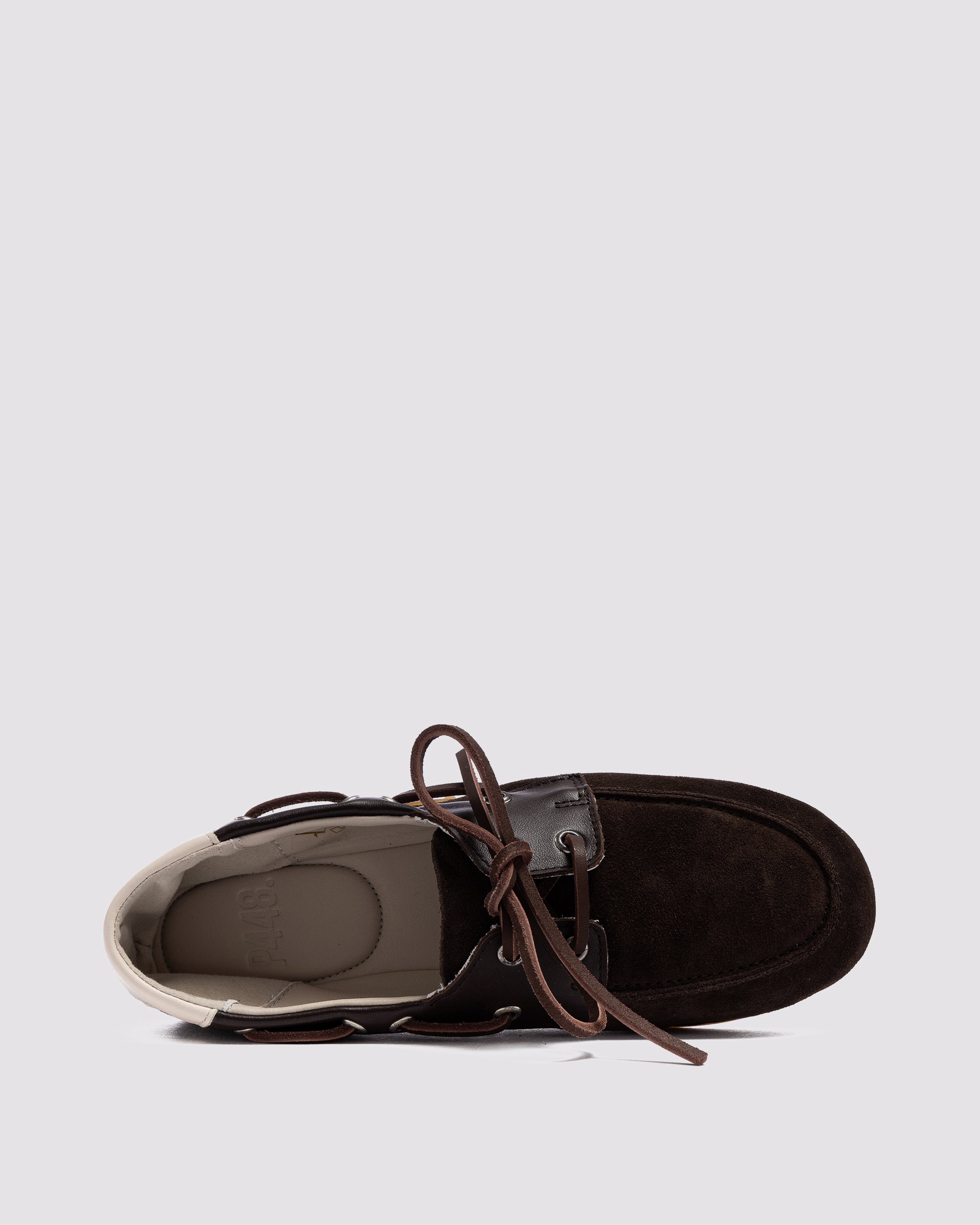 The Antibes Mocha is a P448 sacchetto-designed boat shoe that uses a handmade process to bring you ultimate comfort and sleek style. Smooth all-over brown suede is complemented by brown leather trims and an off-white leather heel tab, with brown suede laces woven around the shoe. Our raised gum tread finishes off the look.