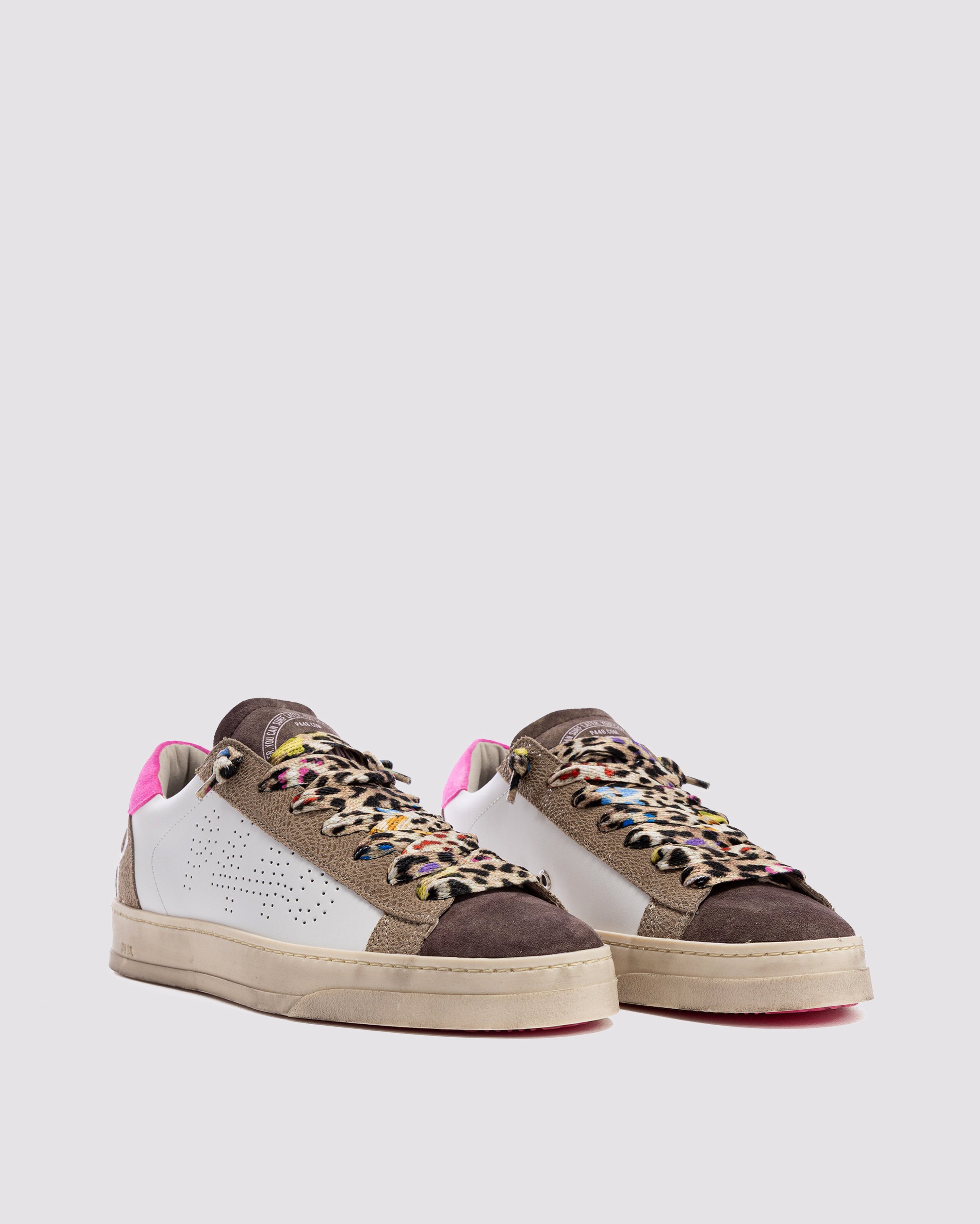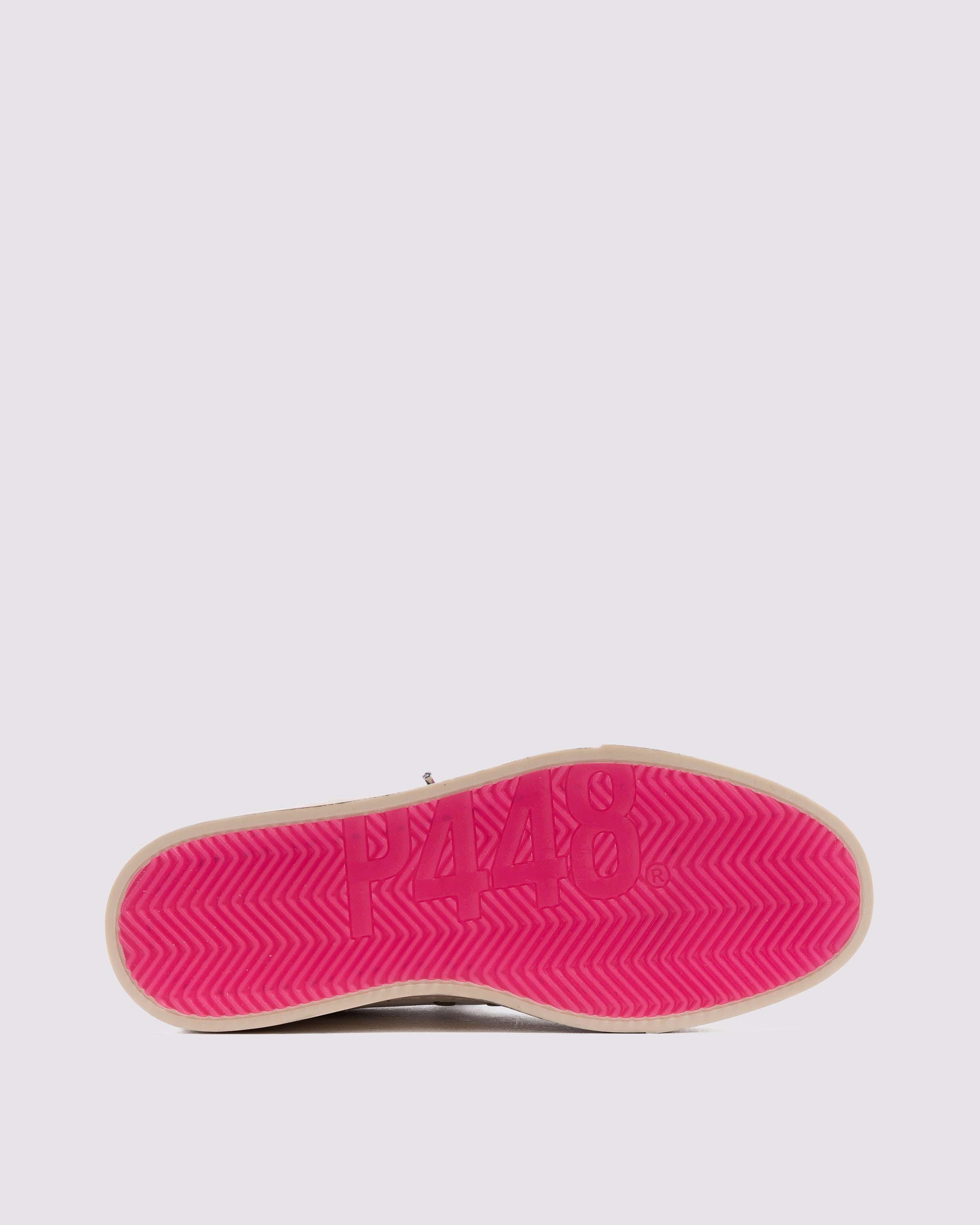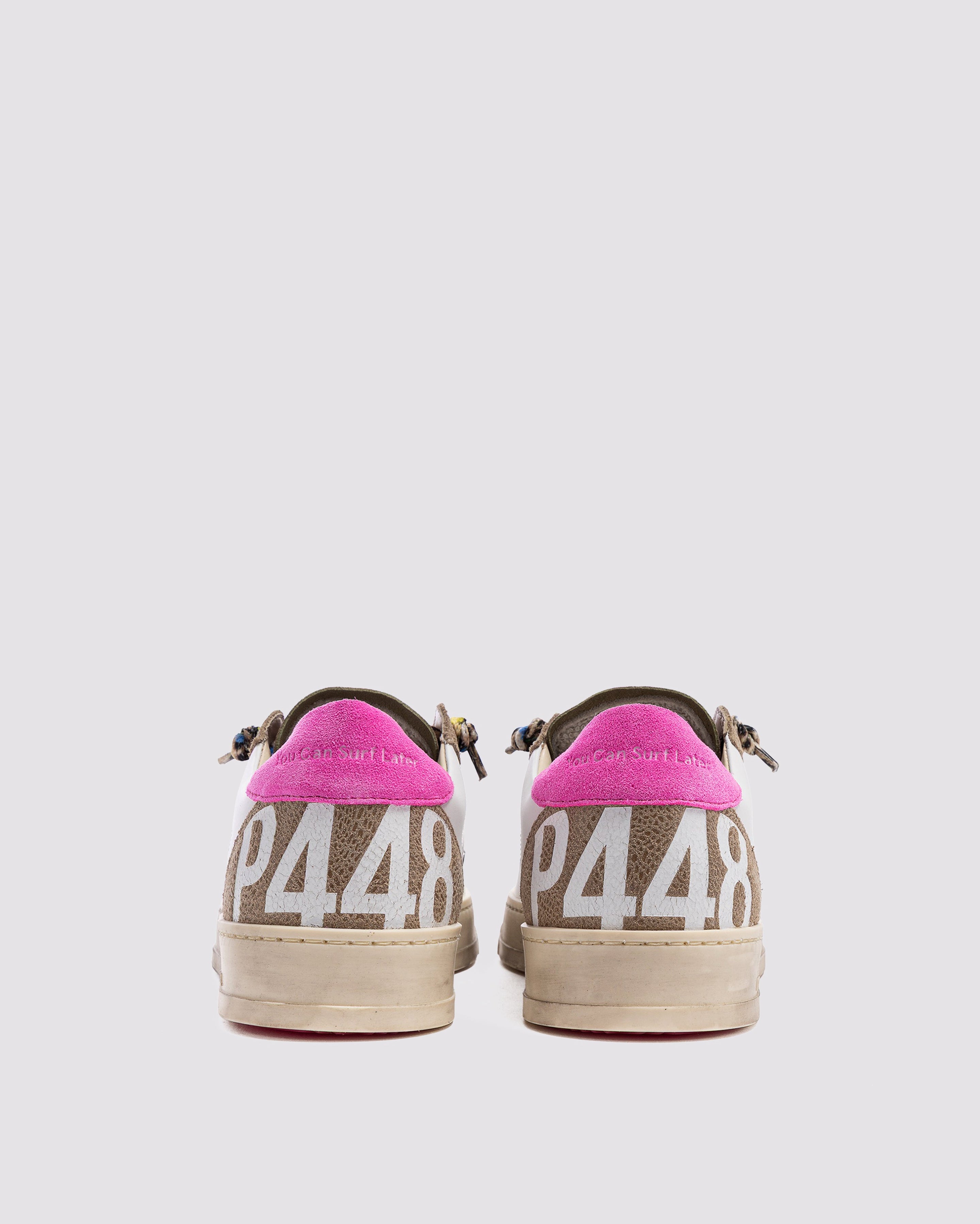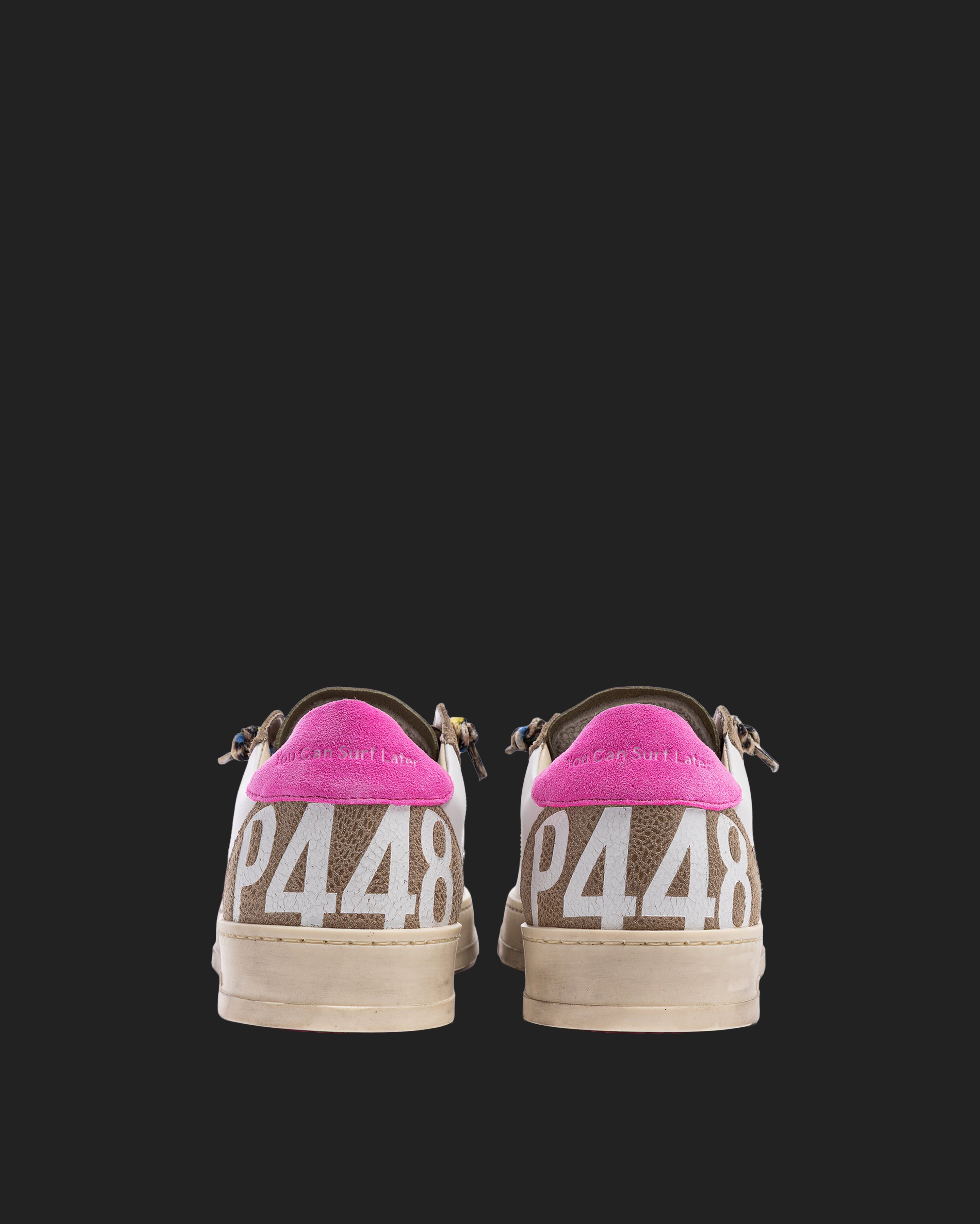 The Jack Stone features a white leather silhouette accented by brown, and fuchsia suede details. Glitter beige suede accents the trim and heel tab while the signature P448 hand-distressed sole and fuchsia tread ground the look. Lace up with the multi-color leopard or white laces.