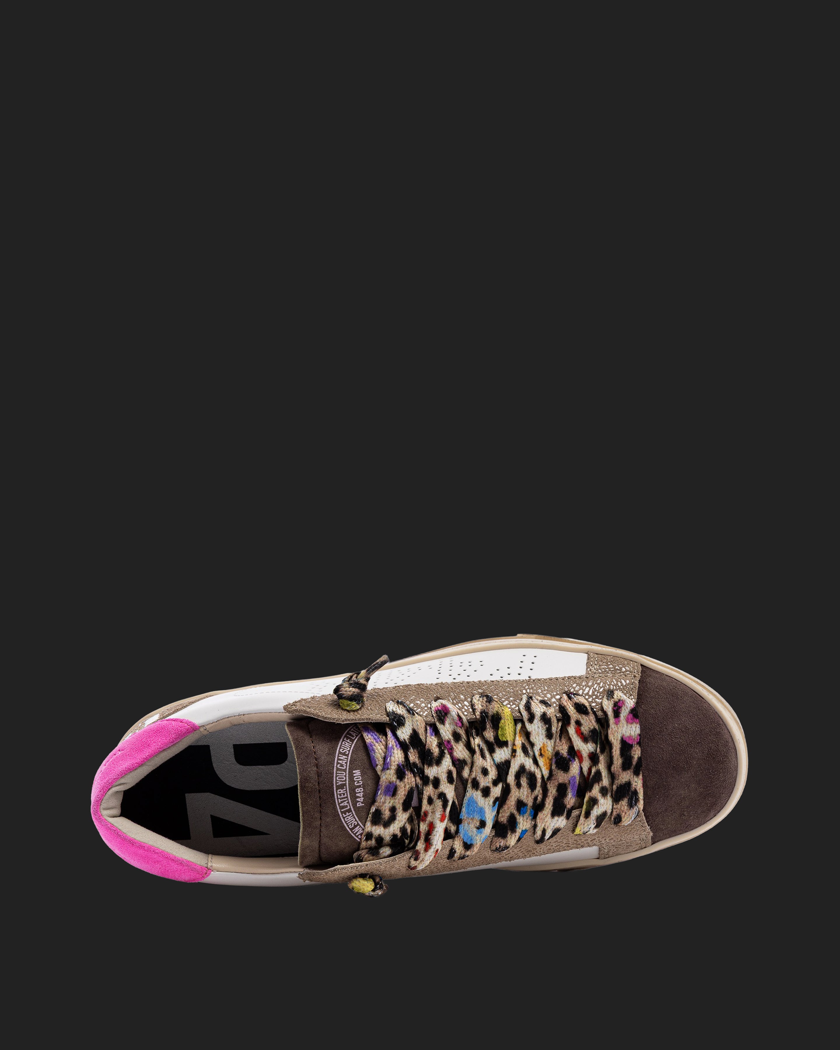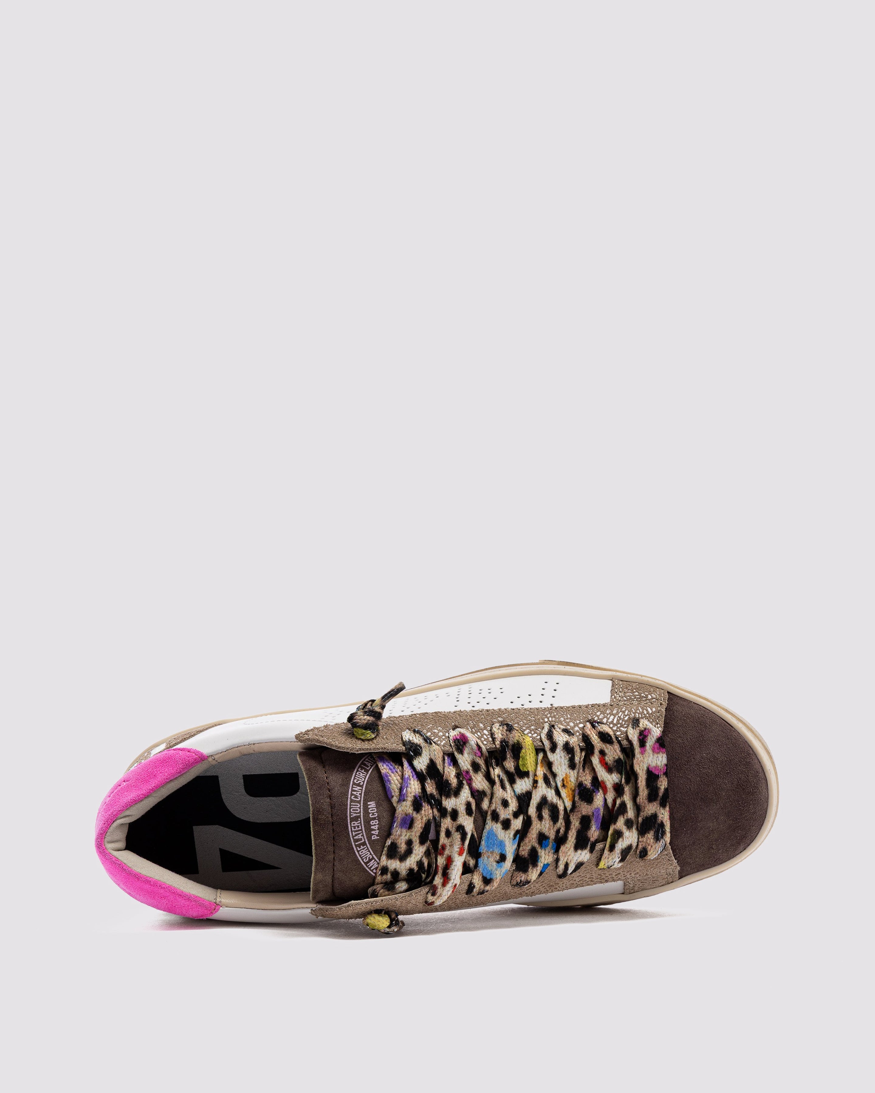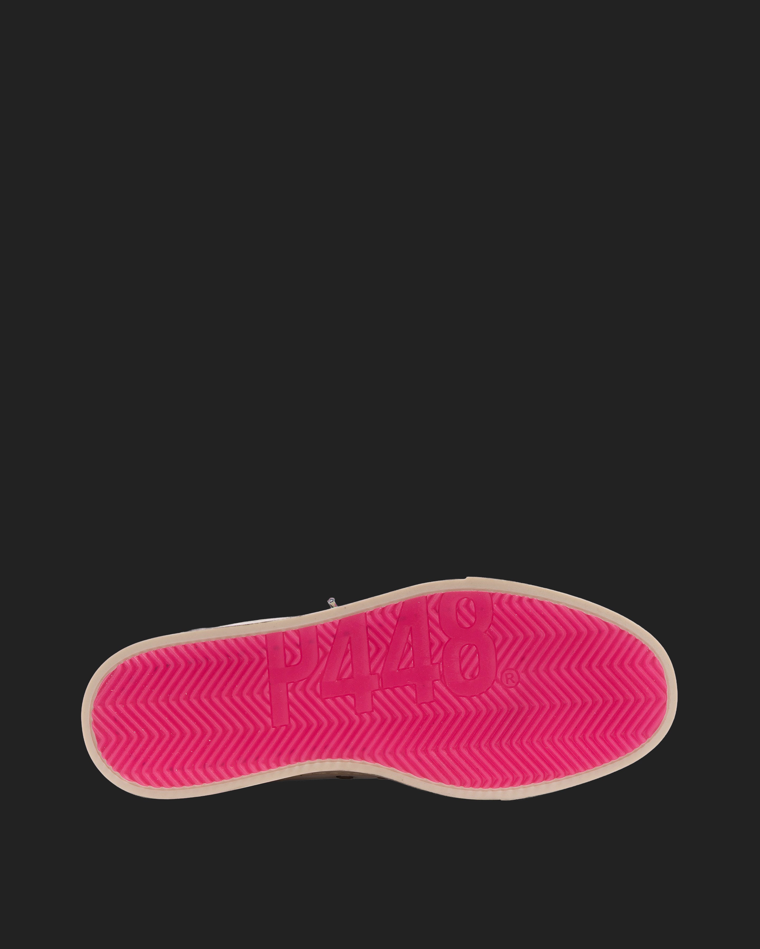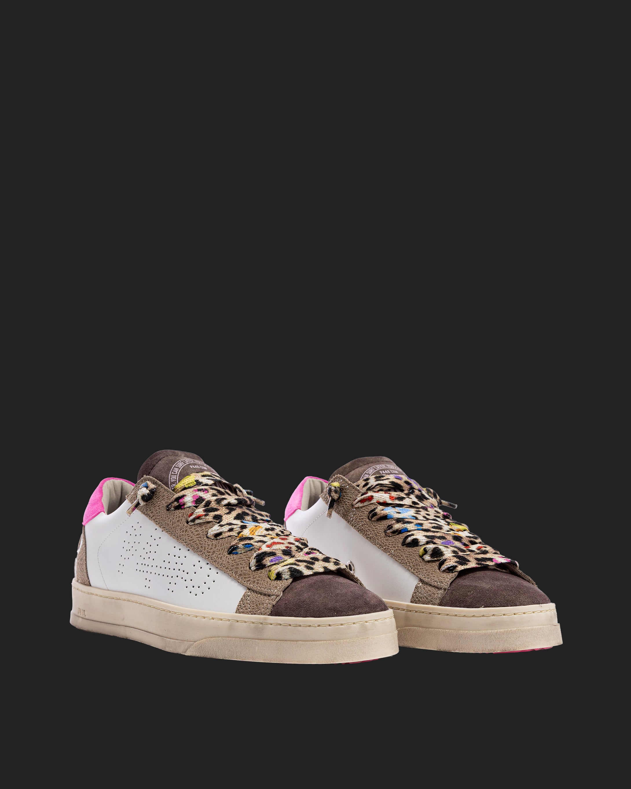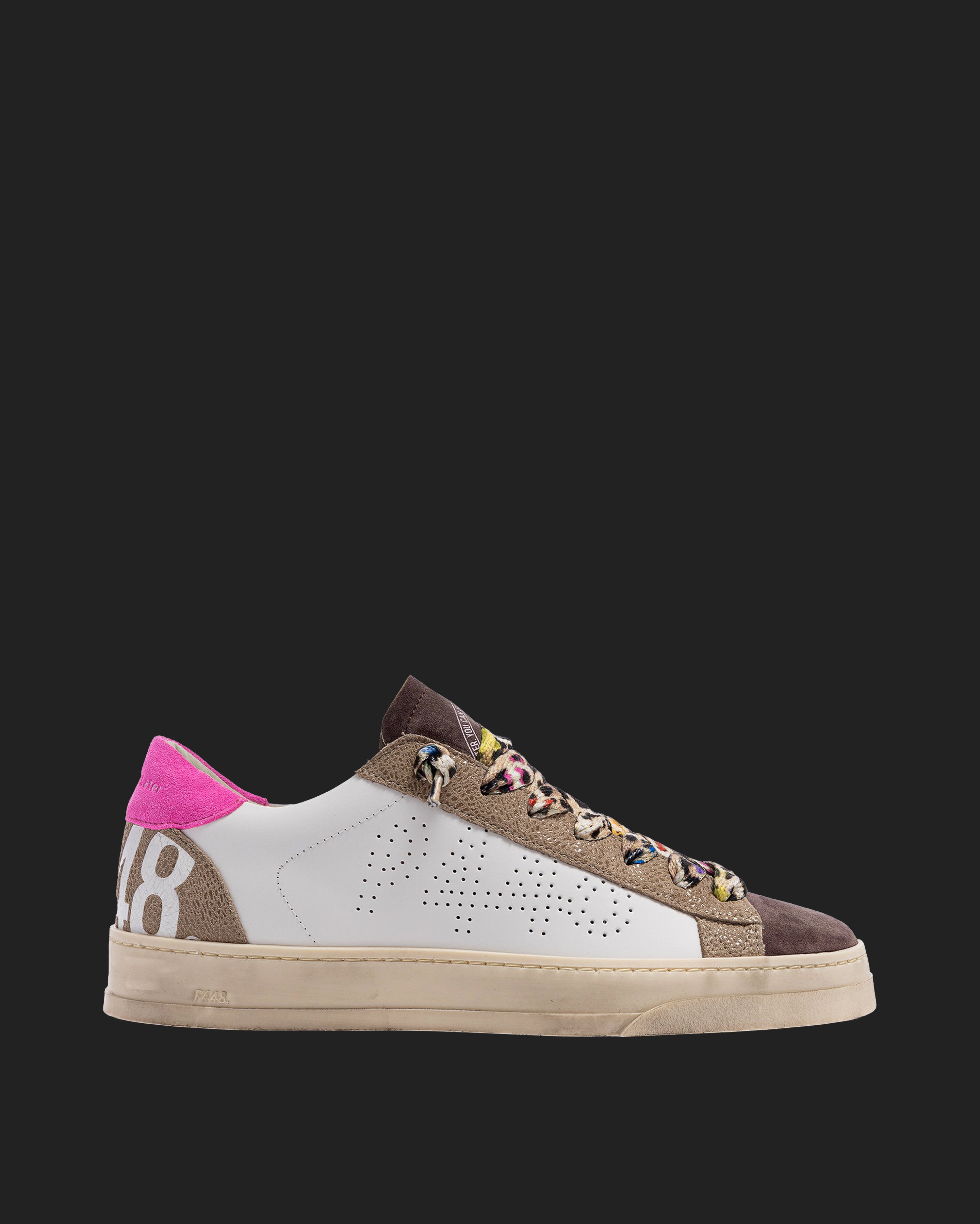 The Jack Stone features a white leather silhouette accented by brown, and fuchsia suede details. Glitter beige suede accents the trim and heel tab while the signature P448 hand-distressed sole and fuchsia tread ground the look. Lace up with the multi-color leopard or white laces.