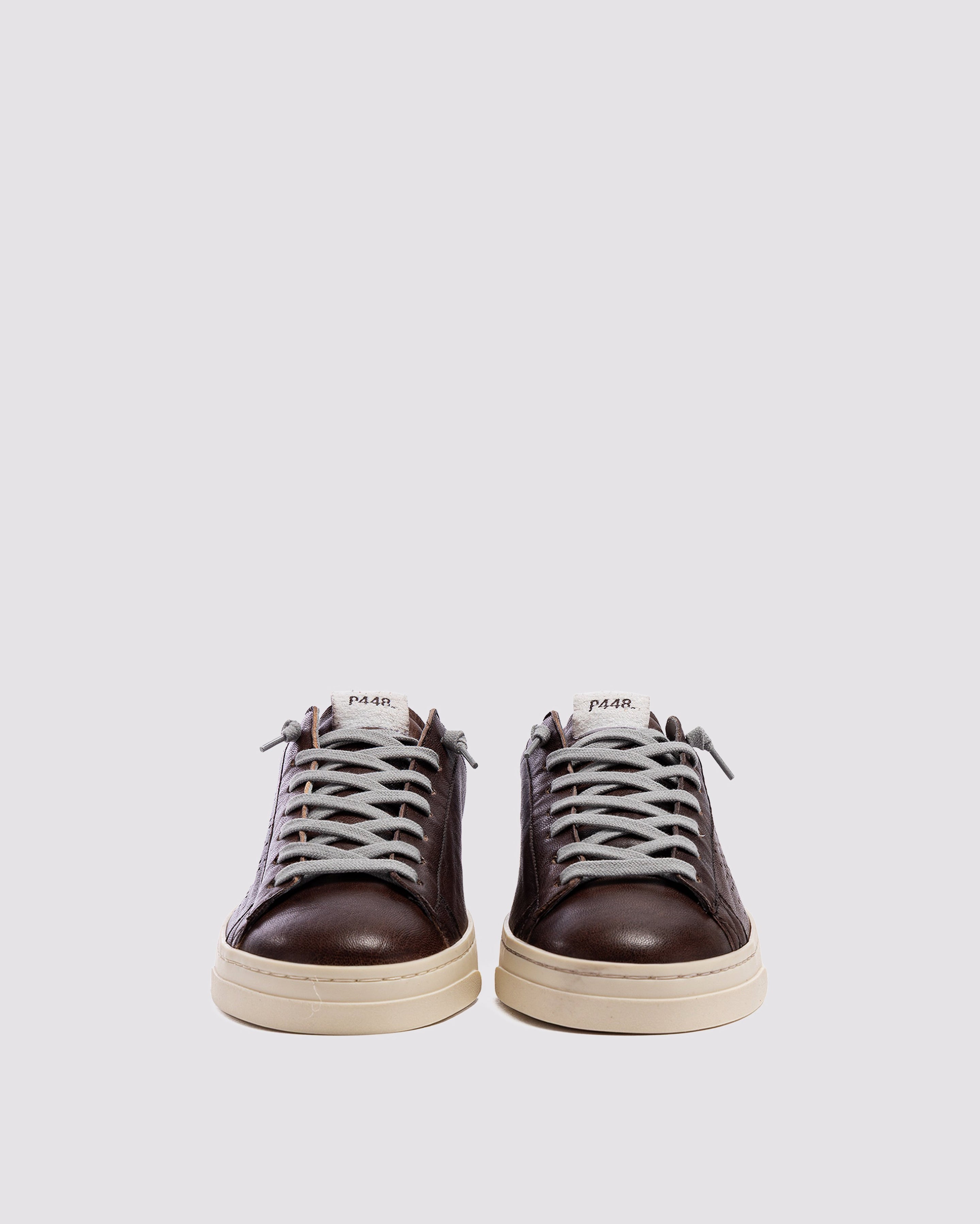 The Jack Vintage Brown features all-over brown leather complemented by grey cotton laces, our signature P448 rubber sole and light brown tread. Swap in the extra pair of brown cotton laces for a monochromatic look.
