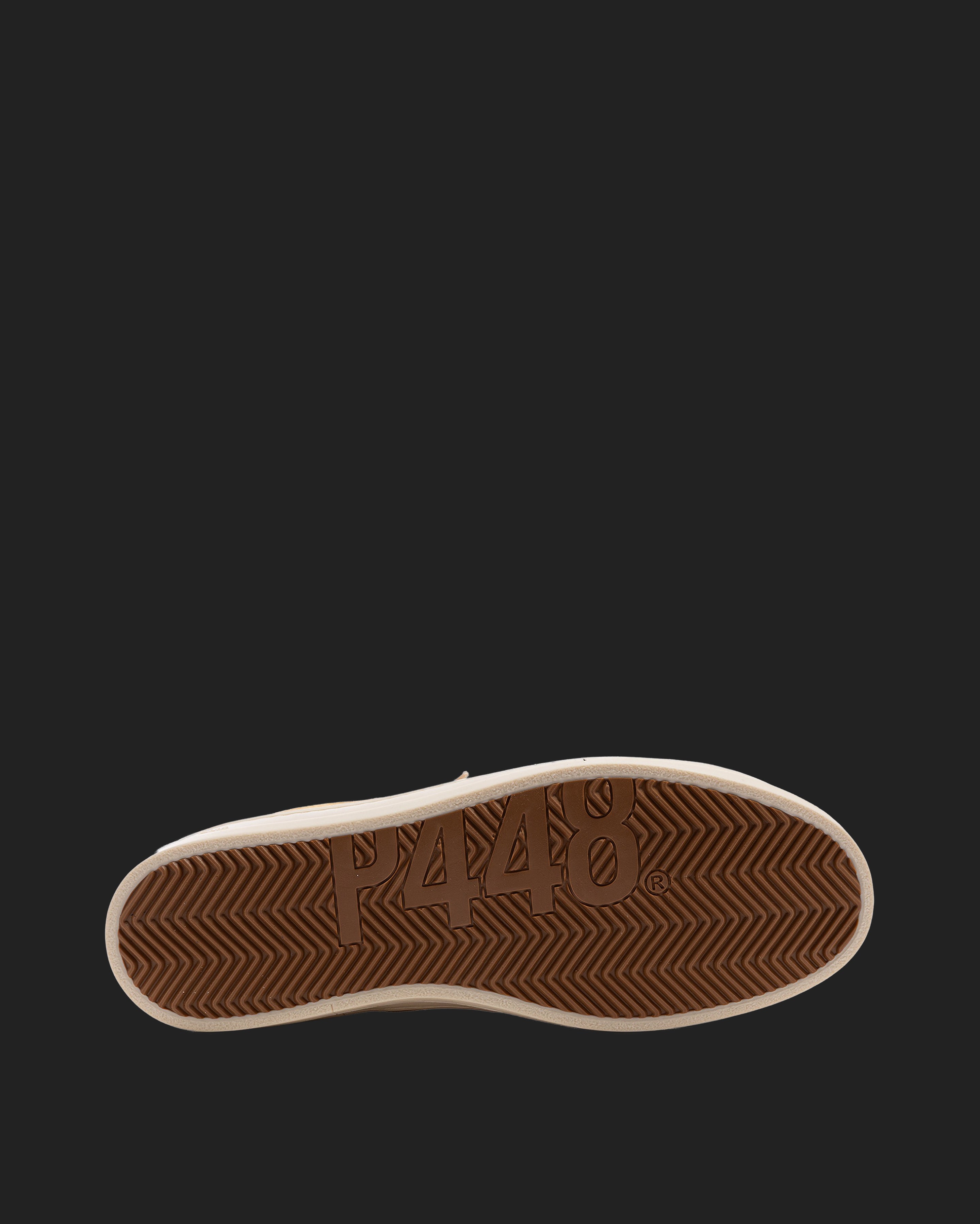 The John Vintage Camel is wrapped in light yellow suede and white leather with off-white cotton laces. Our signature P448 rubber sole and light brown tread finish off the look. Swap in the extra pair of copper cotton laces to make a statement.