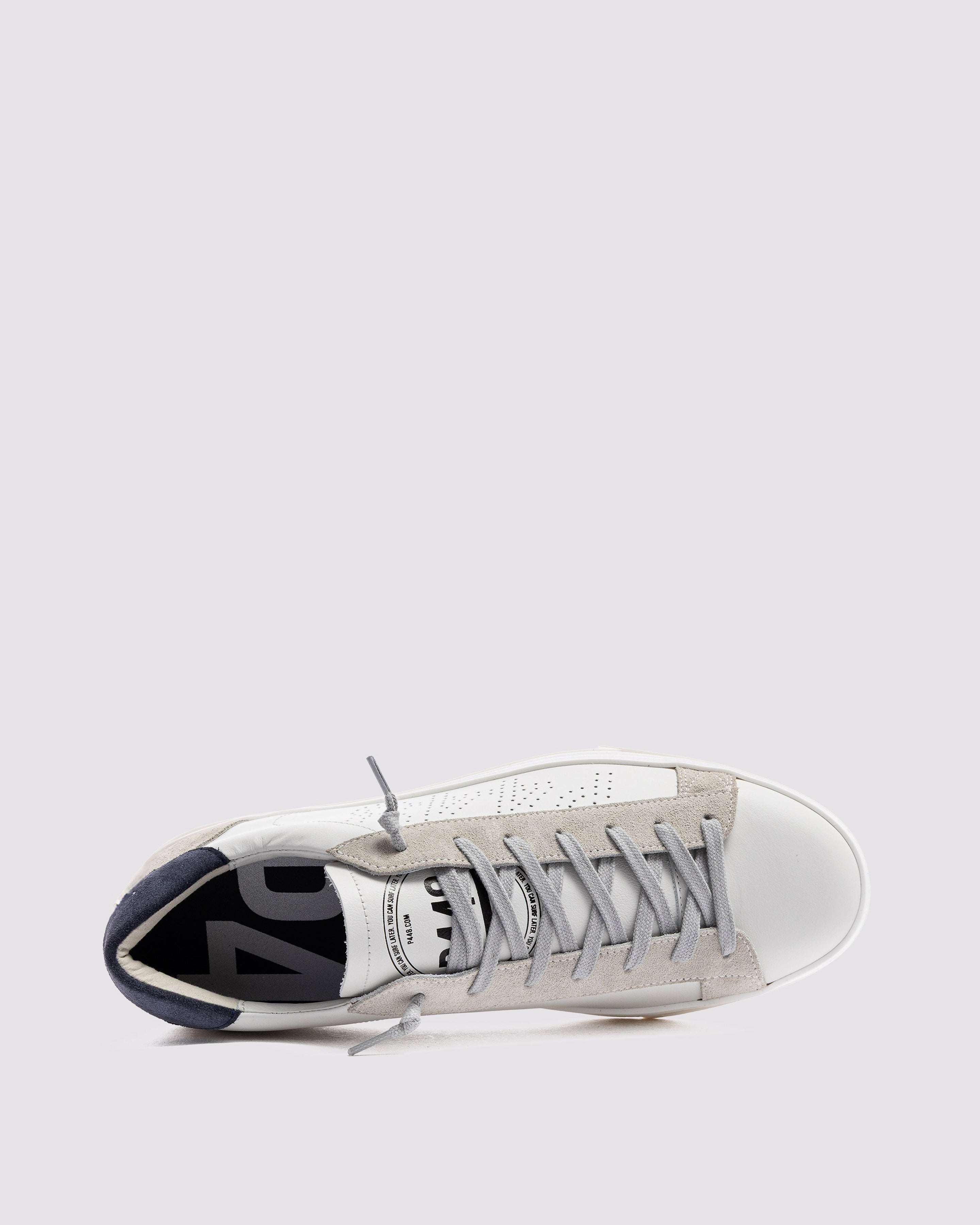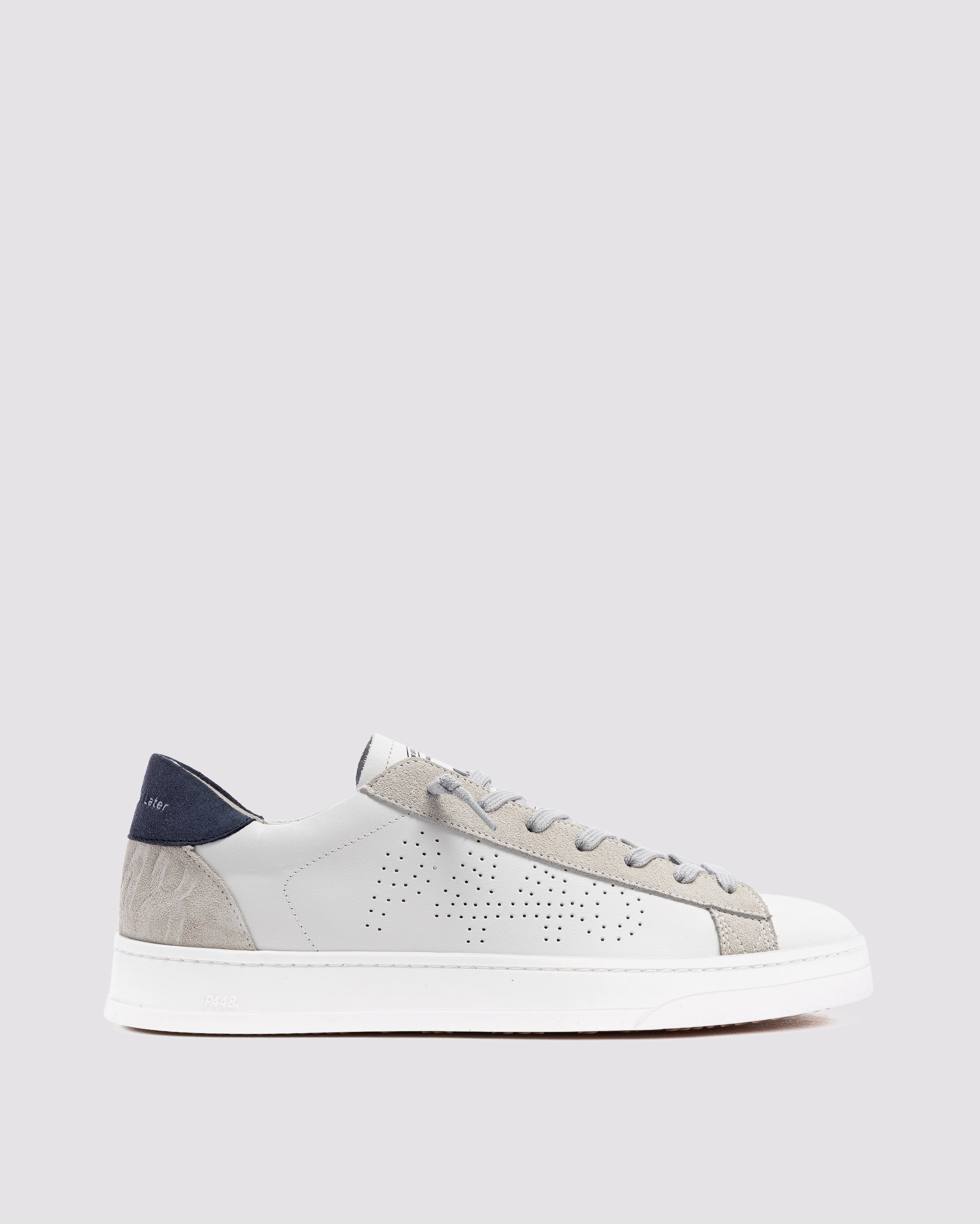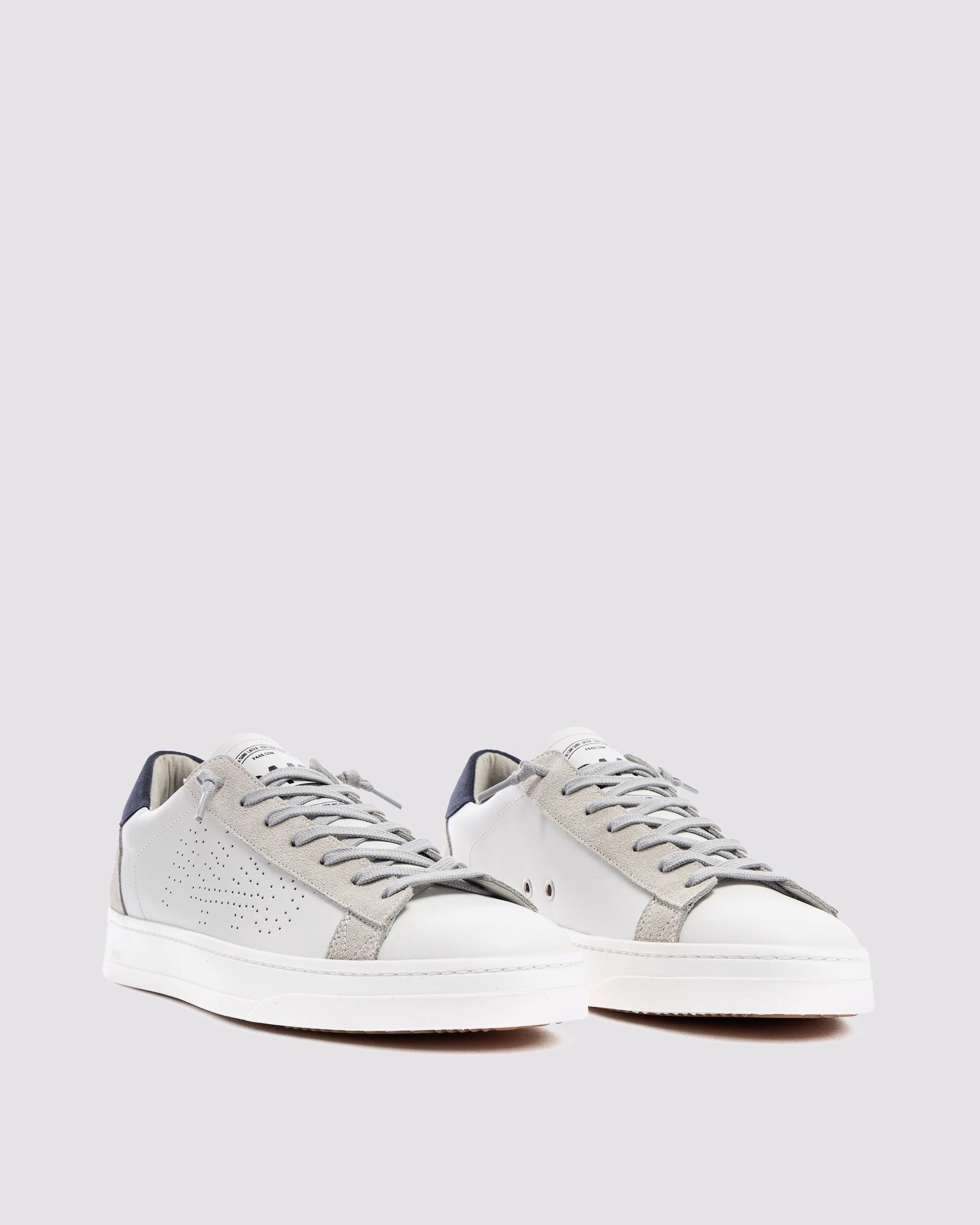 The Jack White/Navy features a white leather upper with a perforated P448 logo, complemented by grey suede trims and a navy leather heel tab. Grey cotton laces and our signature P448 rubber soles with a amber tread ground the look.