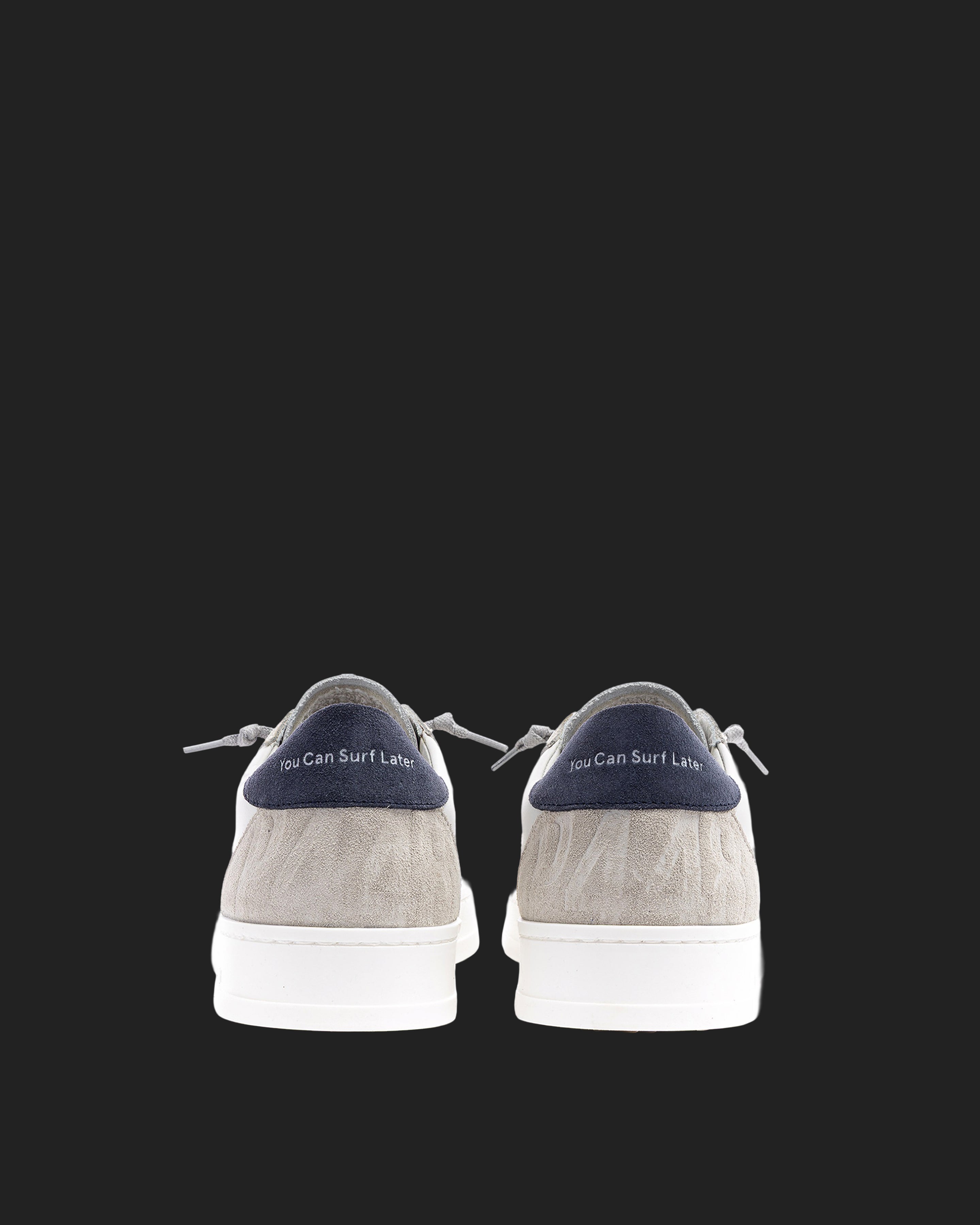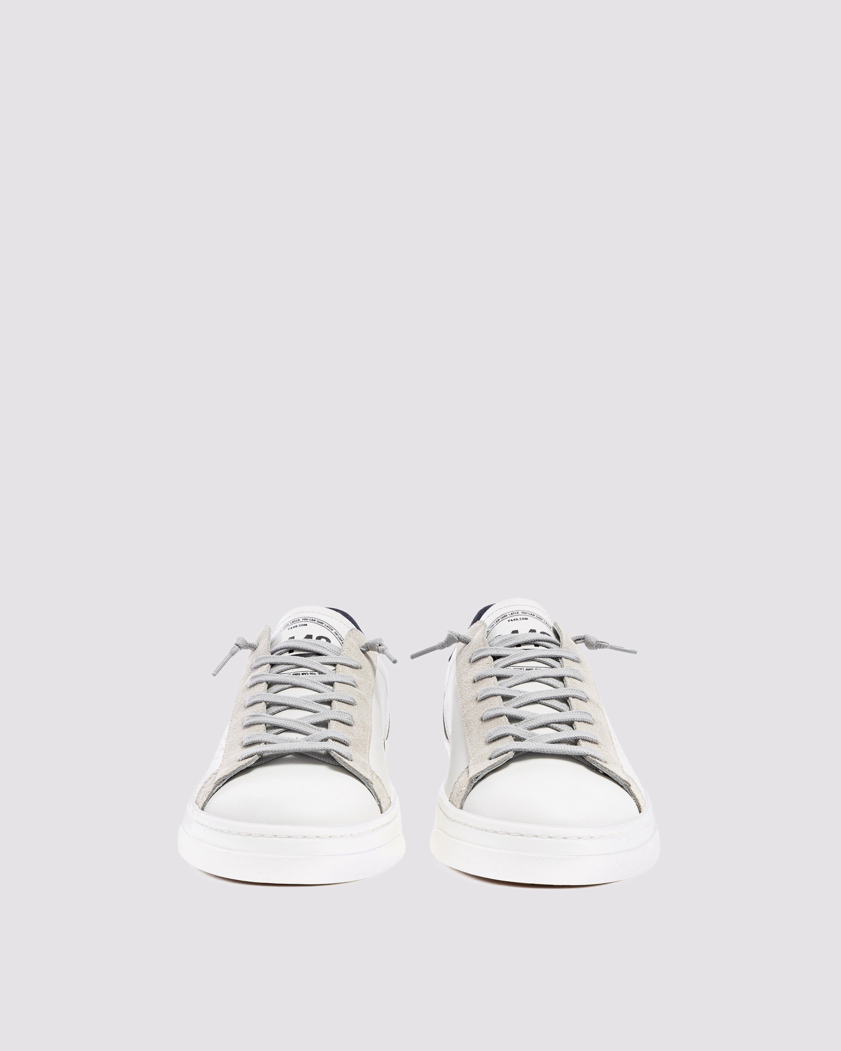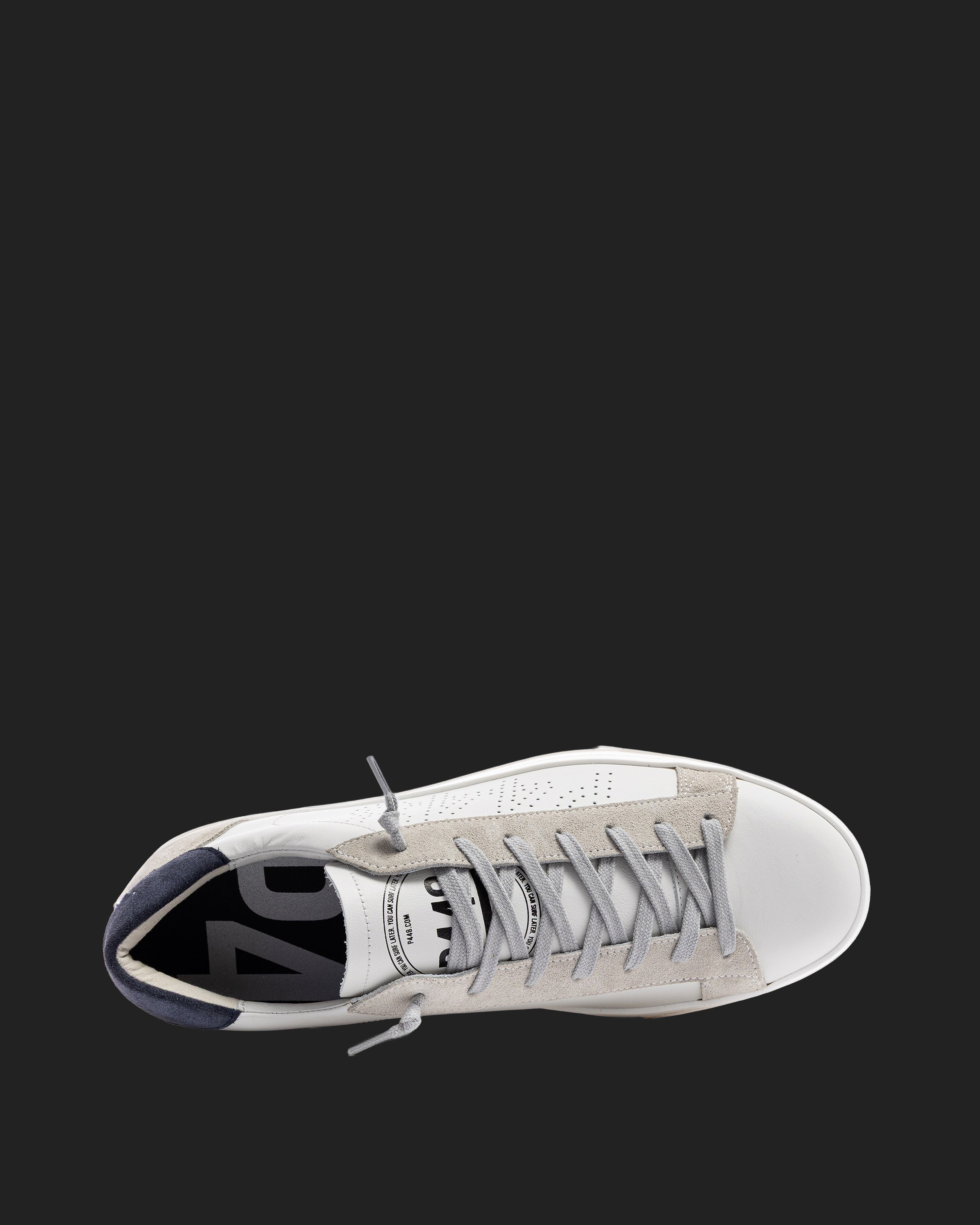 The Jack White/Navy features a white leather upper with a perforated P448 logo, complemented by grey suede trims and a navy leather heel tab. Grey cotton laces and our signature P448 rubber soles with a amber tread ground the look.