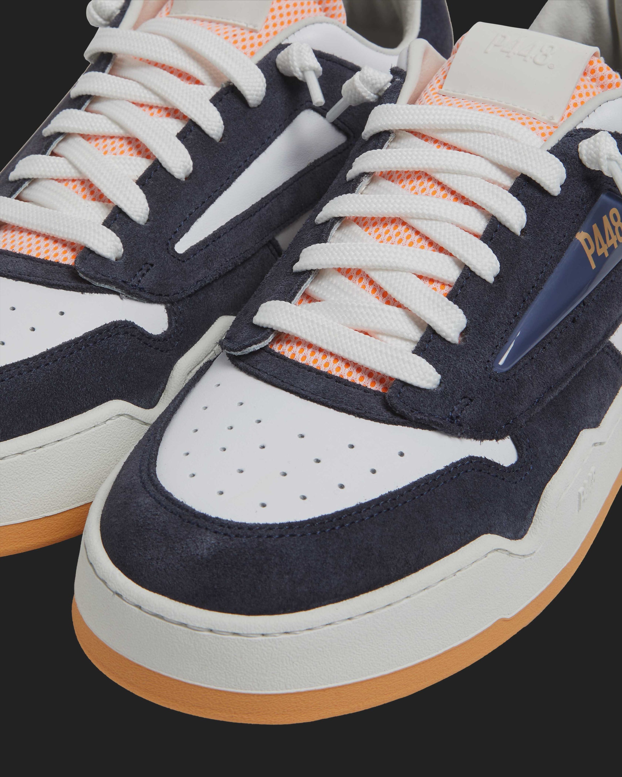 La Brixton Nautilus presenta un design interamente in pelle bianca accentuato da dettagli in suede blu navy direzionali e una linguetta in tessuto a rete arancione fluorescente con suola e battistrada abbinati. Lacci in cotone bianco legano il tutto.
