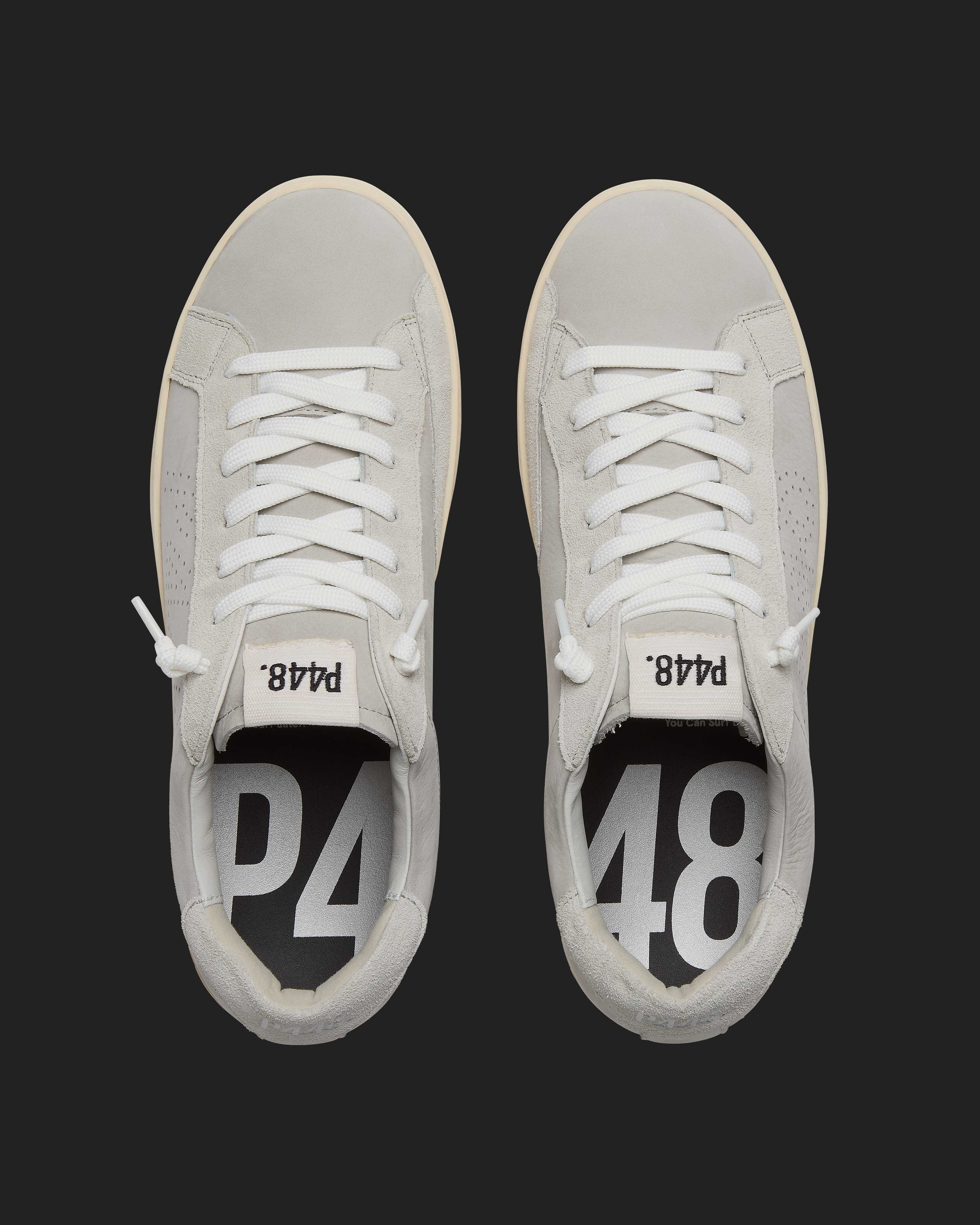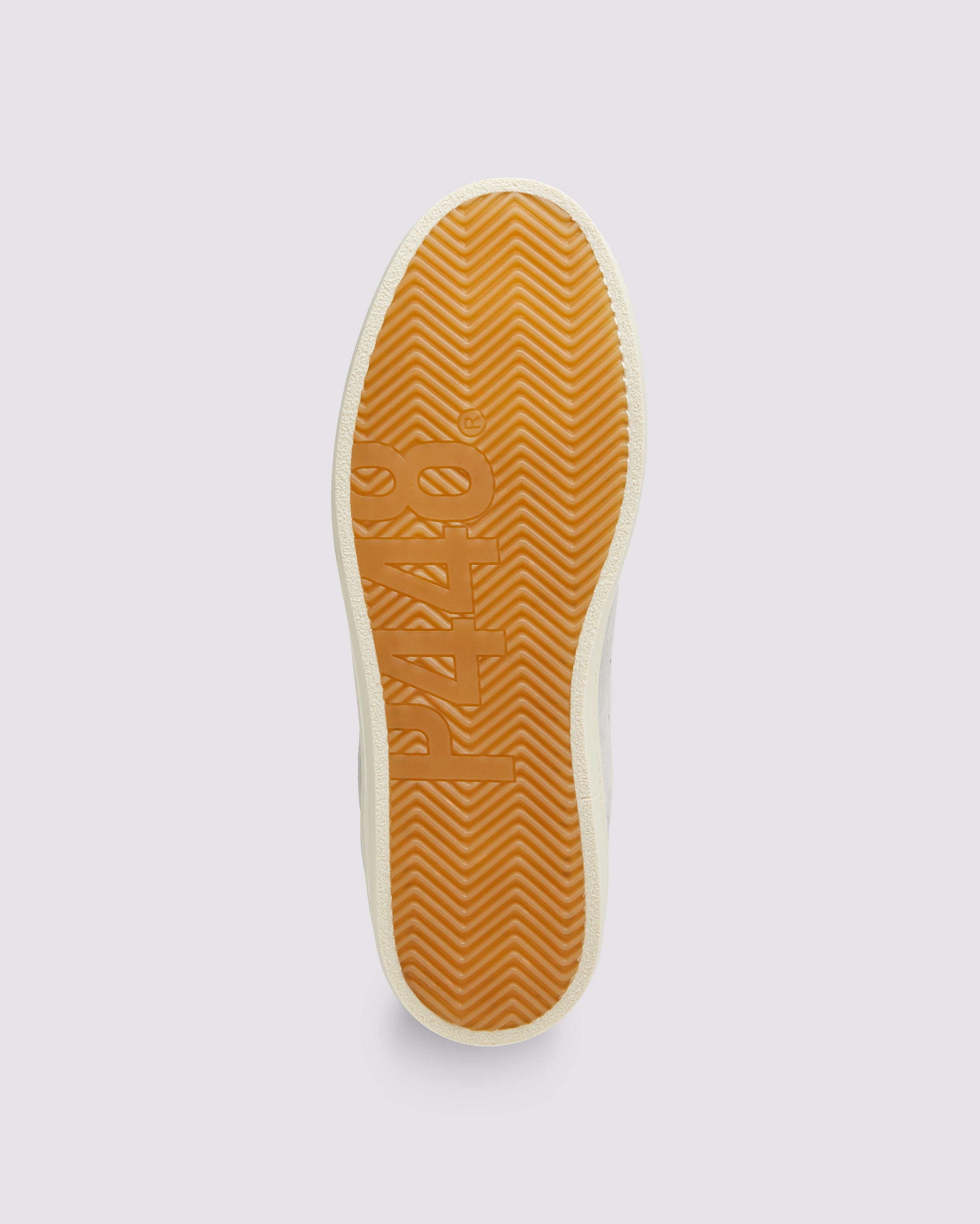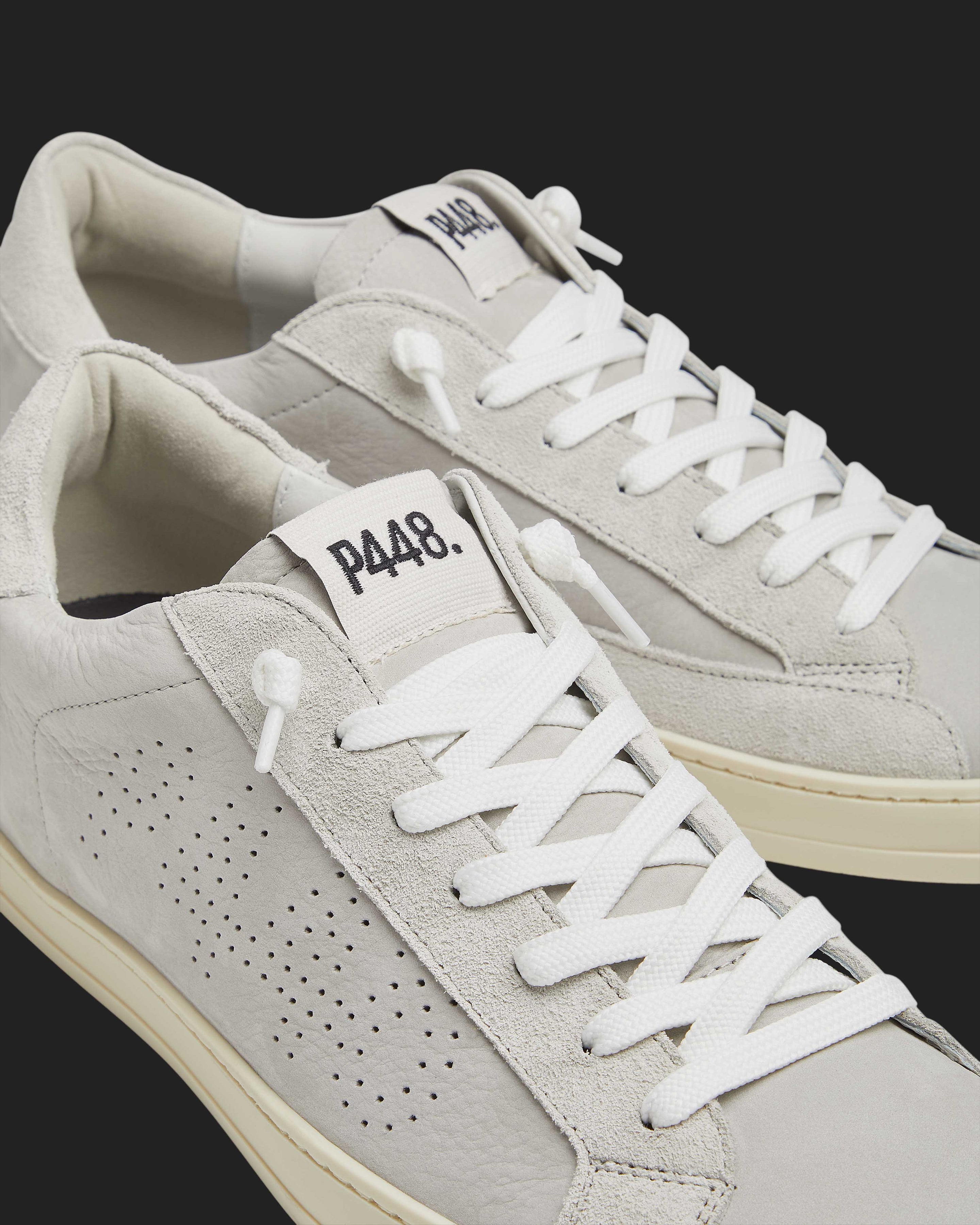 The John Grey features a grey leather upper with a perforated P448 logo, accented by a grey leather tongue, toe, and heel tab. Grey suede trims add texture, while white cotton laces and our signature P448 rubber soles with beige tread complete the look.
