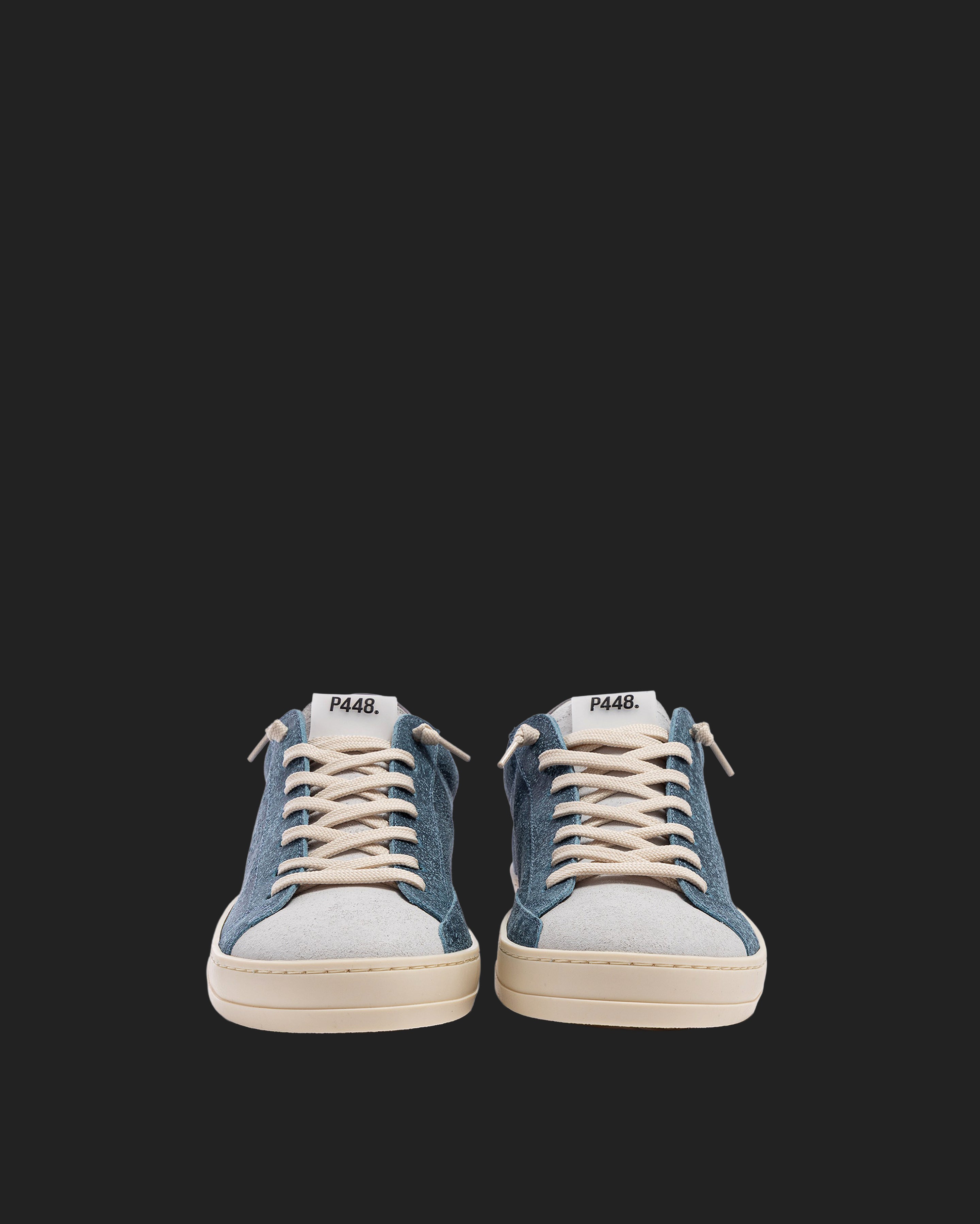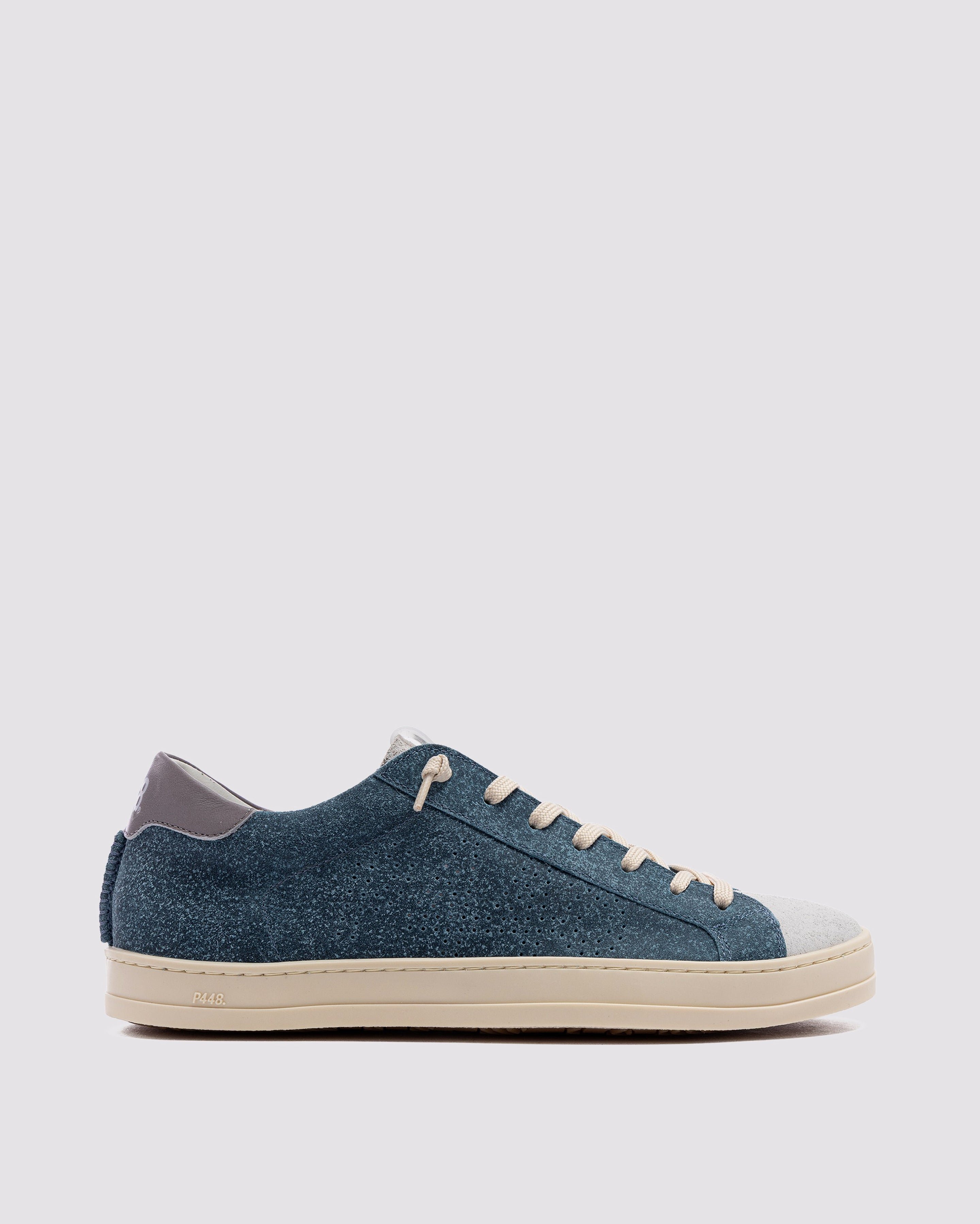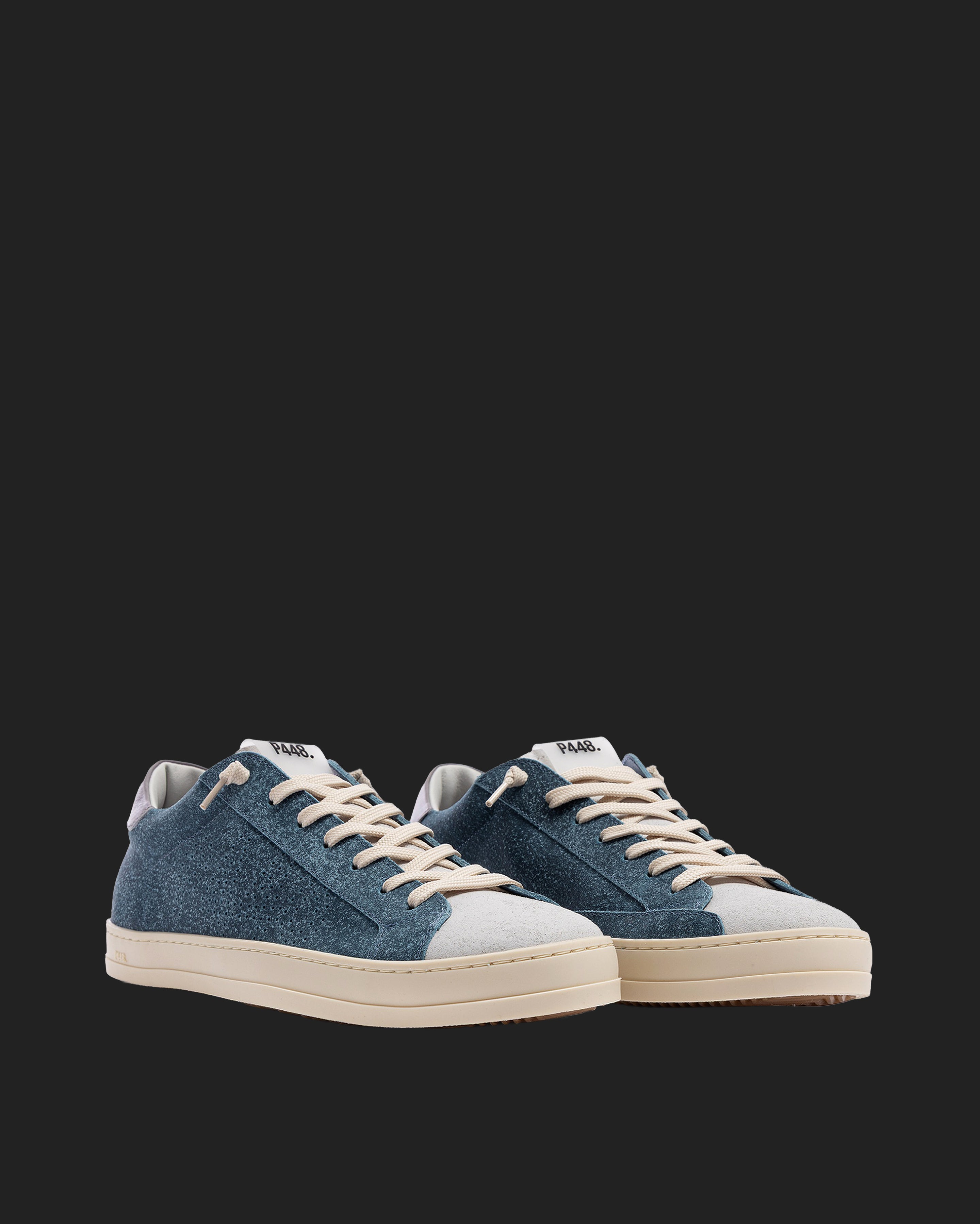 John Deco Sky is a 100% deconstructed pair designed to bring you lightweight comfort and maximum breathability for a fits-like-a-glove feel. Wrapped in blue and white waxed suede details with a complementary grey leather heel tab and cream laces. Our signature P448 rubber sole and gum tread ground the look. Swap in the extra pair of dark grey laces to tie it all together.