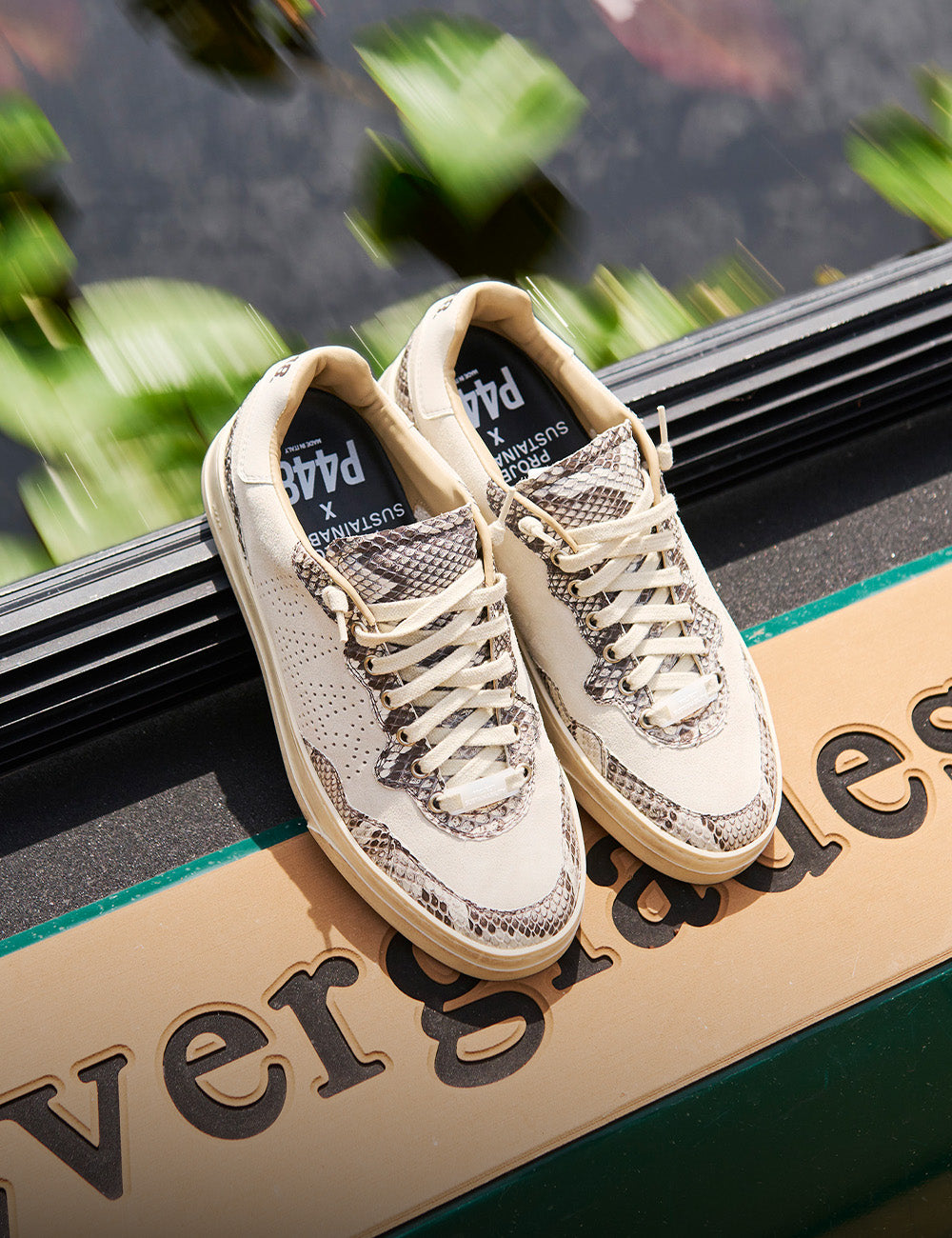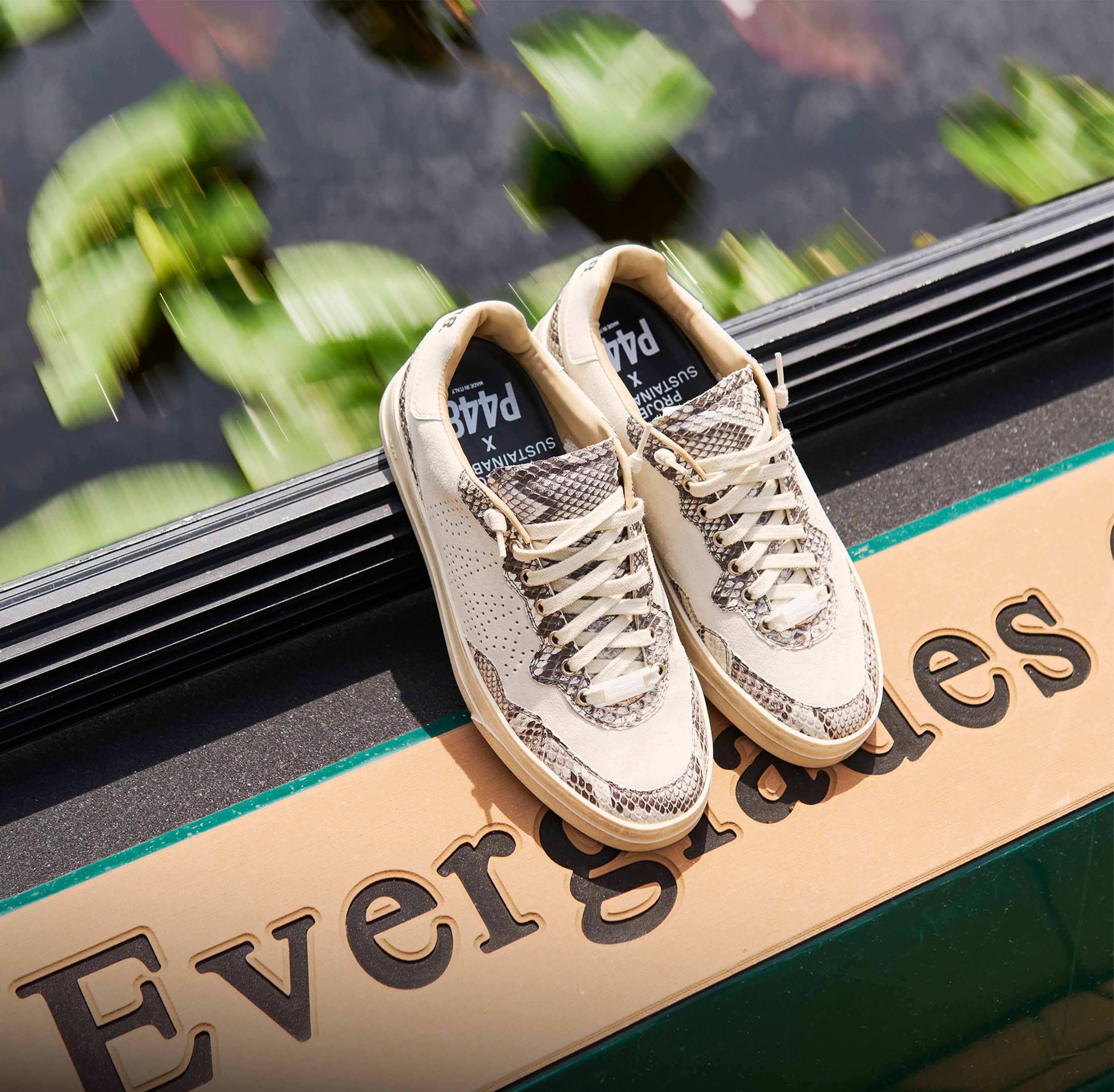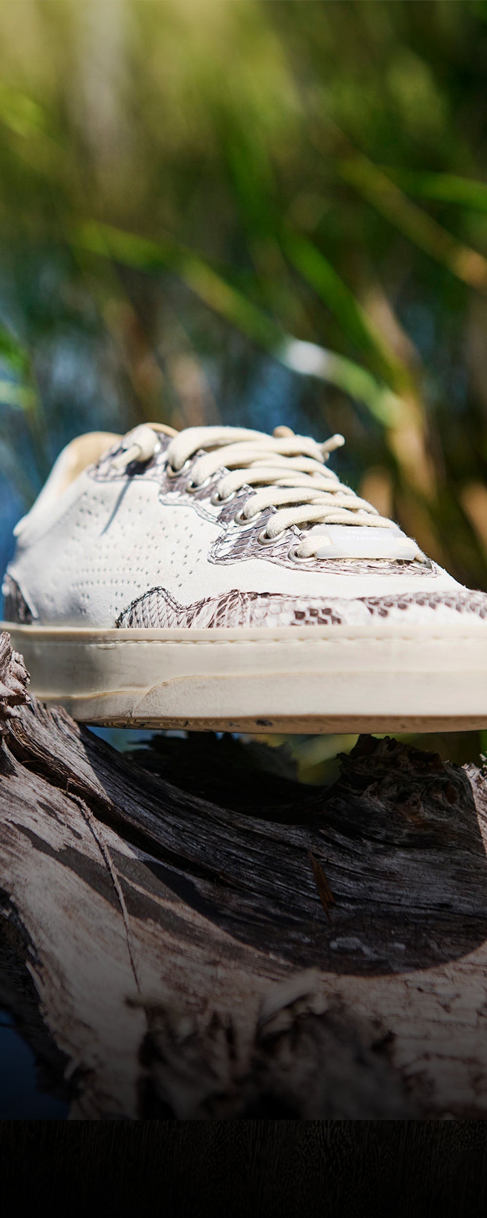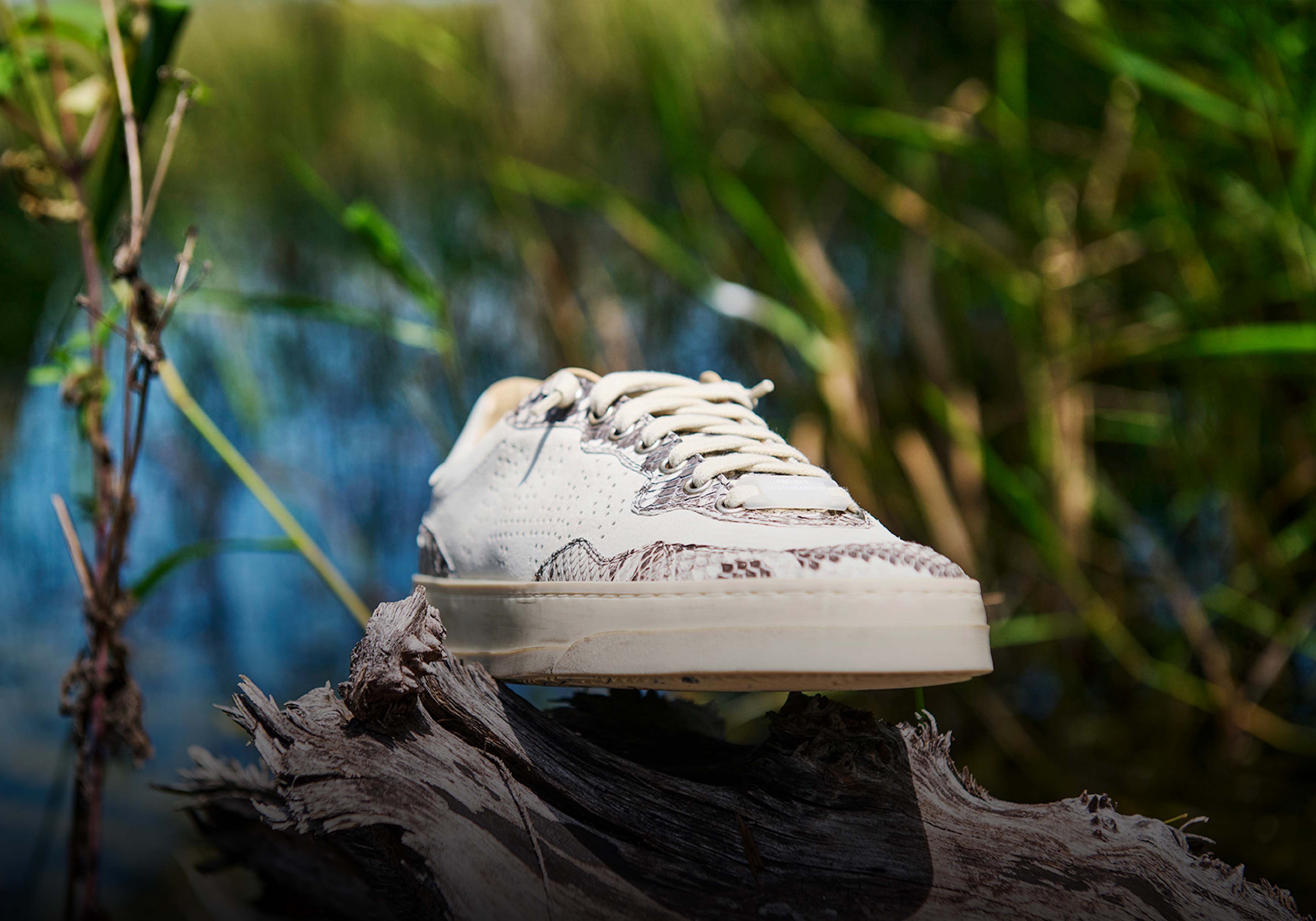 La prima linea di sneaker sul mercato con pellami decorativi realizzati con specie invasive riutilizzate, tra cui pitoni birmani della Florida, carpe e pesci scorpione.