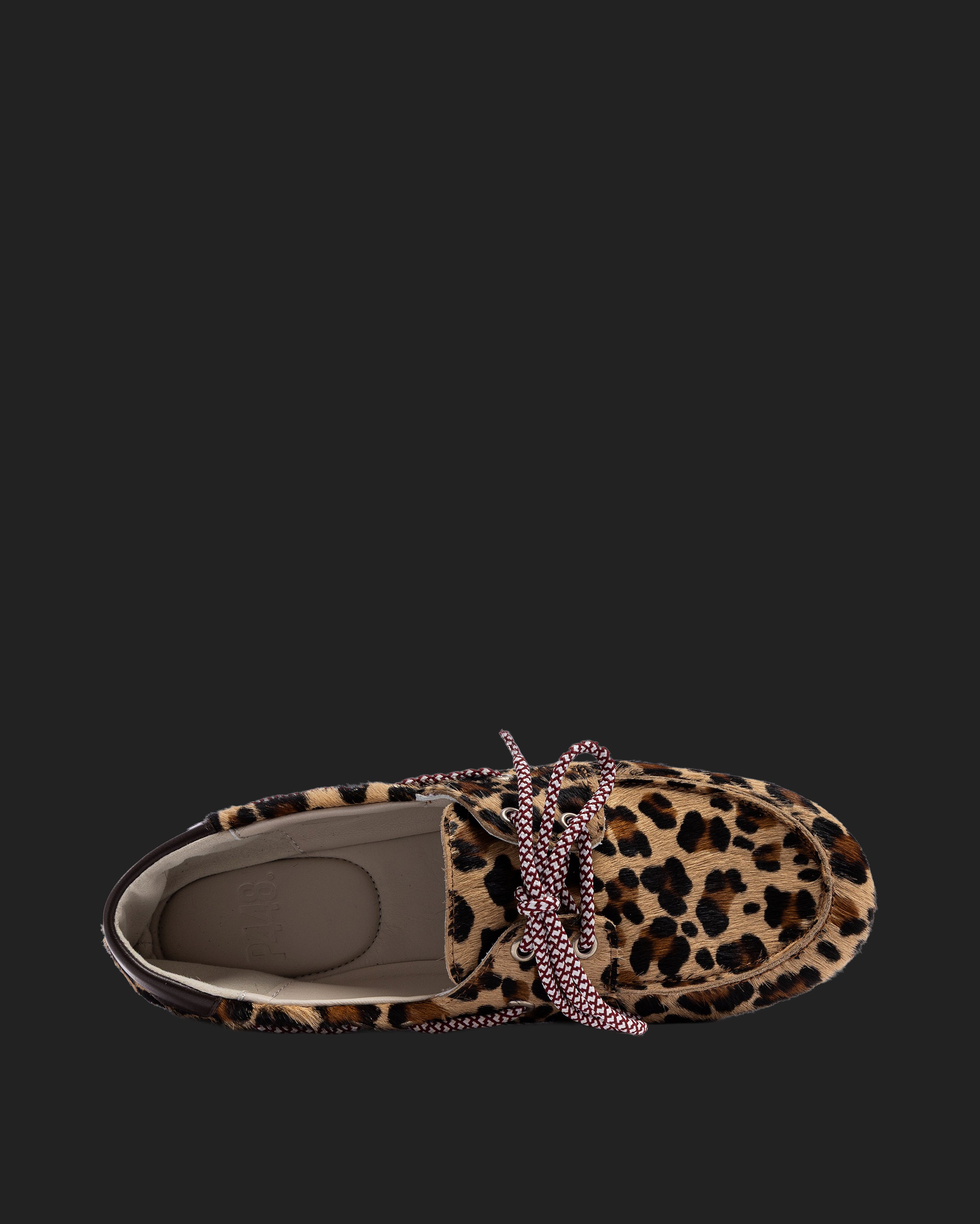 Soft all-over leopard print haircalf leather is complemented by a brown leather heel tab, with burgundy and white laces woven around the shoe. Our raised gum tread finishes off the look.