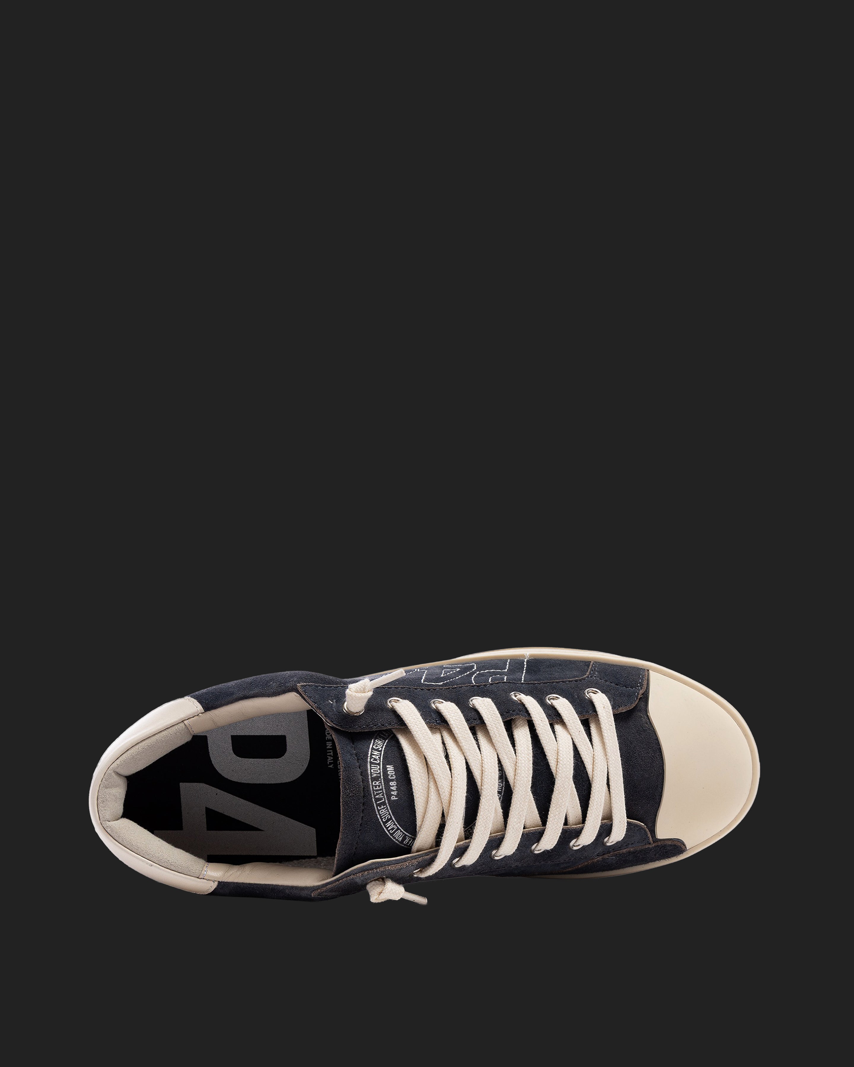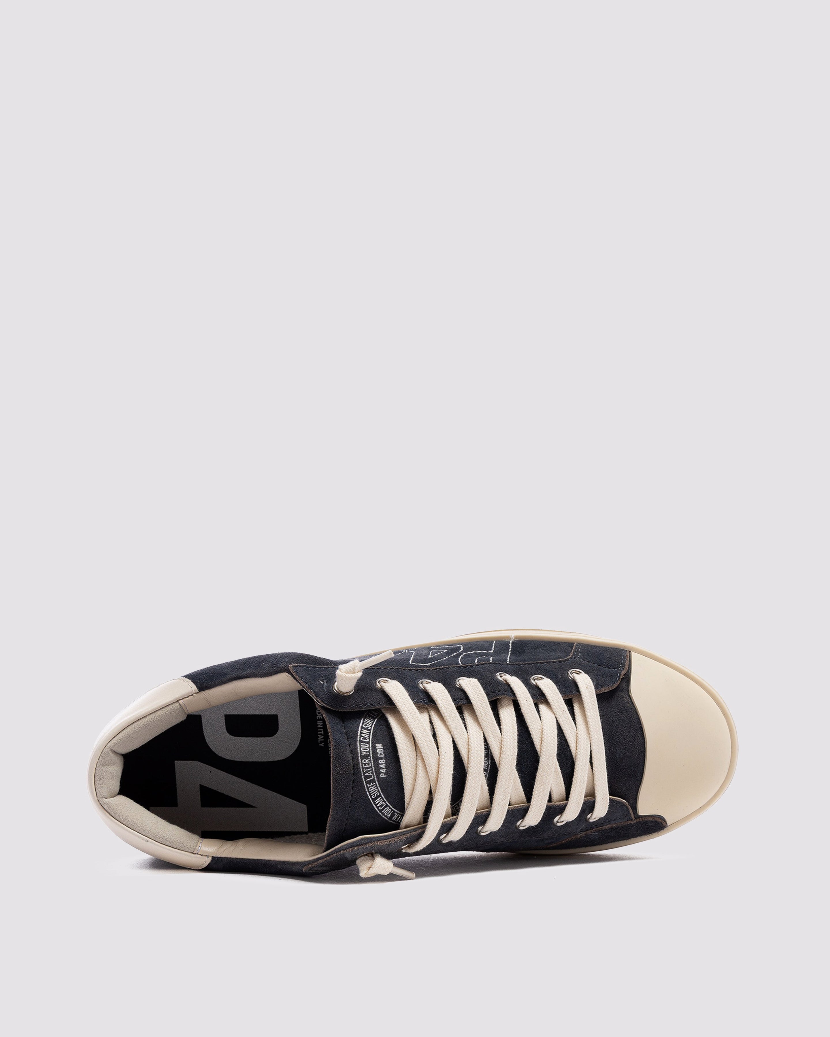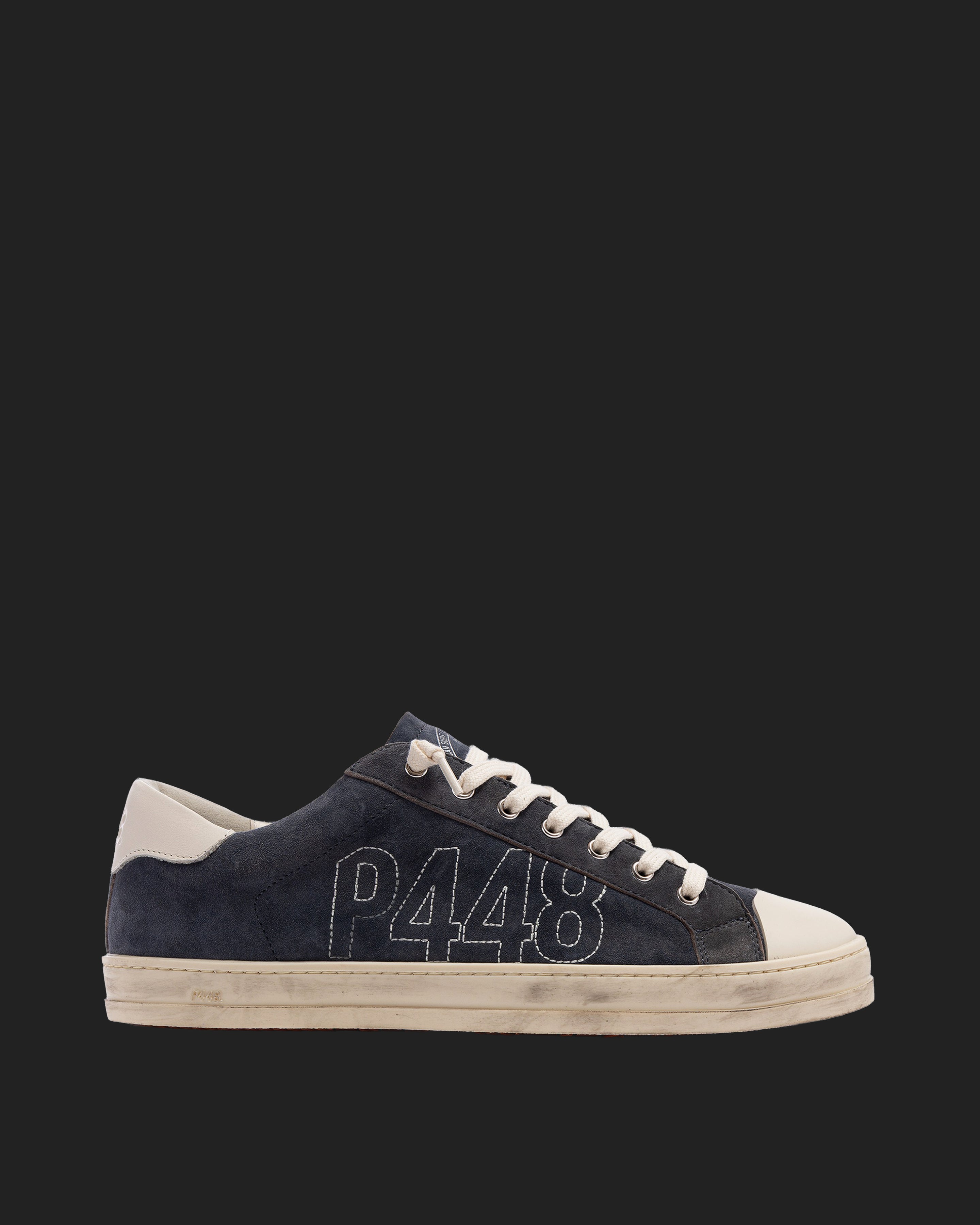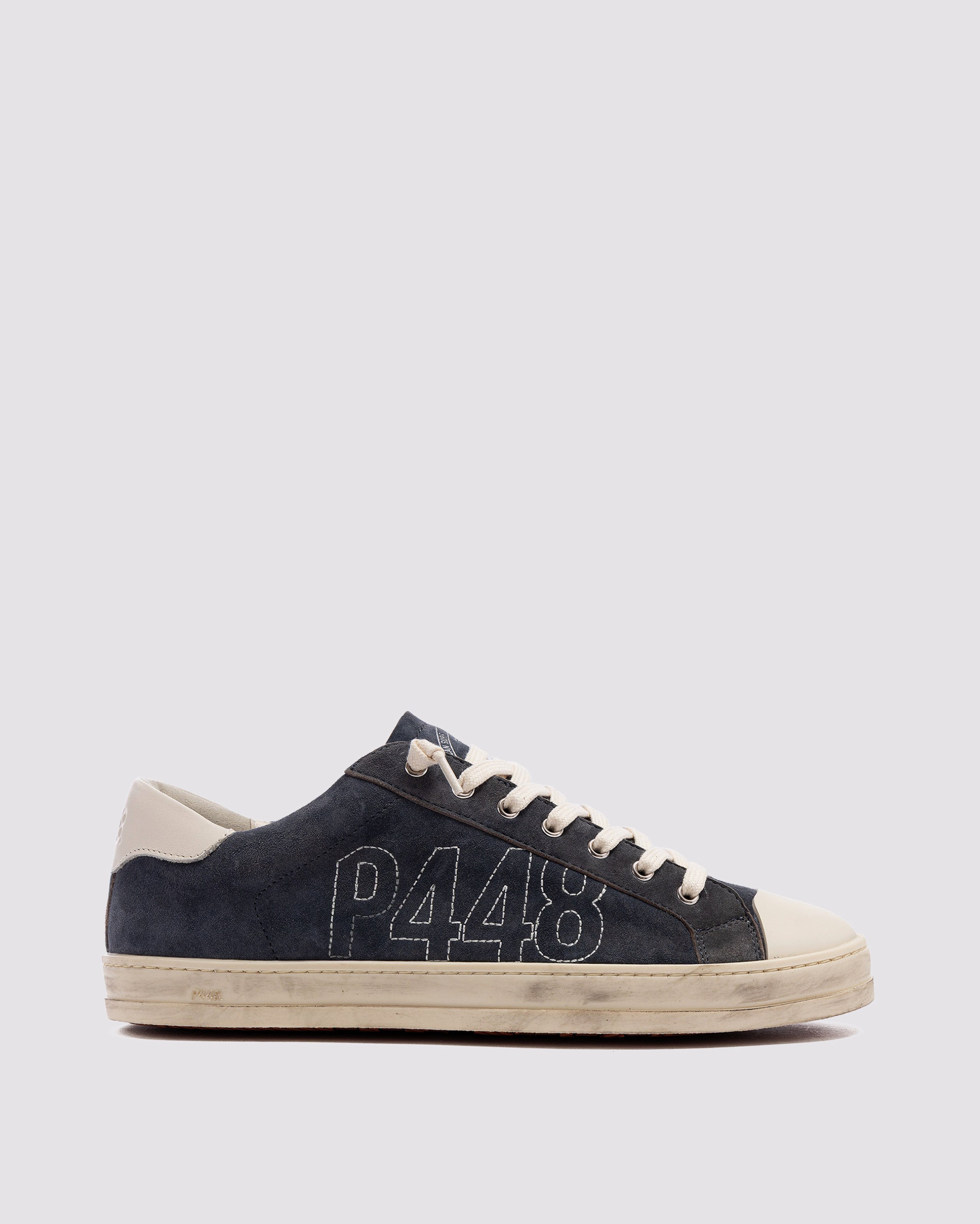 The John Stitch Blue is wrapped in blue suede with a grey leather heel tab and a rubber toe cap. Off-white cotton laces, our signature P448 hand-distressed rubber sole and brick red tread ground the look. Swap in the extra pair of blue laces for a monochromatic moment.