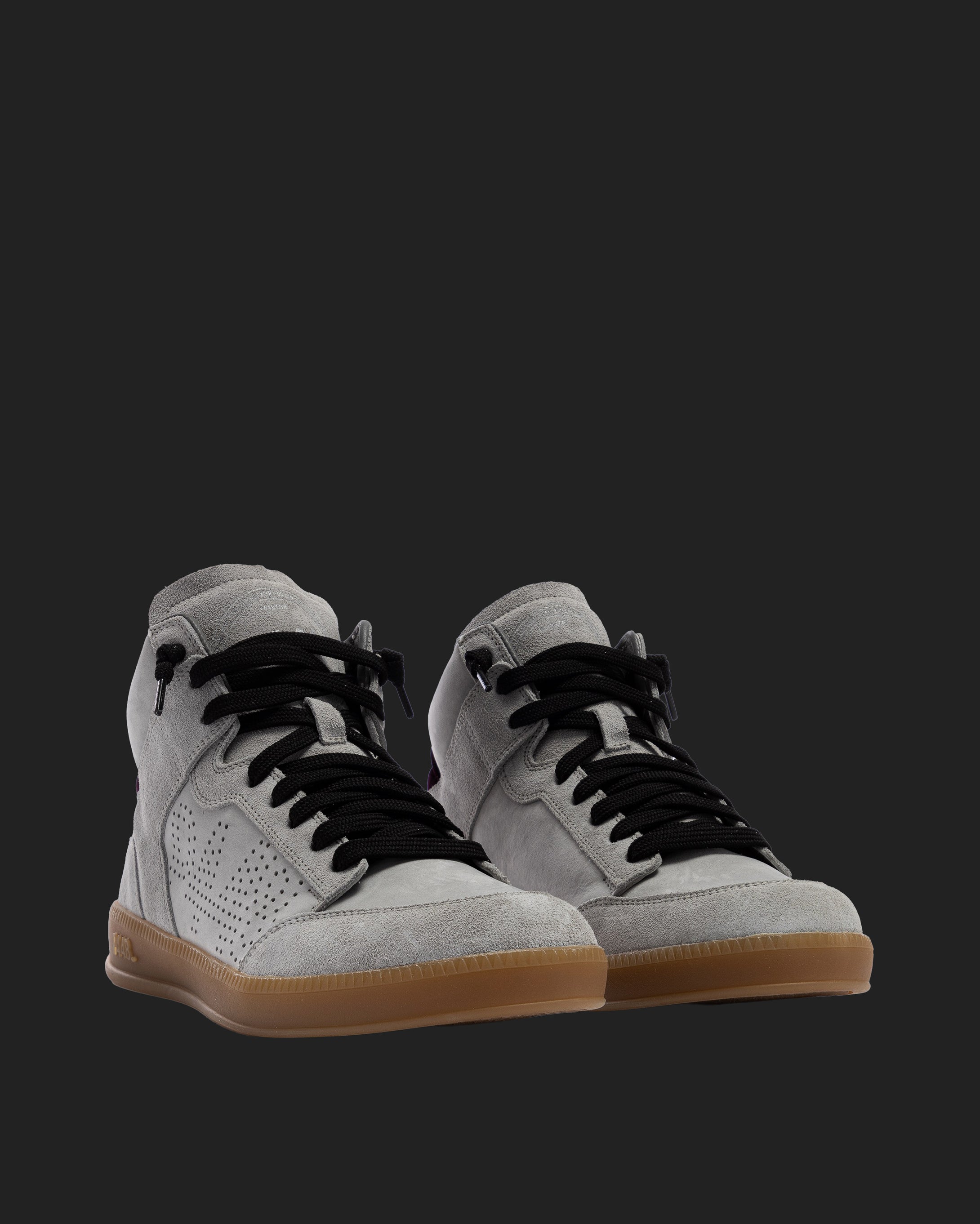 The London Grey features all-over light grey nubuck leather and suede accented by a burgundy velvet heel tab. Black laces and our signature P448 amber gum soles tie it all together.