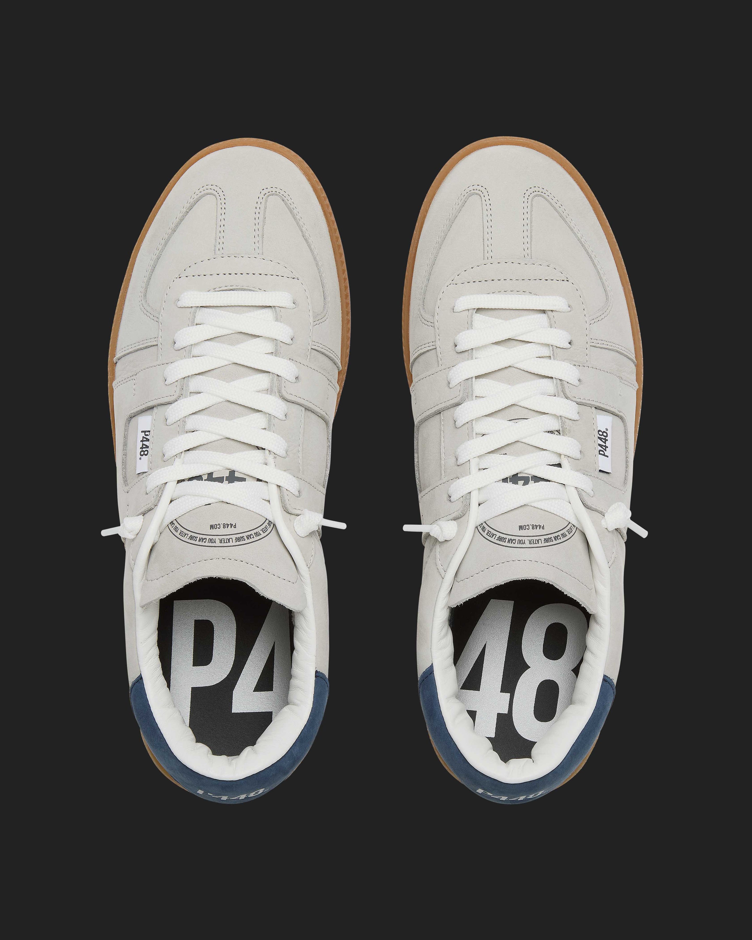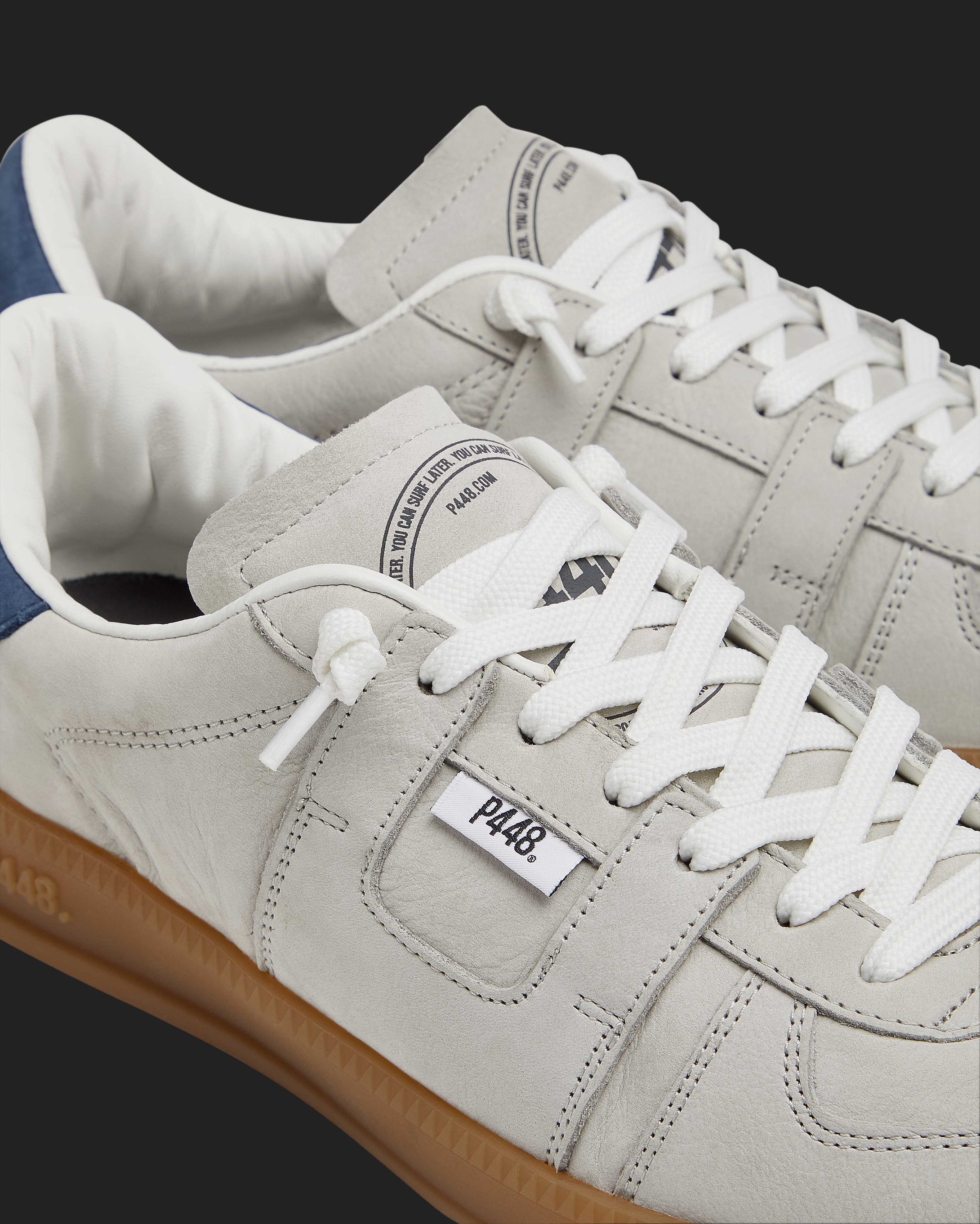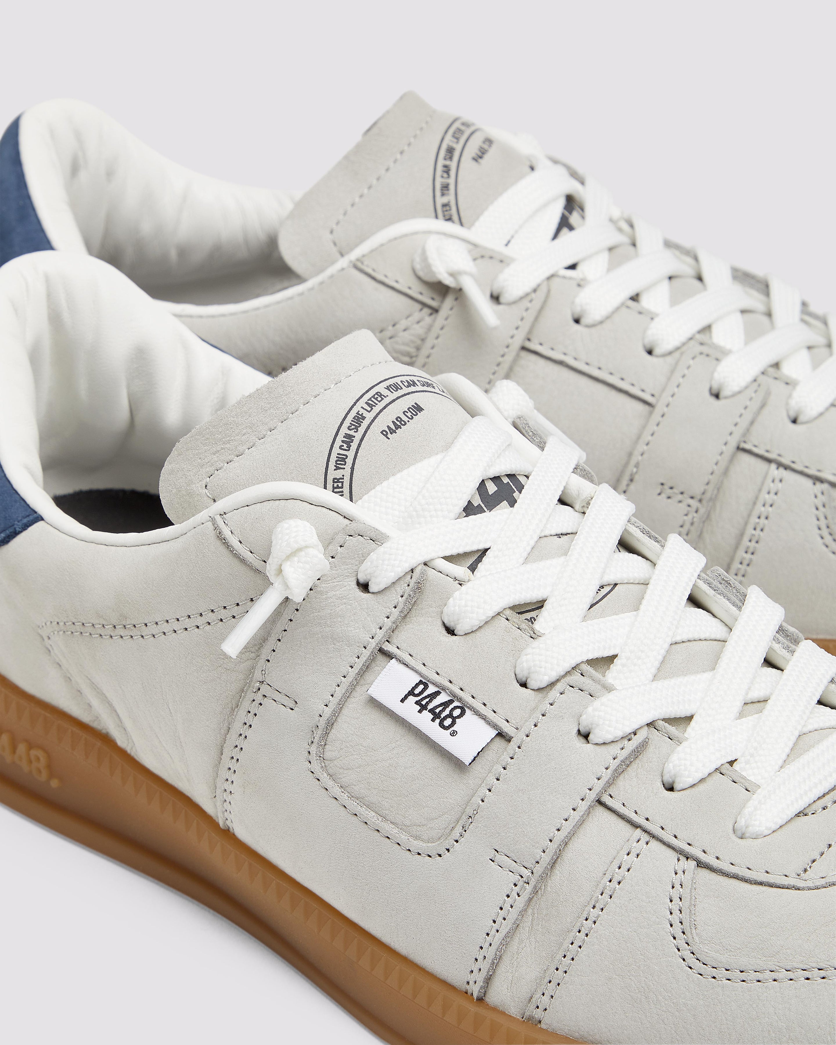 The Monza Grey/Navy features an all-over light grey nubuck leather upper with matching tongue, trim, and toe, accented by a navy blue leather heel tab and white cotton laces for a clean contrast. Finished with our signature P448 gum sole and memory foam insole for all-day comfort and timeless style.