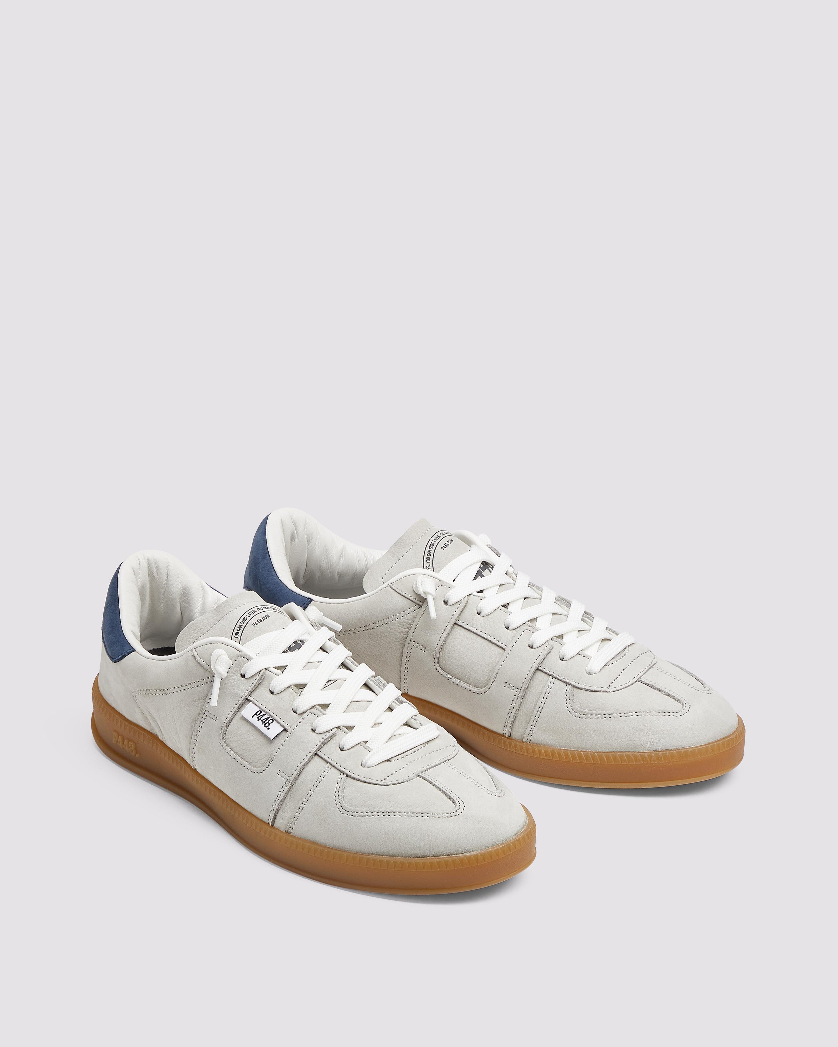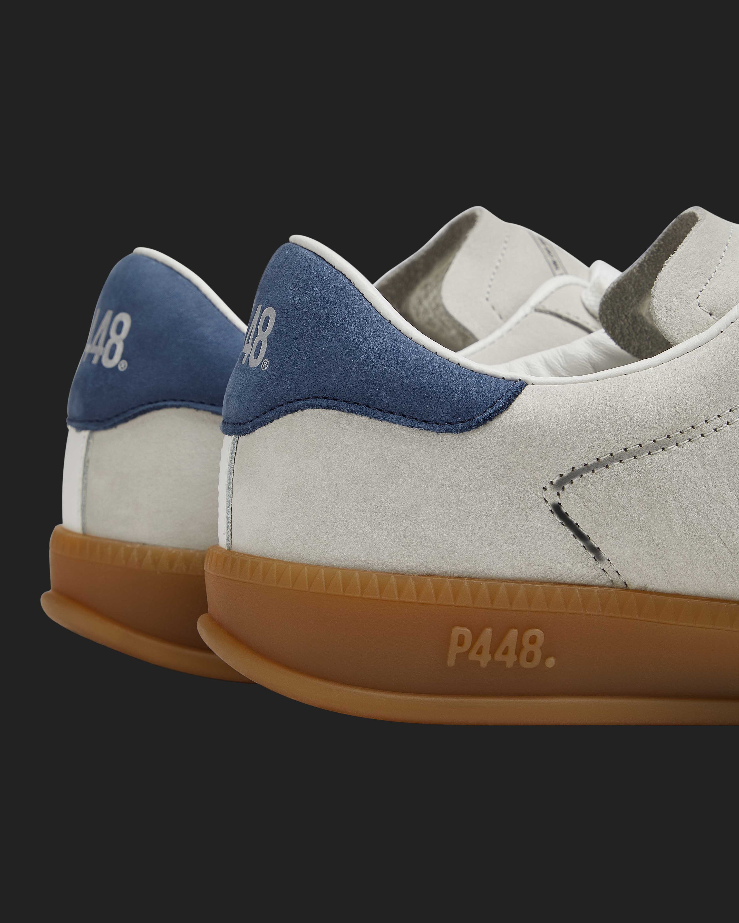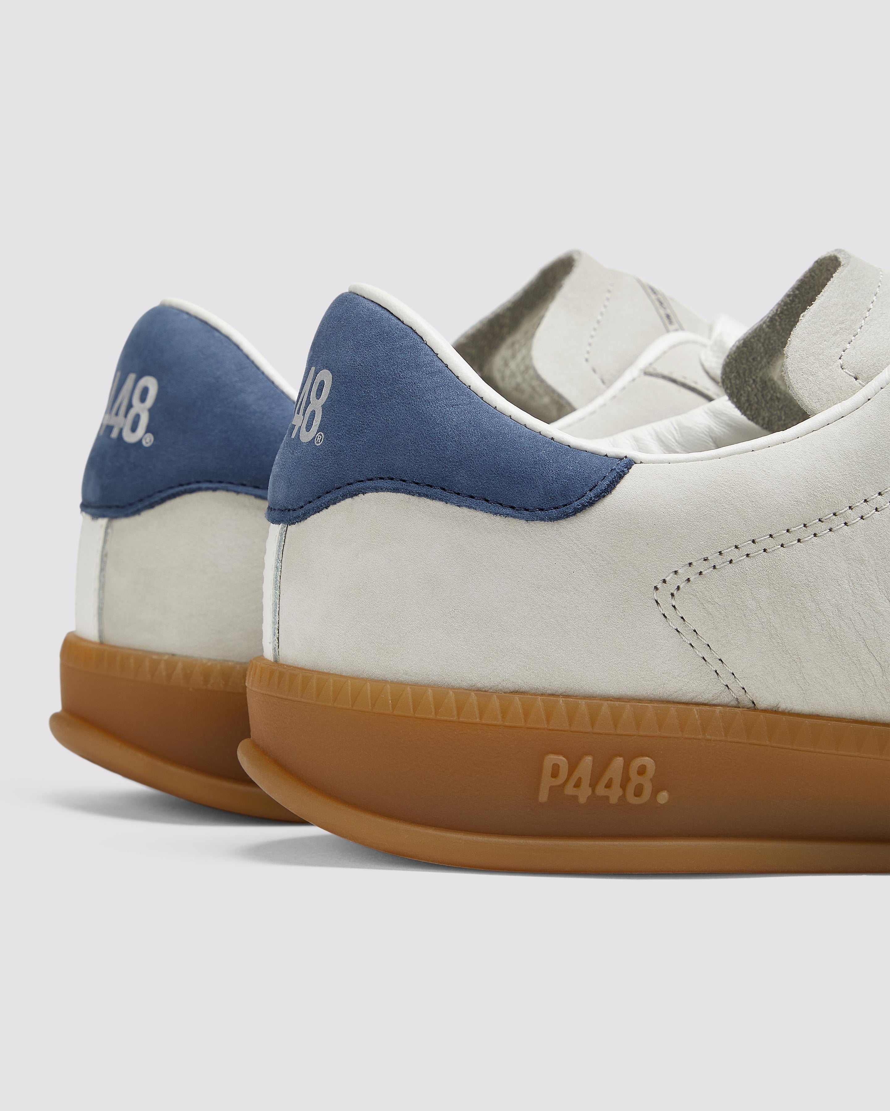 The Monza Grey/Navy features an all-over light grey nubuck leather upper with matching tongue, trim, and toe, accented by a navy blue leather heel tab and white cotton laces for a clean contrast. Finished with our signature P448 gum sole and memory foam insole for all-day comfort and timeless style.