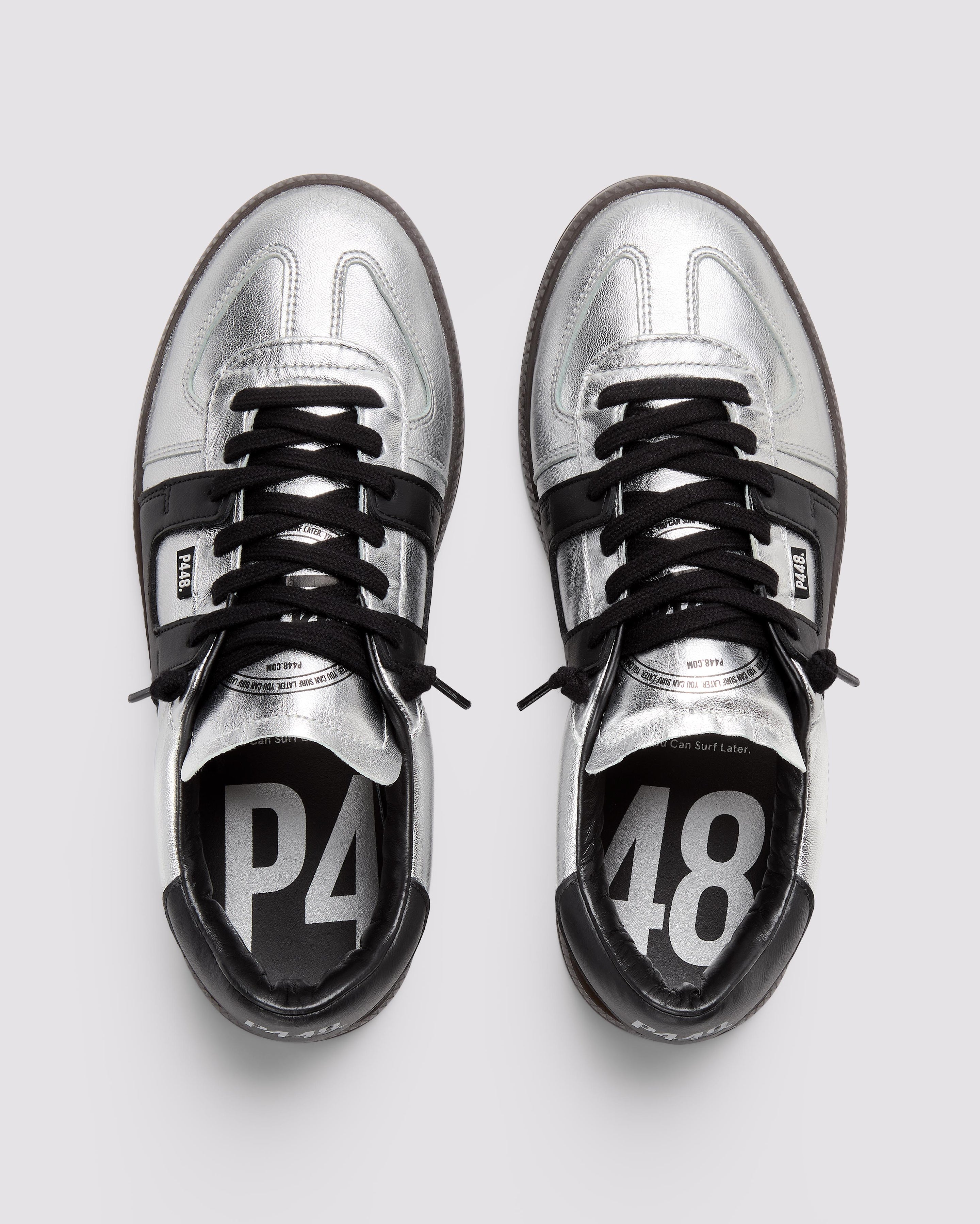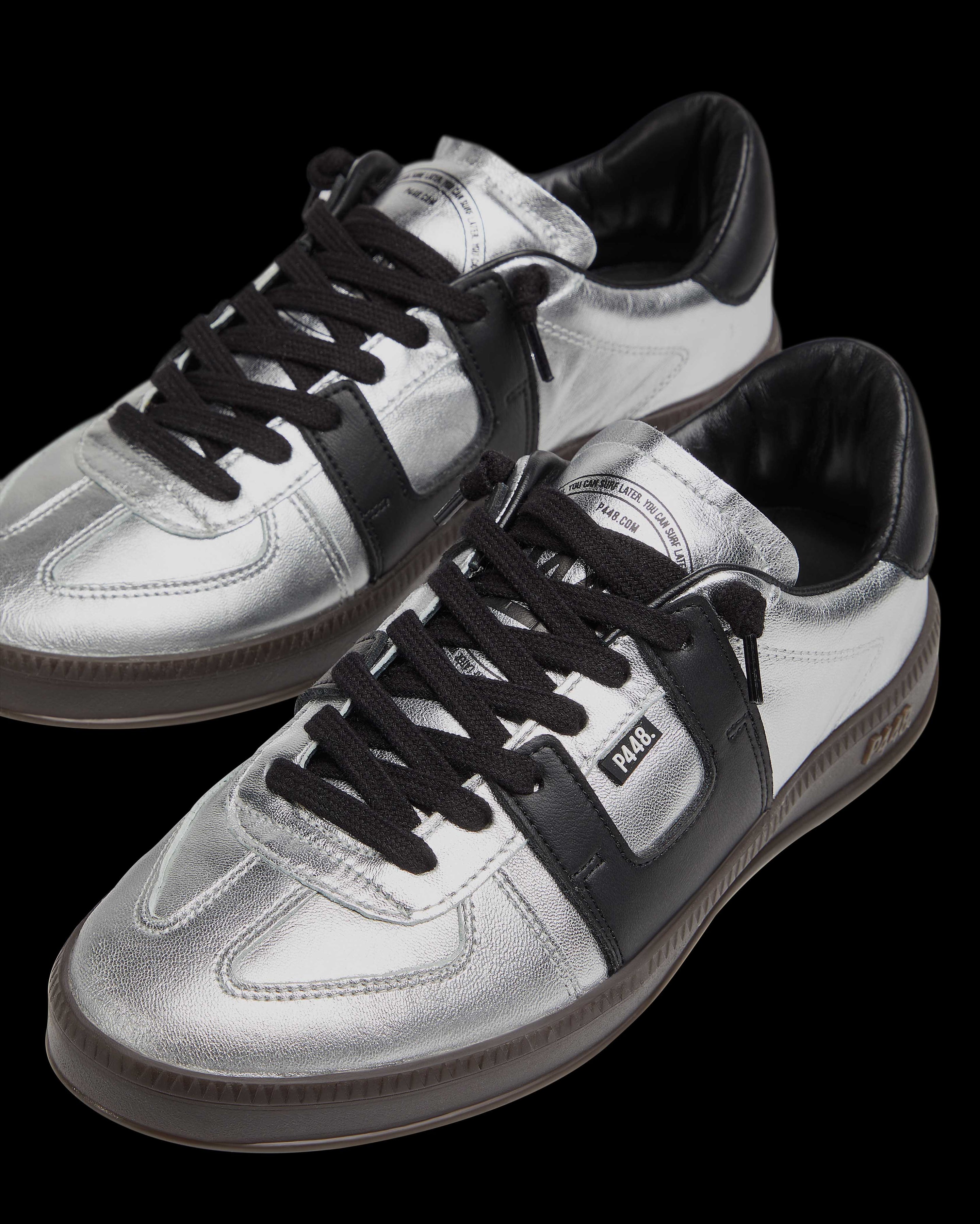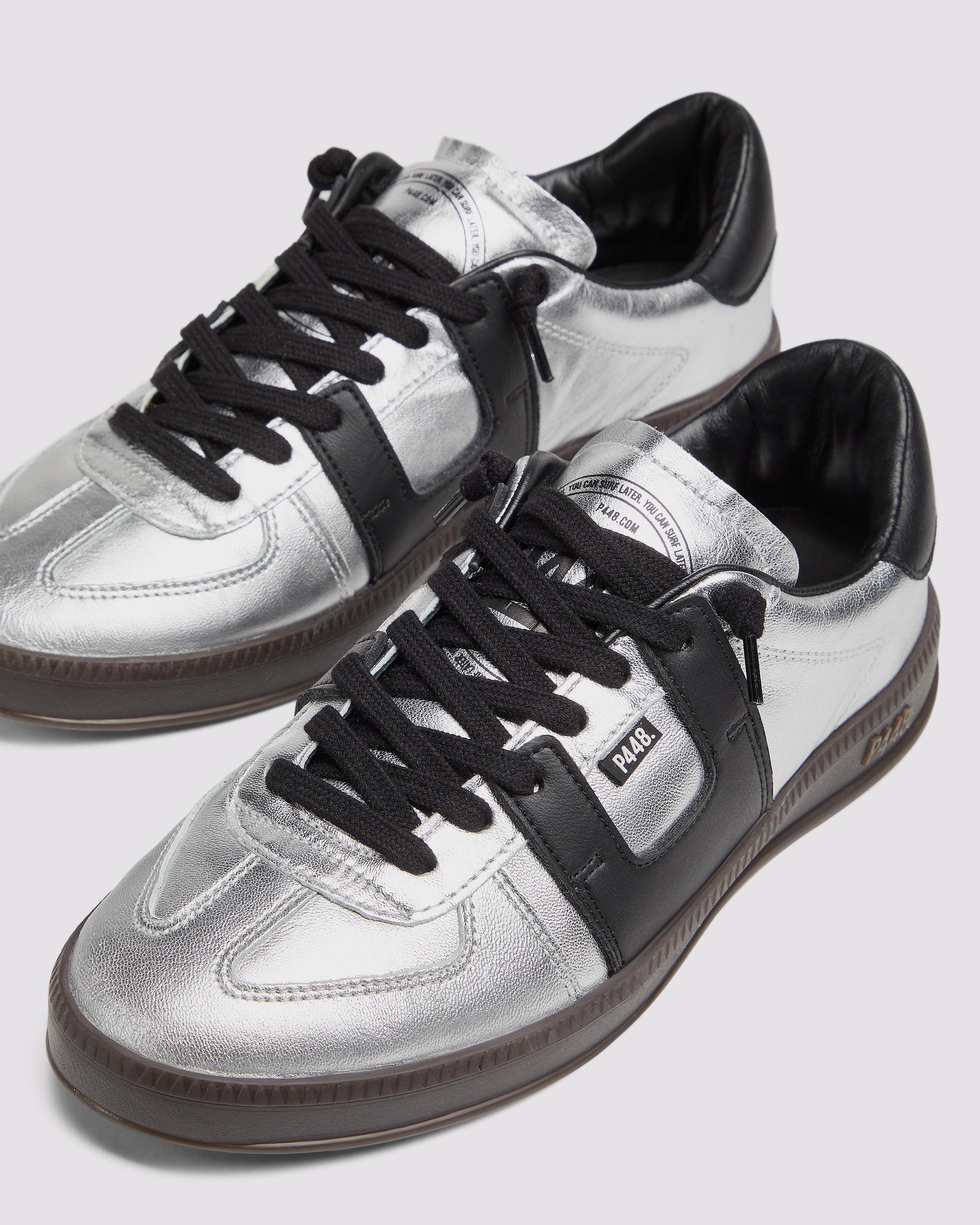 The Monza Silver features all-over silver leather accented by a black leather heel tab & trim. Black cotton laces and our signature P448 dark brown rubber soles finish off the look.