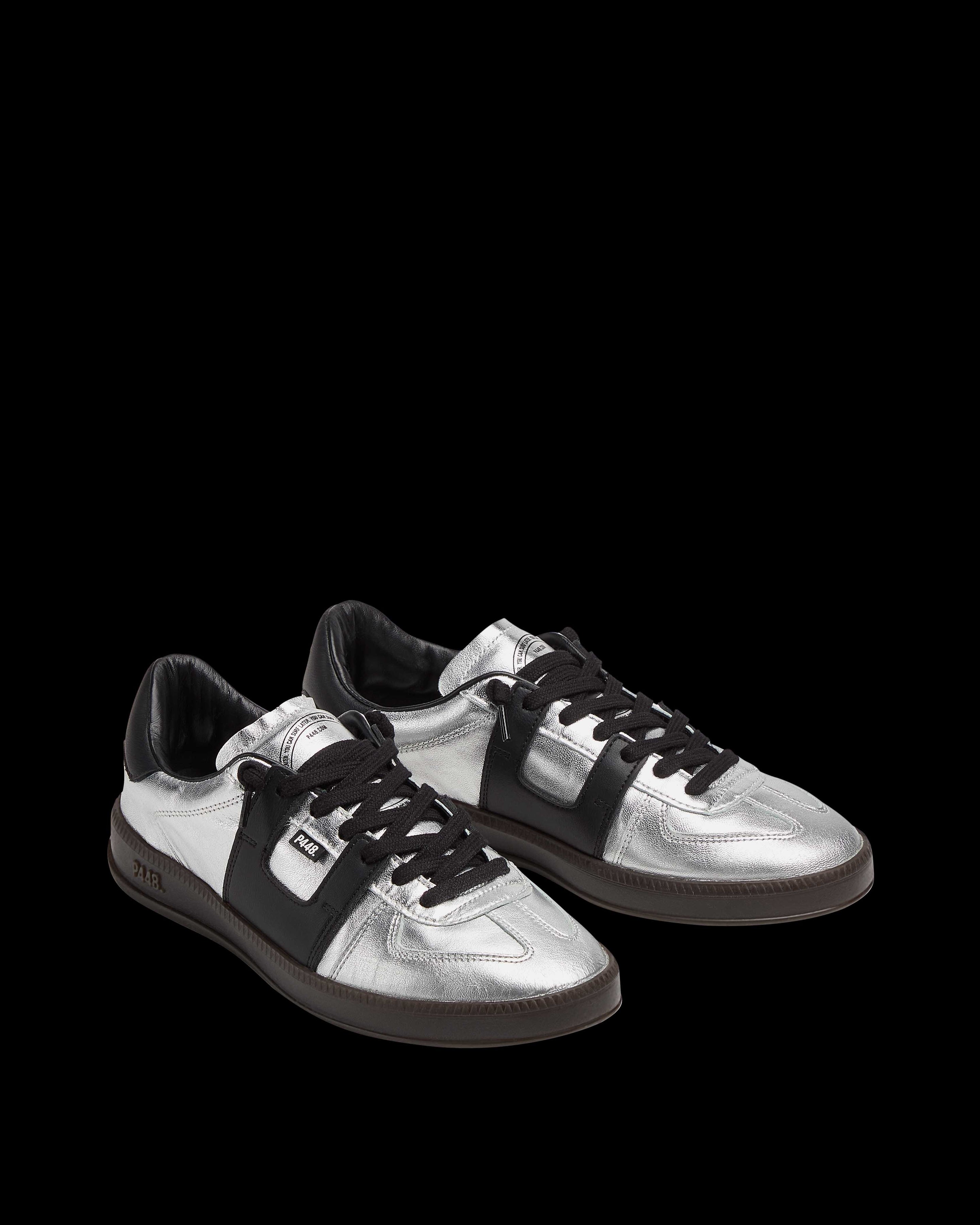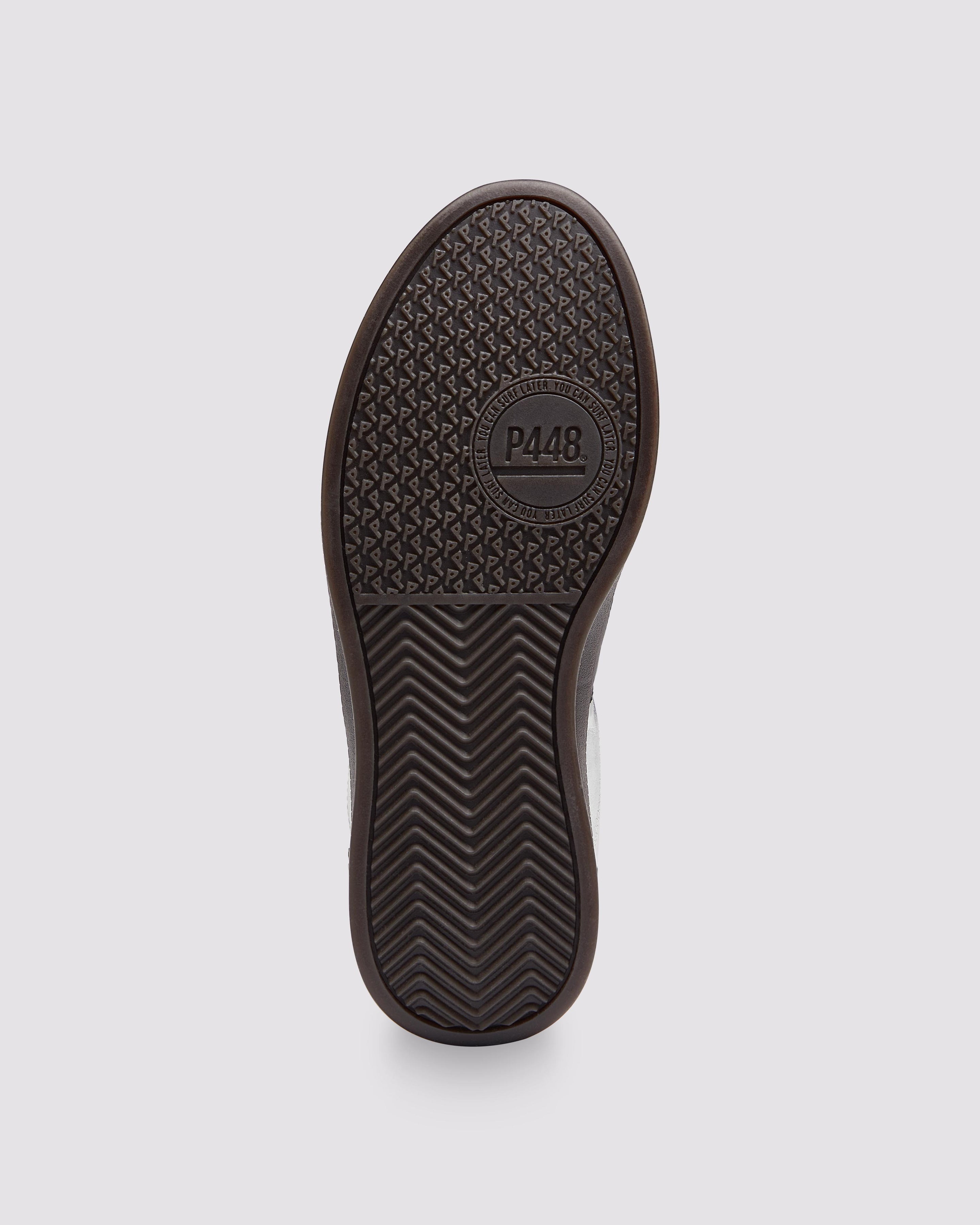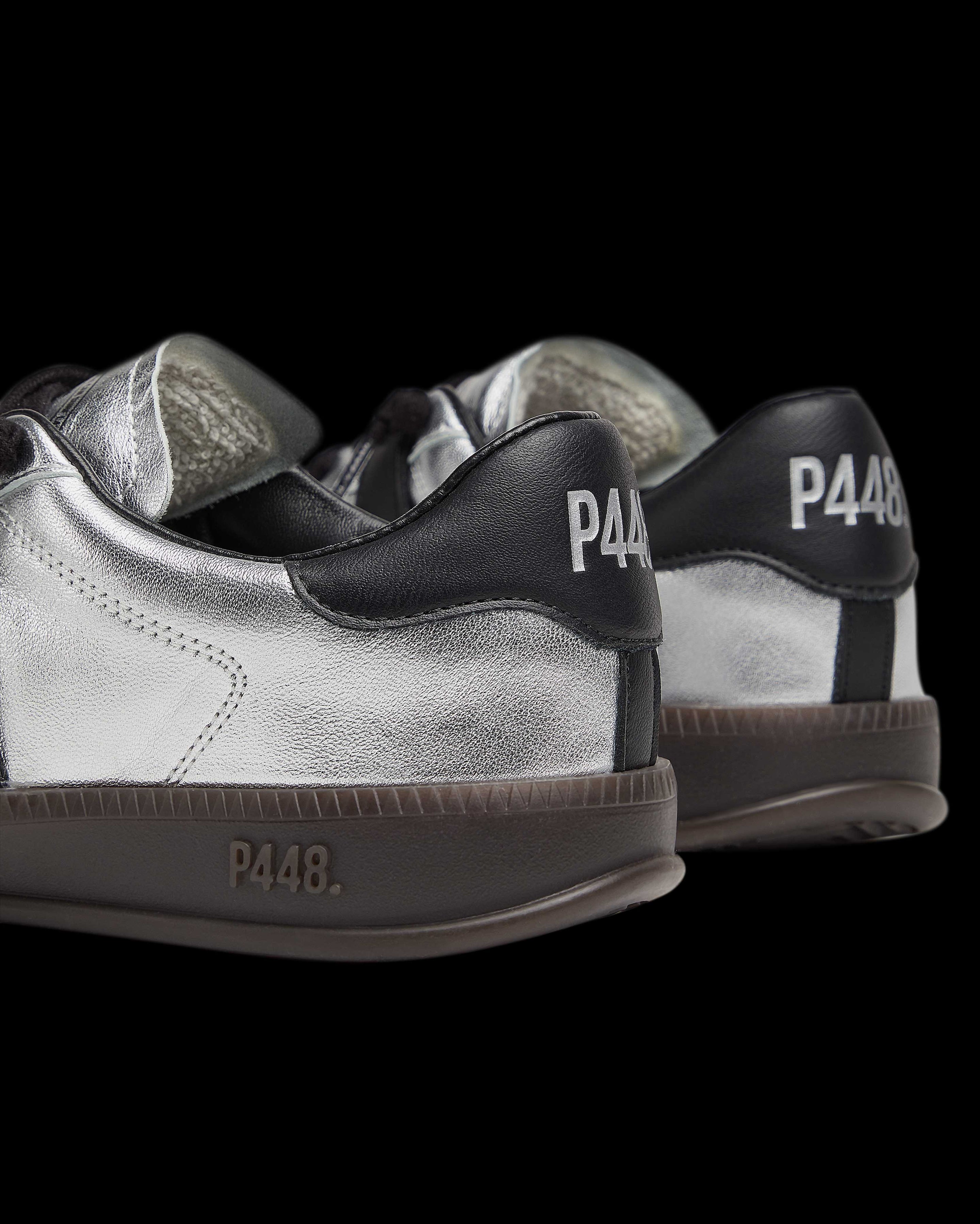 The Monza Silver features all-over silver leather accented by a black leather heel tab & trim. Black cotton laces and our signature P448 dark brown rubber soles finish off the look.