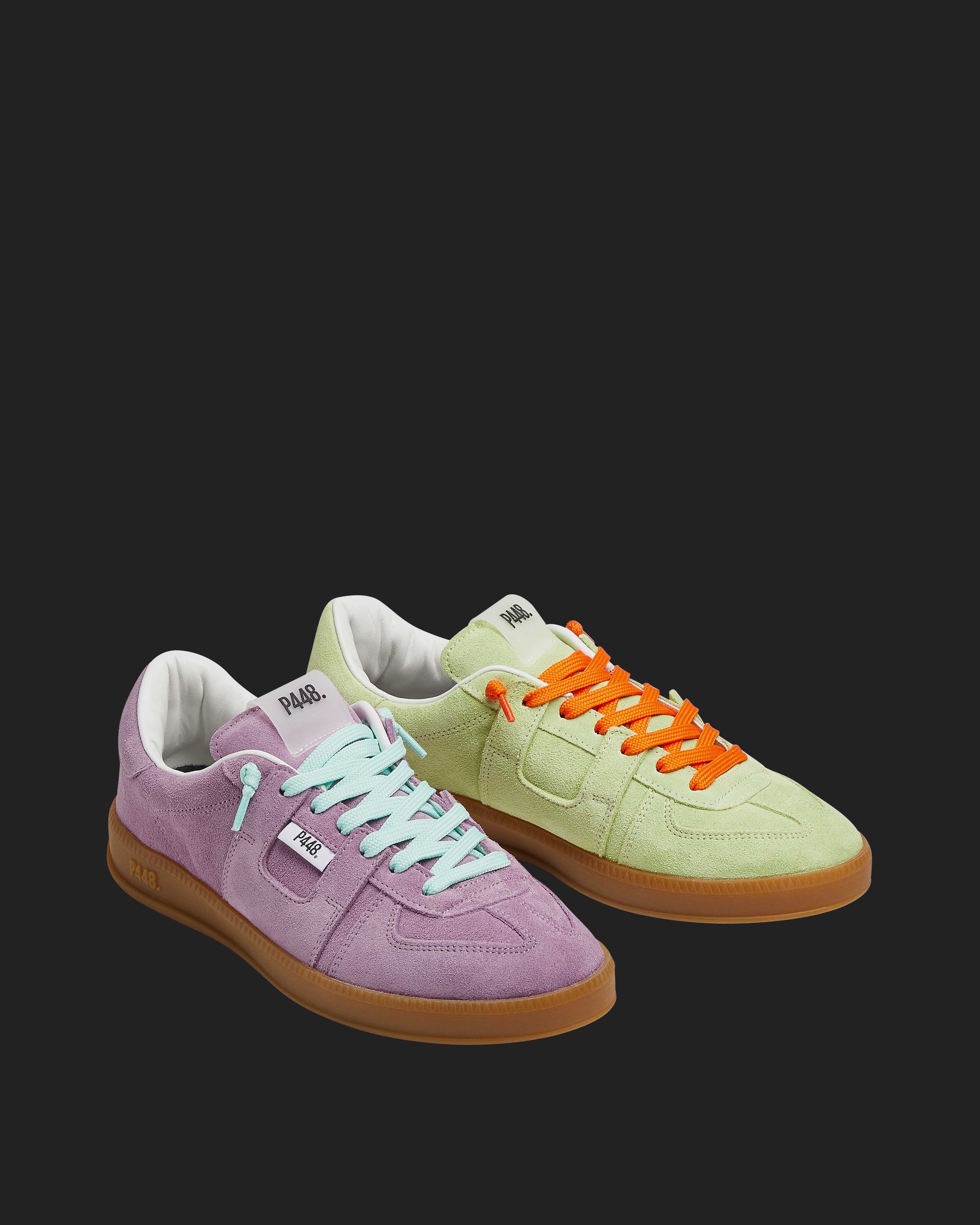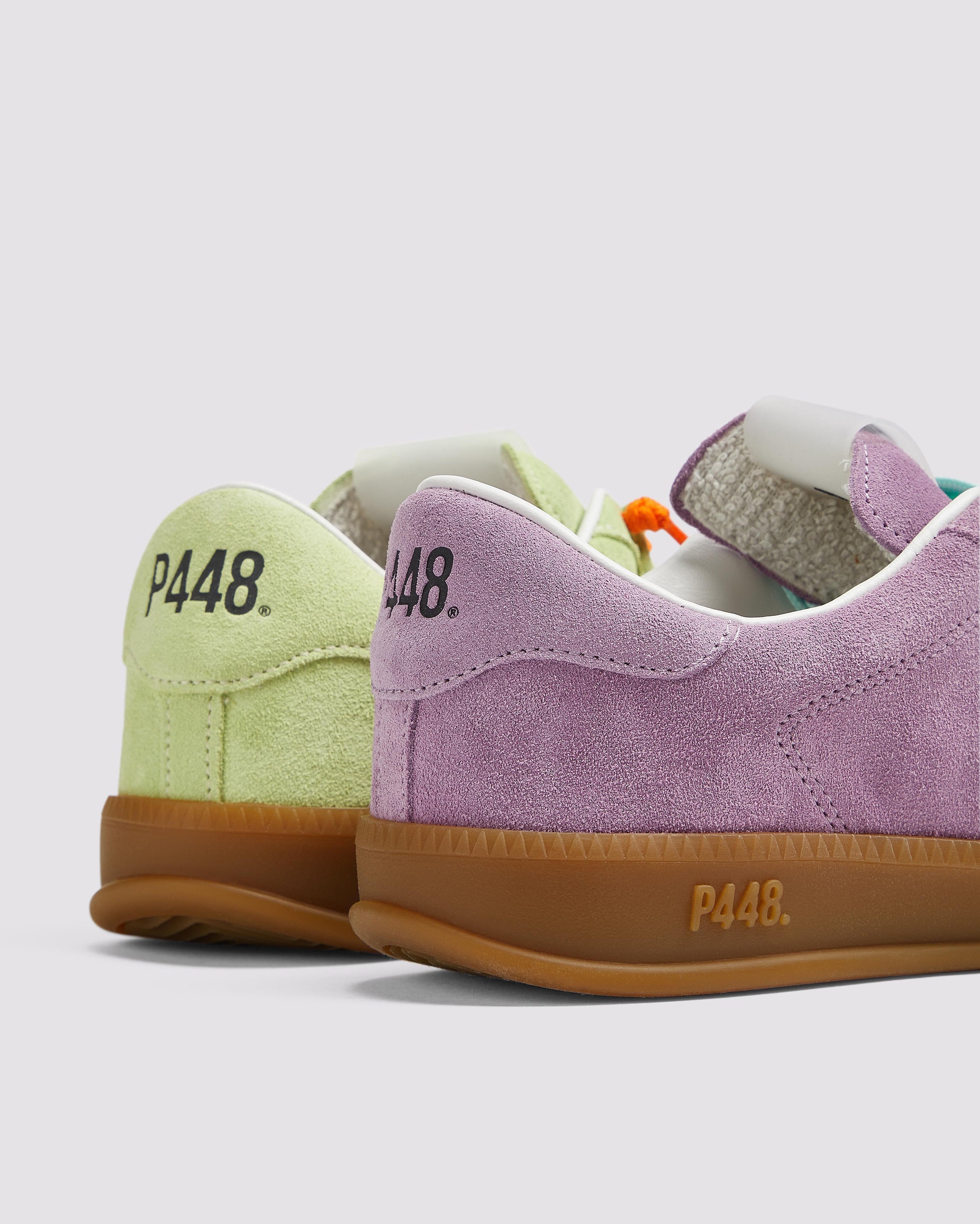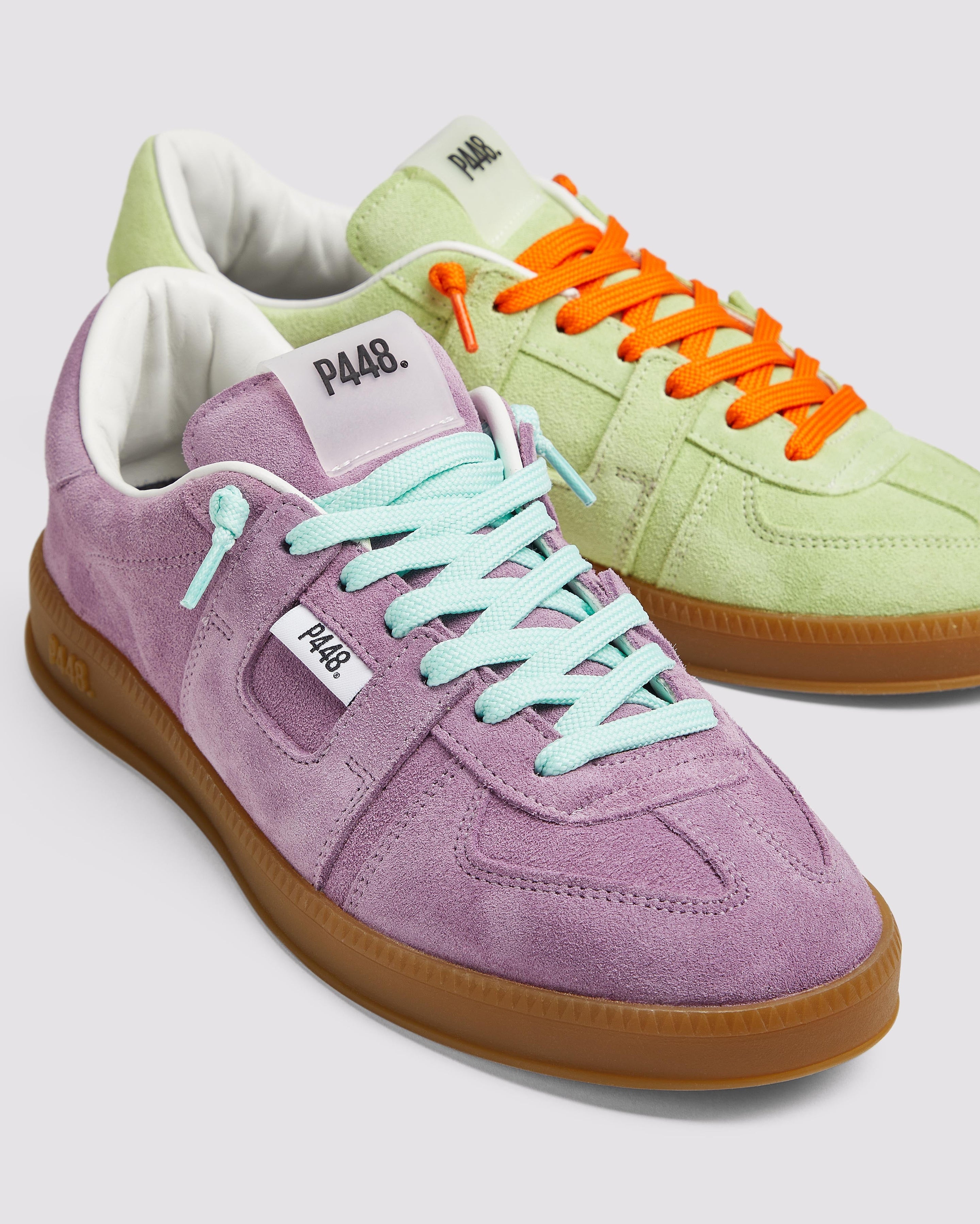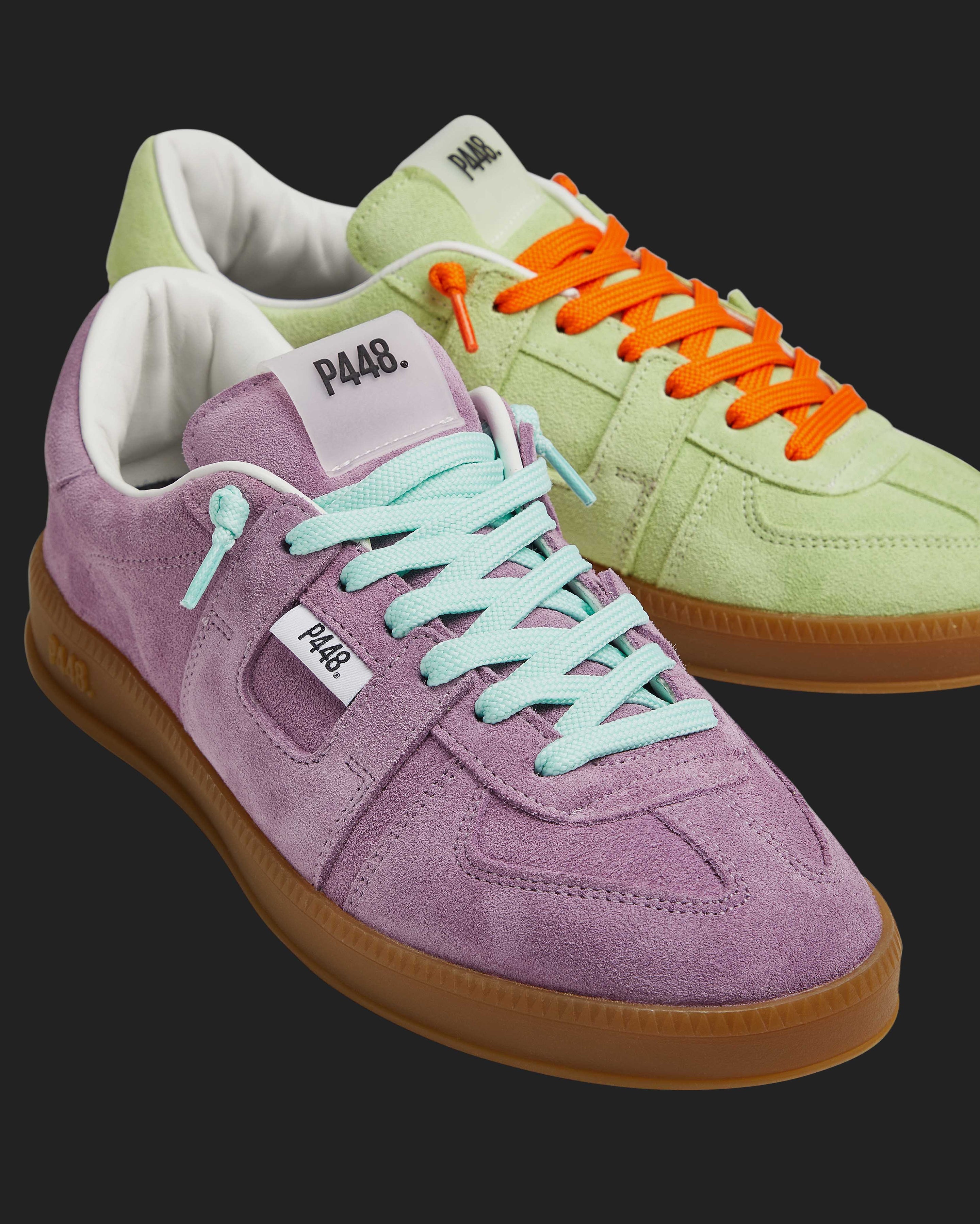 Both feature matching suede tongues, trims, toes, and heel accents. Light blue laces on one and orange laces on the other, along with our signature P448 rubber soles finished with black treads, tie it all together.