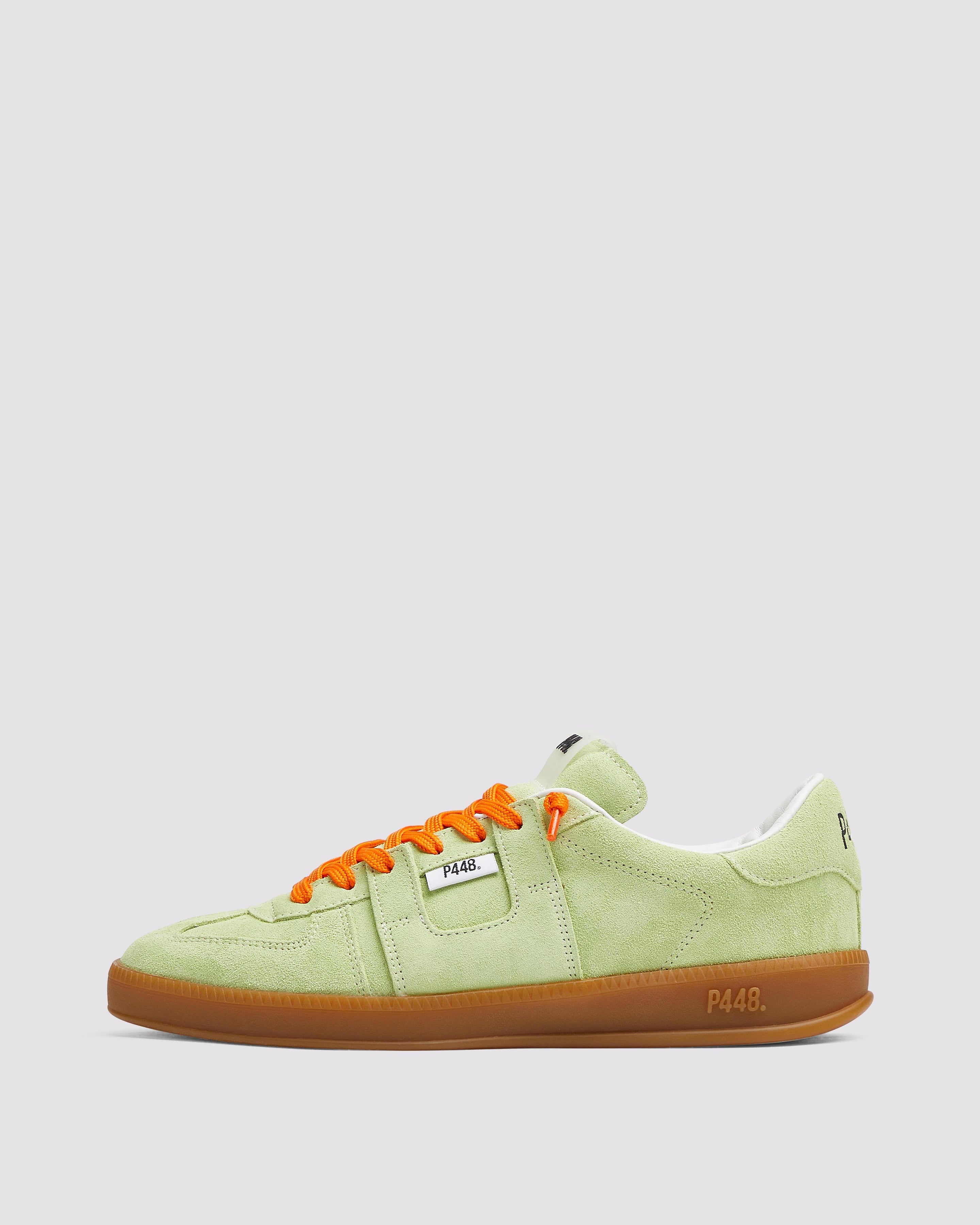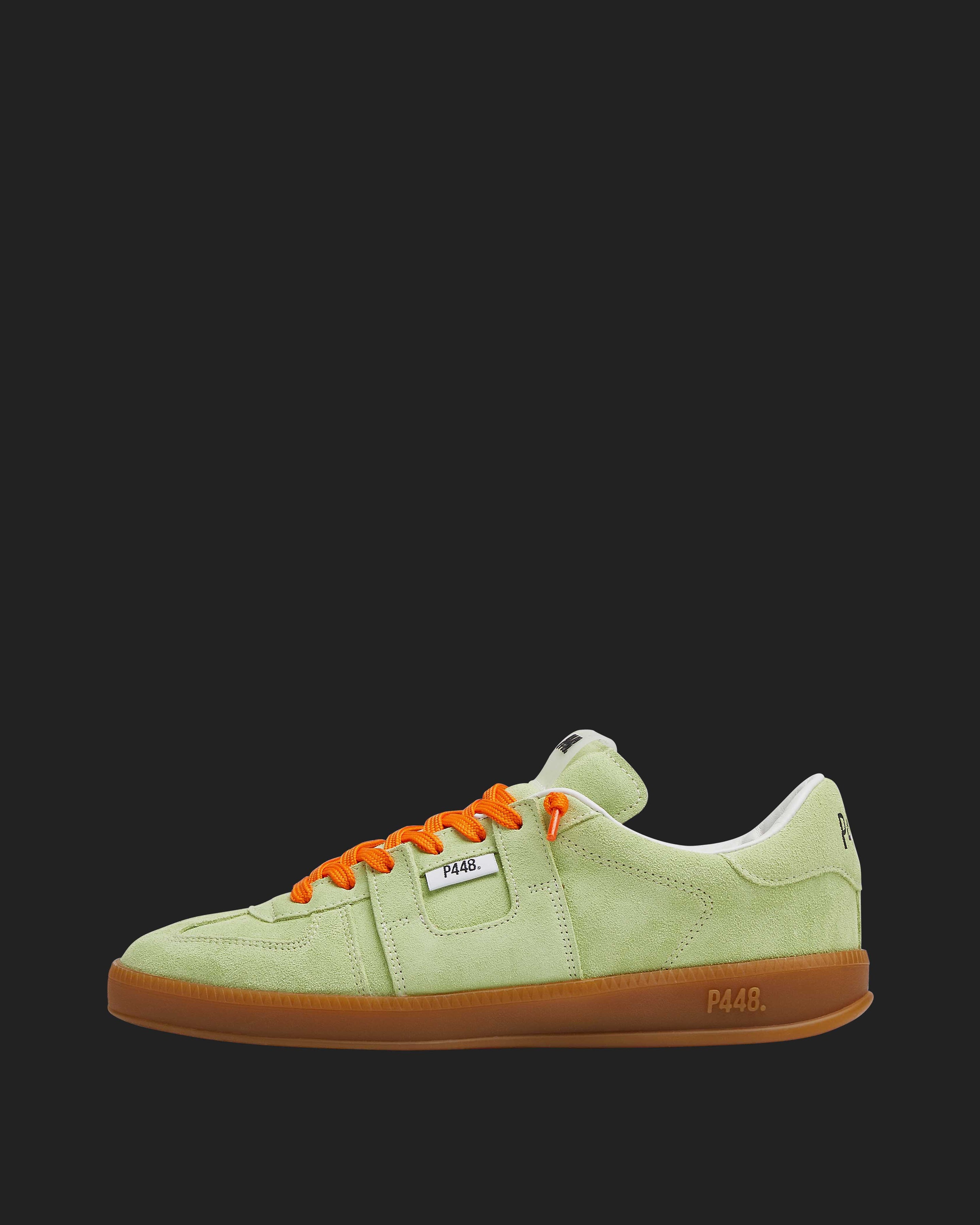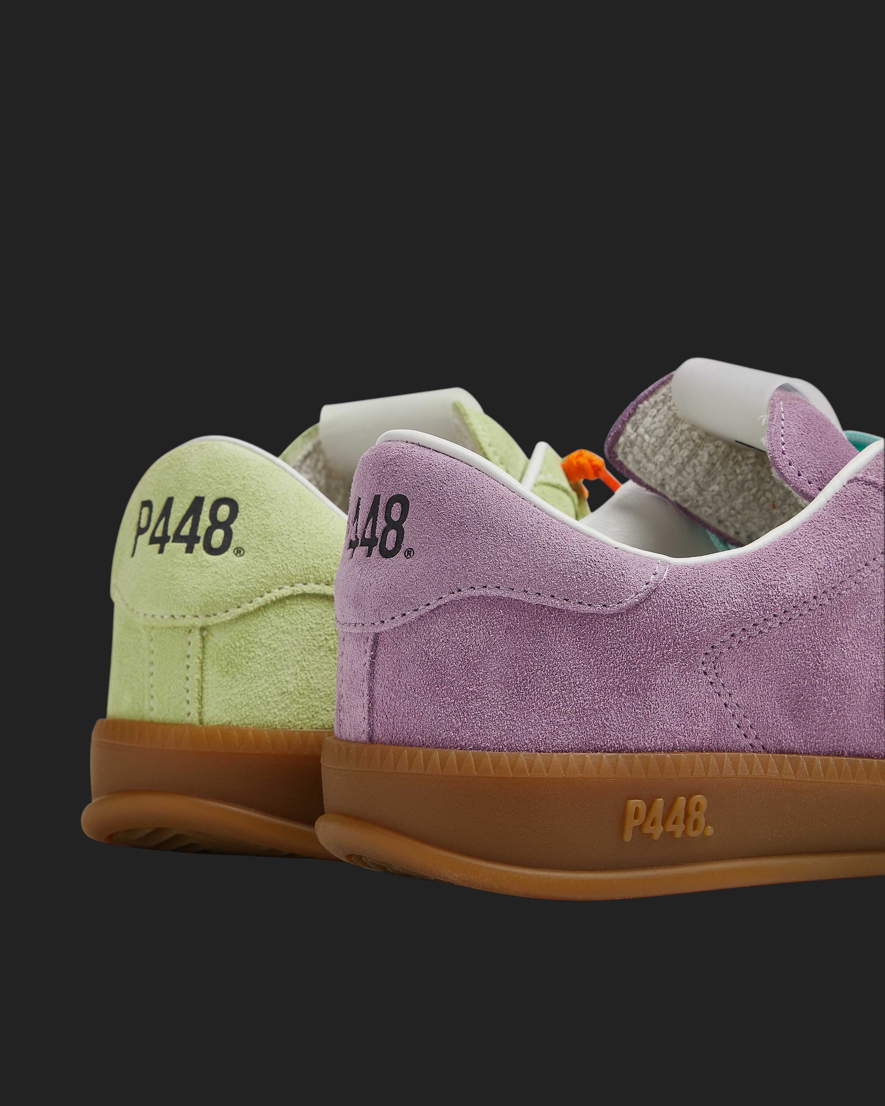 Both feature matching suede tongues, trims, toes, and heel accents. Light blue laces on one and orange laces on the other, along with our signature P448 rubber soles finished with black treads, tie it all together.