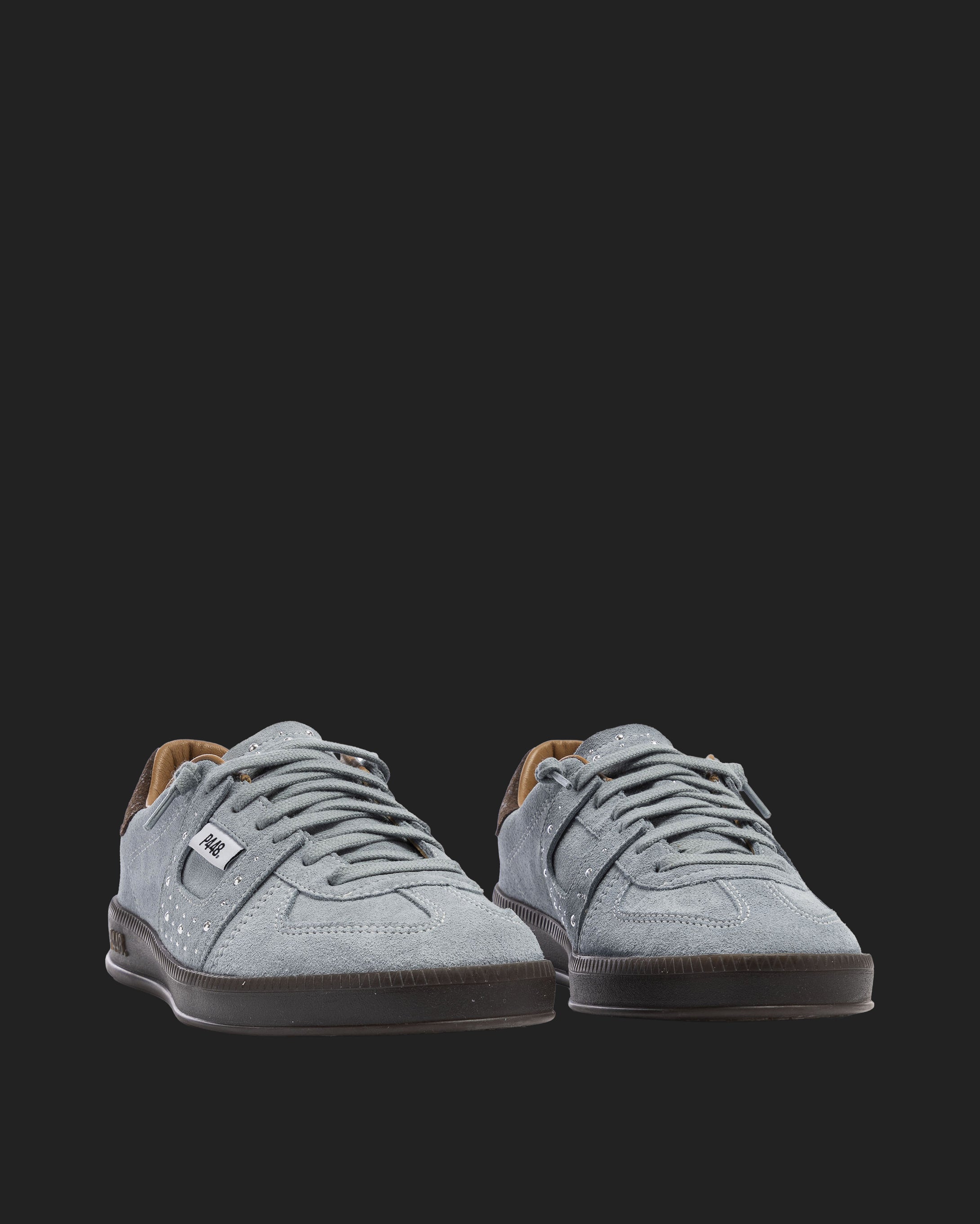 The Monza Blue/Stud features all-over light blue suede complemented by a brown suede heel tab. Embellished silver studs, light blue cotton laces and our P448 dark brown rubber soles tie it all together.