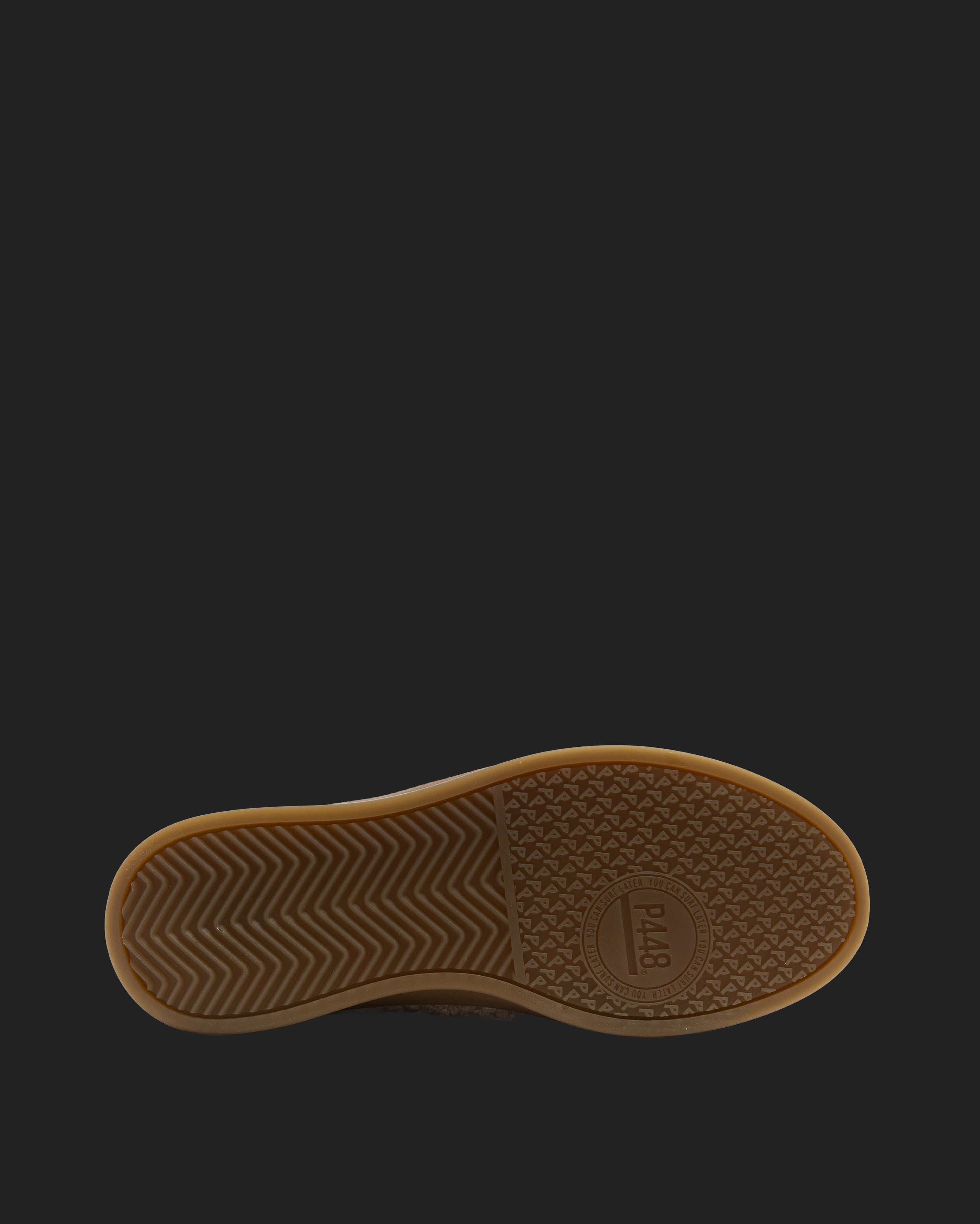 The Monza Teddy features all-over soft cream sherpa finished with our signature P448 amber gum soles and treads. White cotton laces tie the look together.