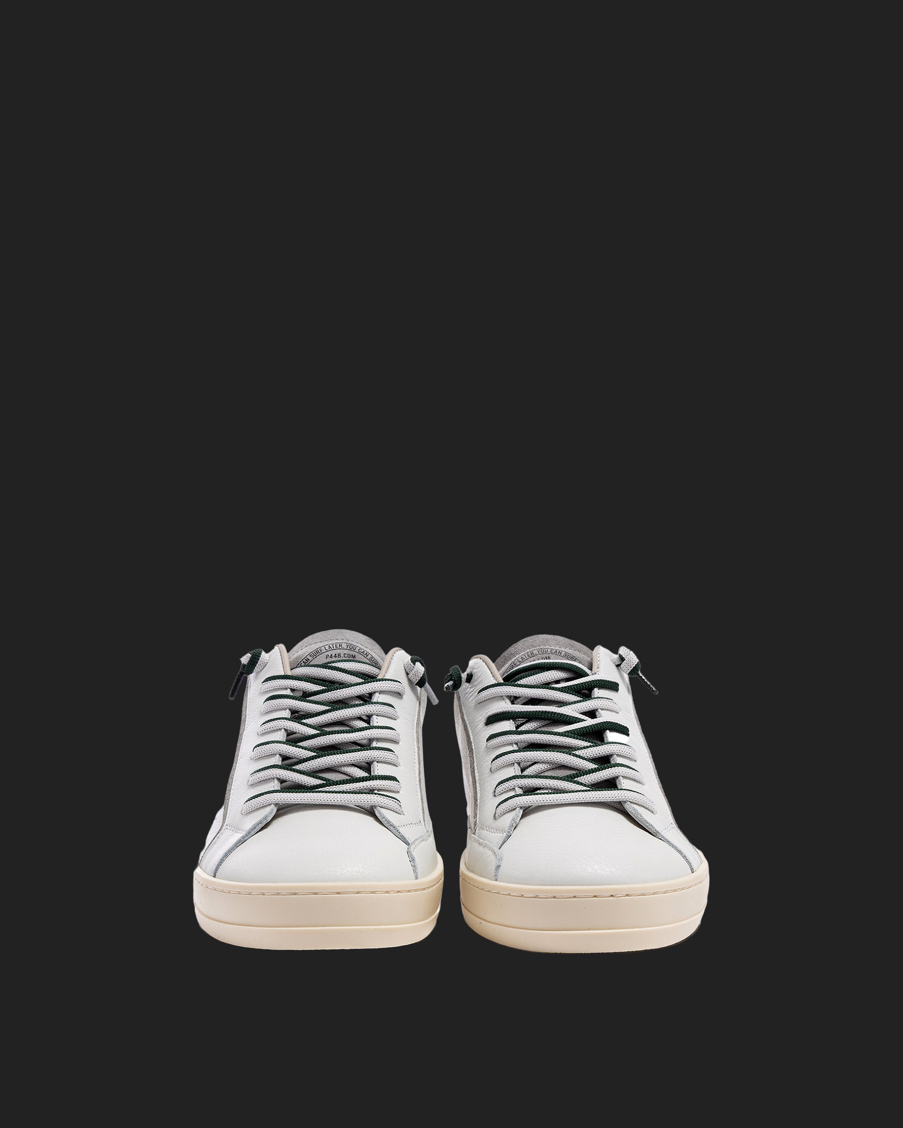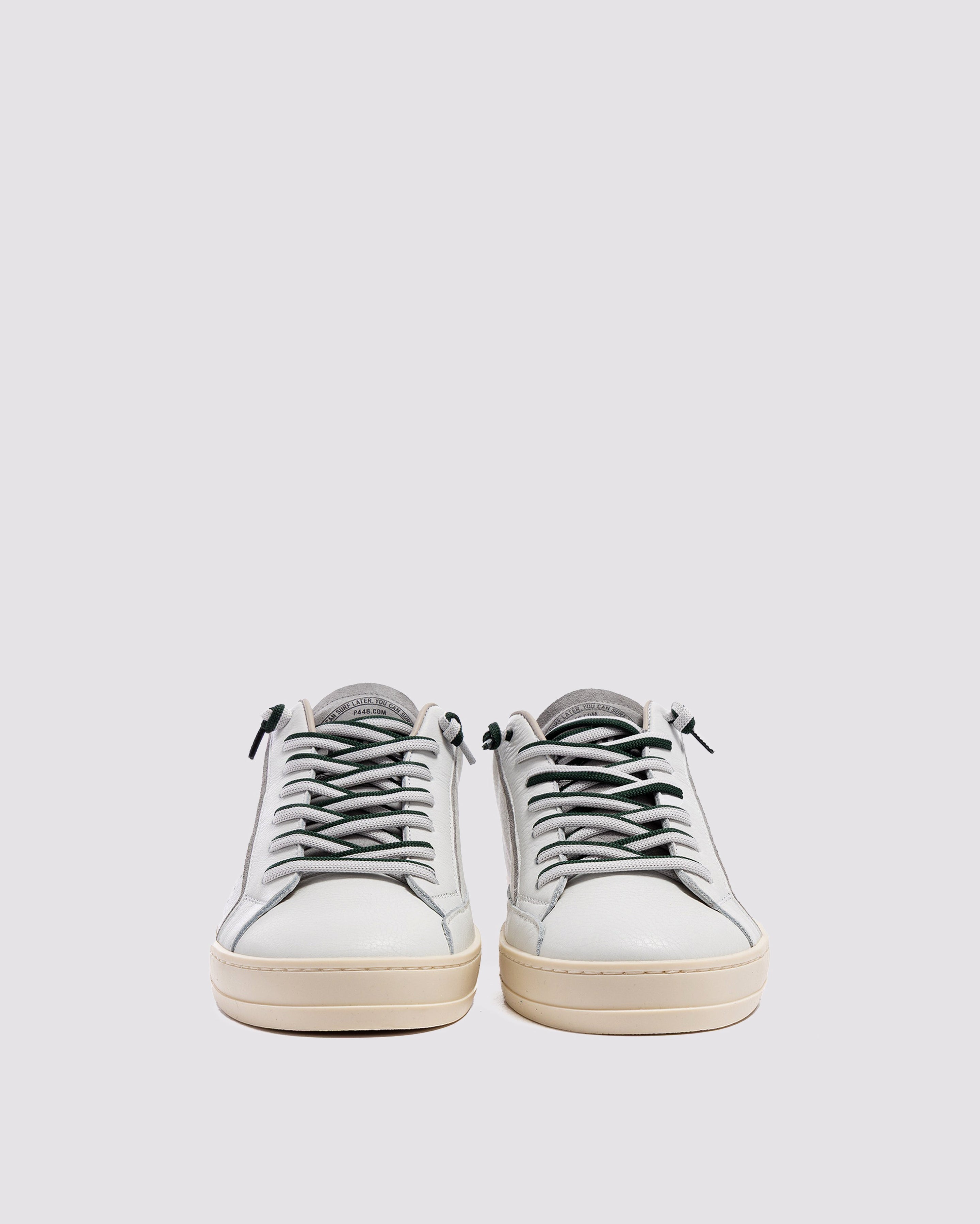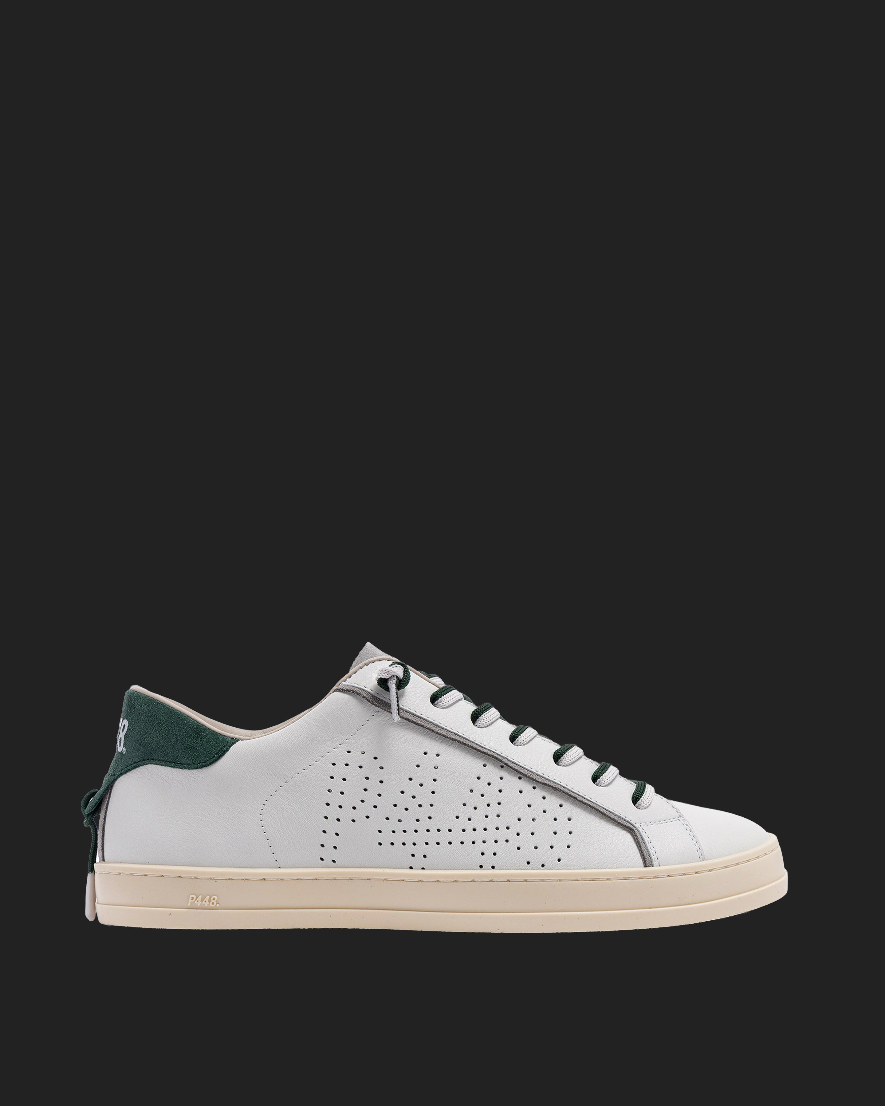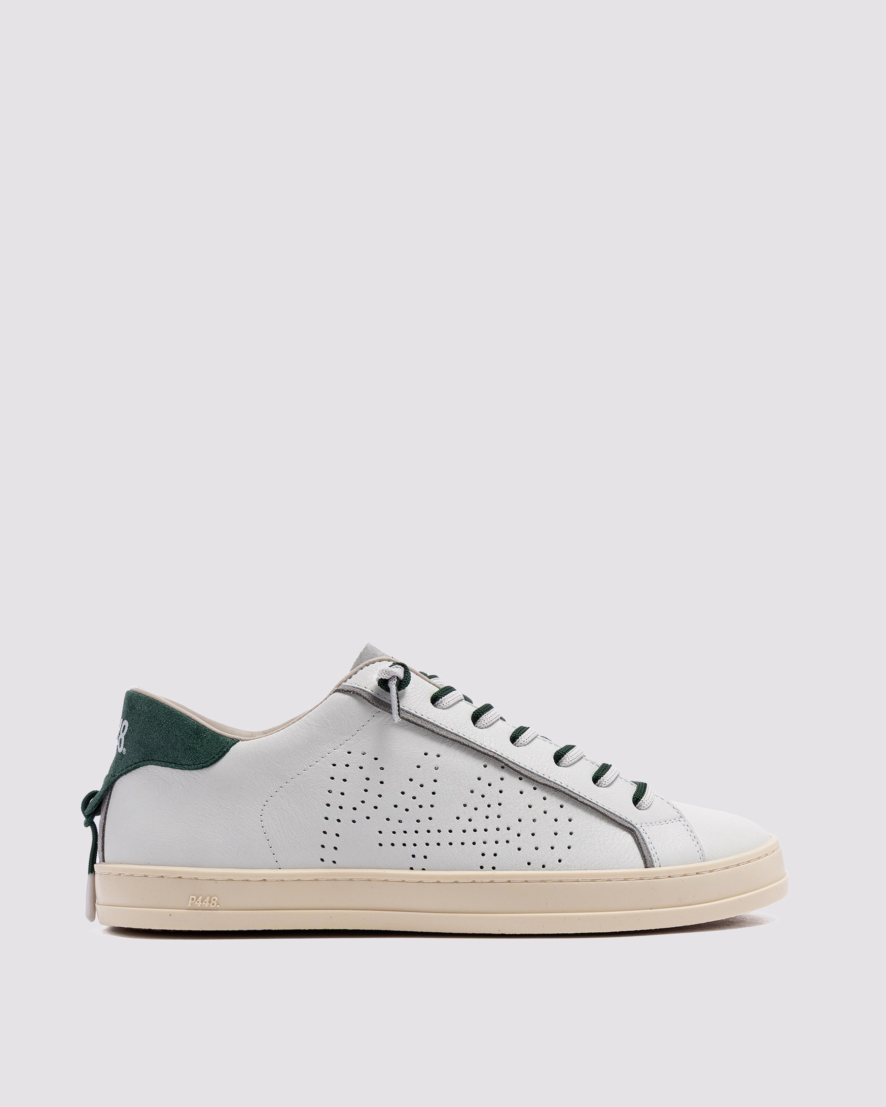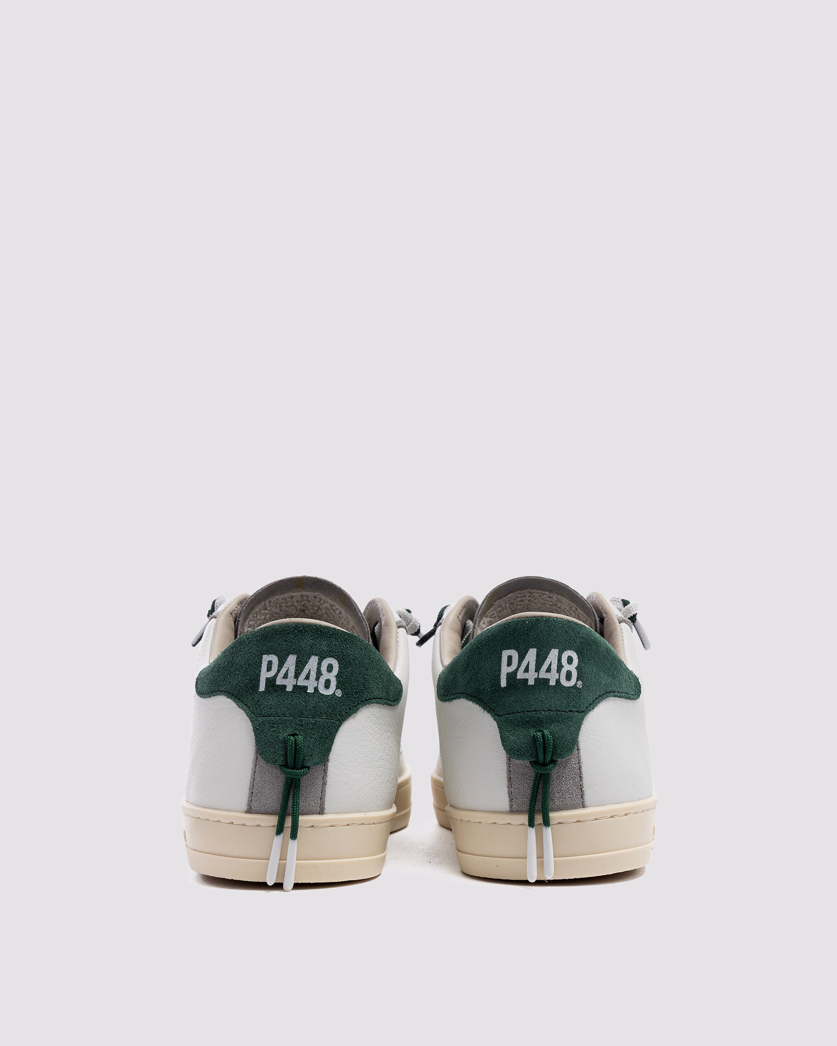 The John White Forrest is wrapped in white leather and grey suede, accented by a green suede heel tab, matching off-white and green laces, finished with a green lace charm. Our signature P448 rubber sole grounds the look. Swap in the extra pair of white laces to tie it all together.