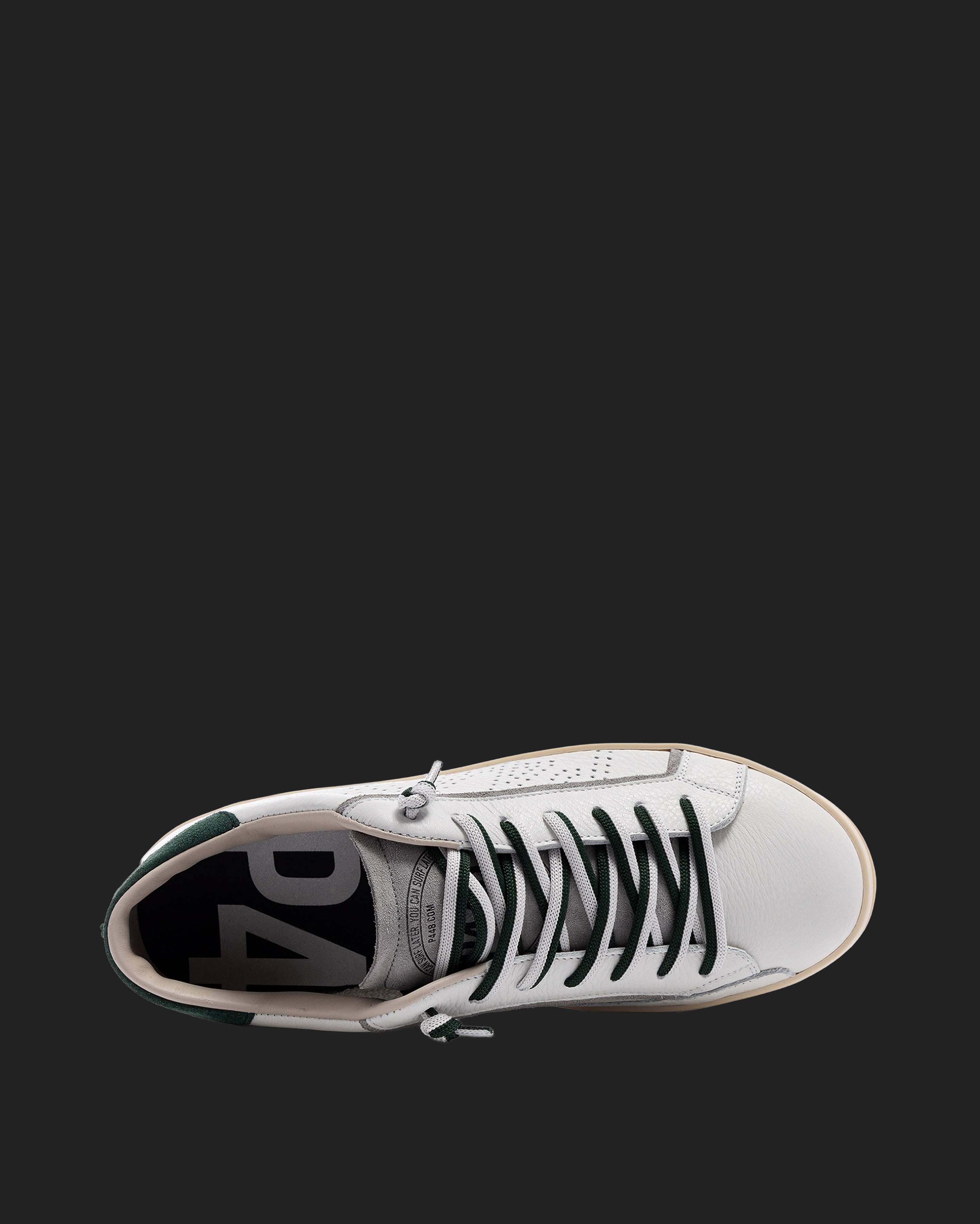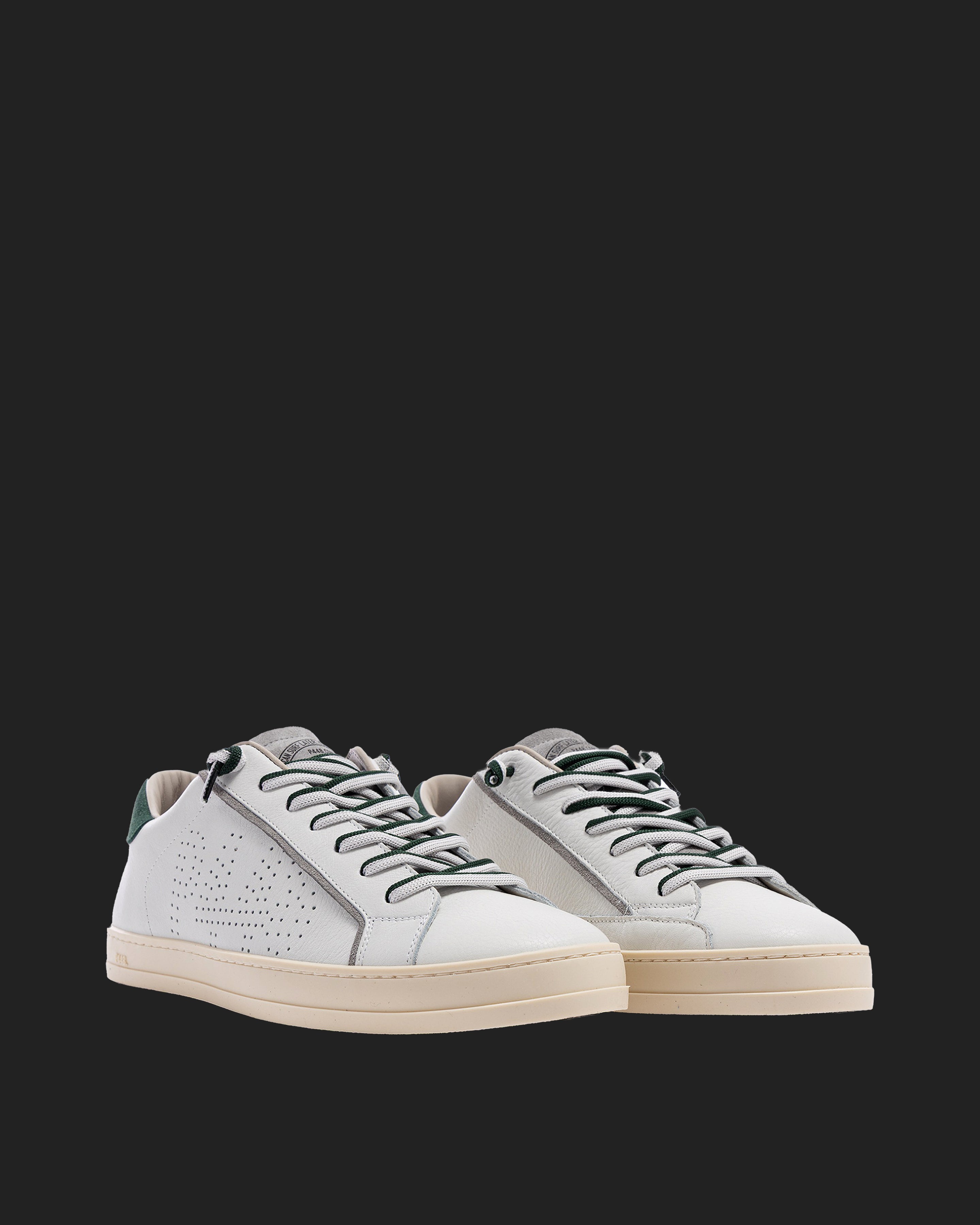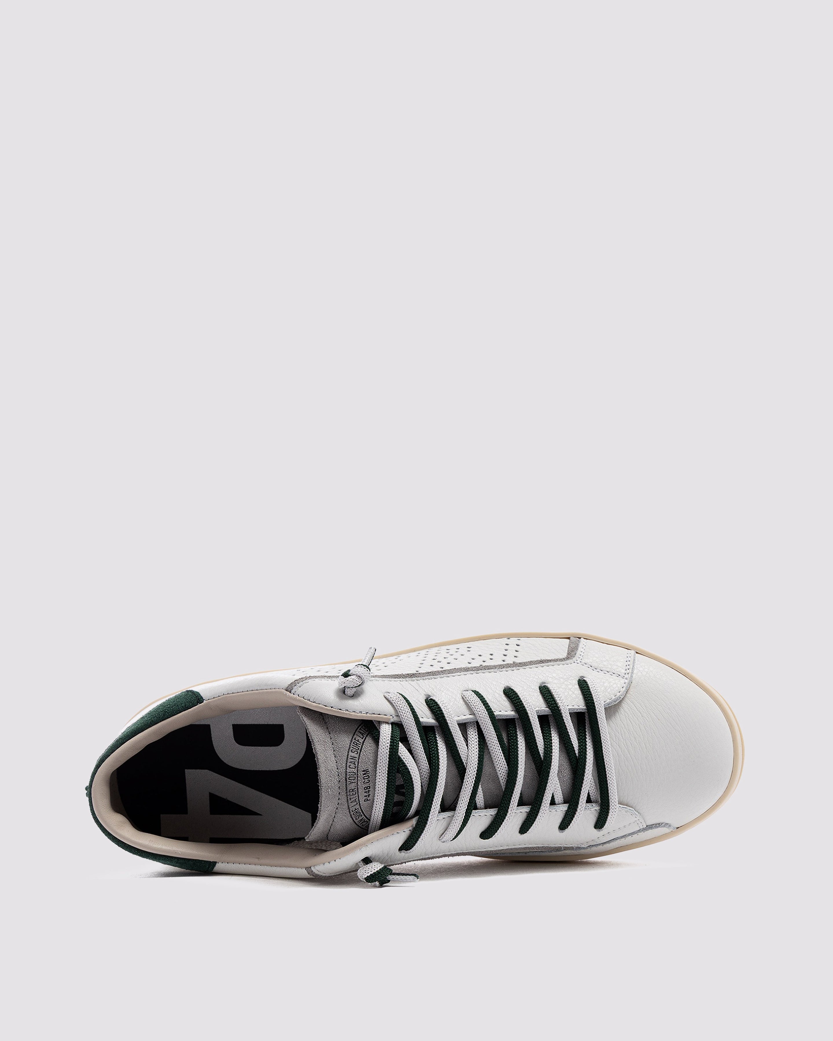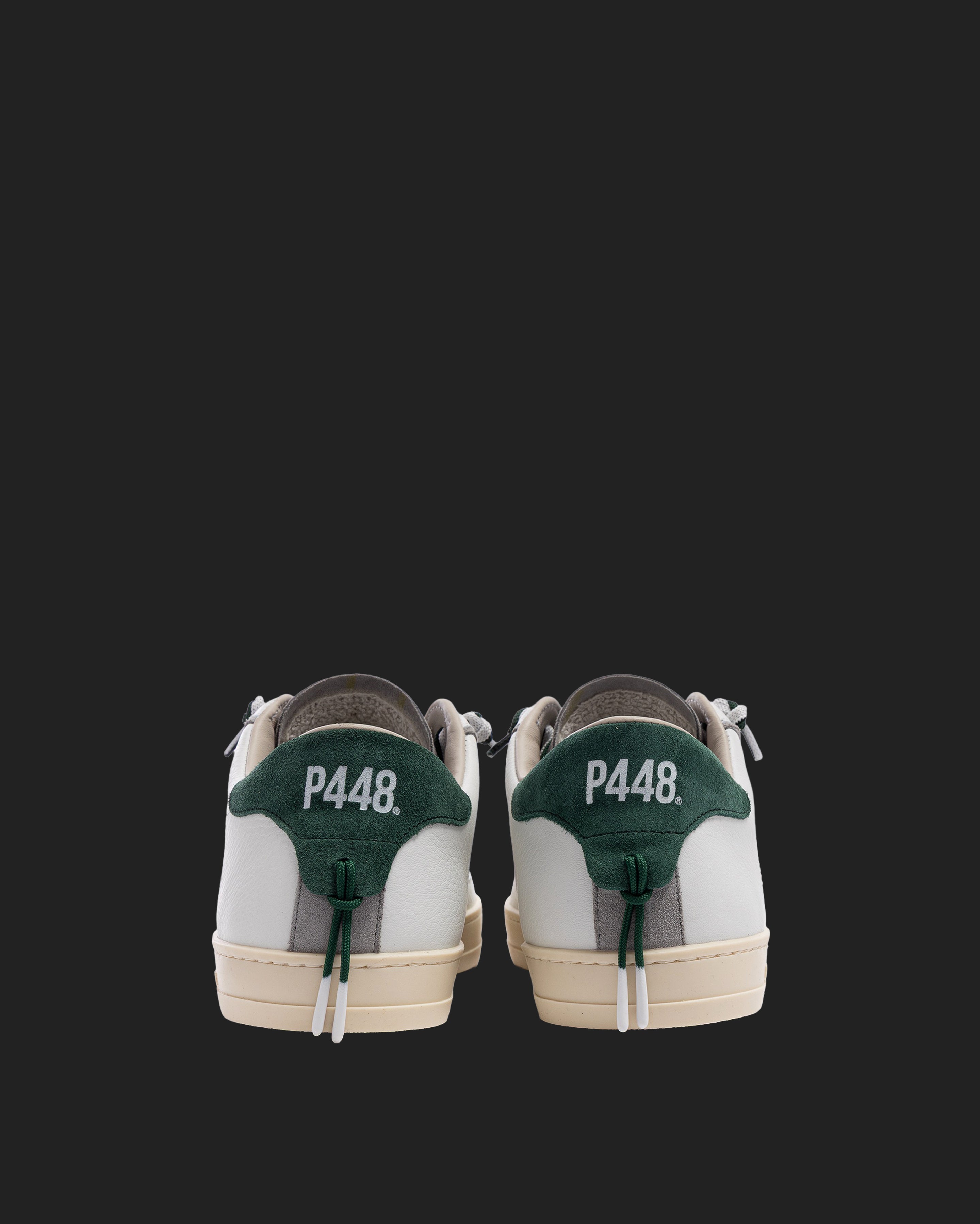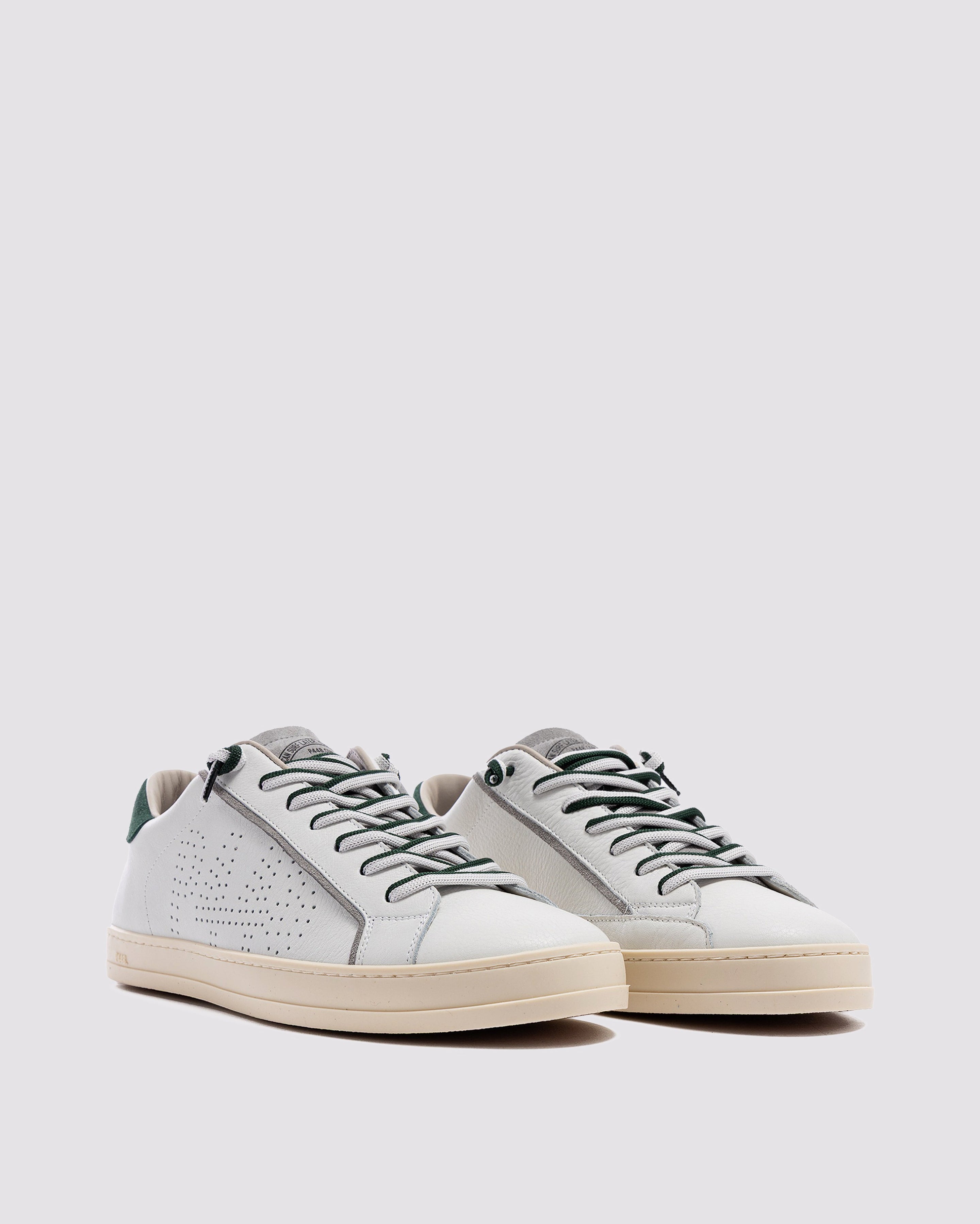 The John White Forrest is wrapped in white leather and grey suede, accented by a green suede heel tab, matching off-white and green laces, finished with a green lace charm. Our signature P448 rubber sole grounds the look. Swap in the extra pair of white laces to tie it all together.