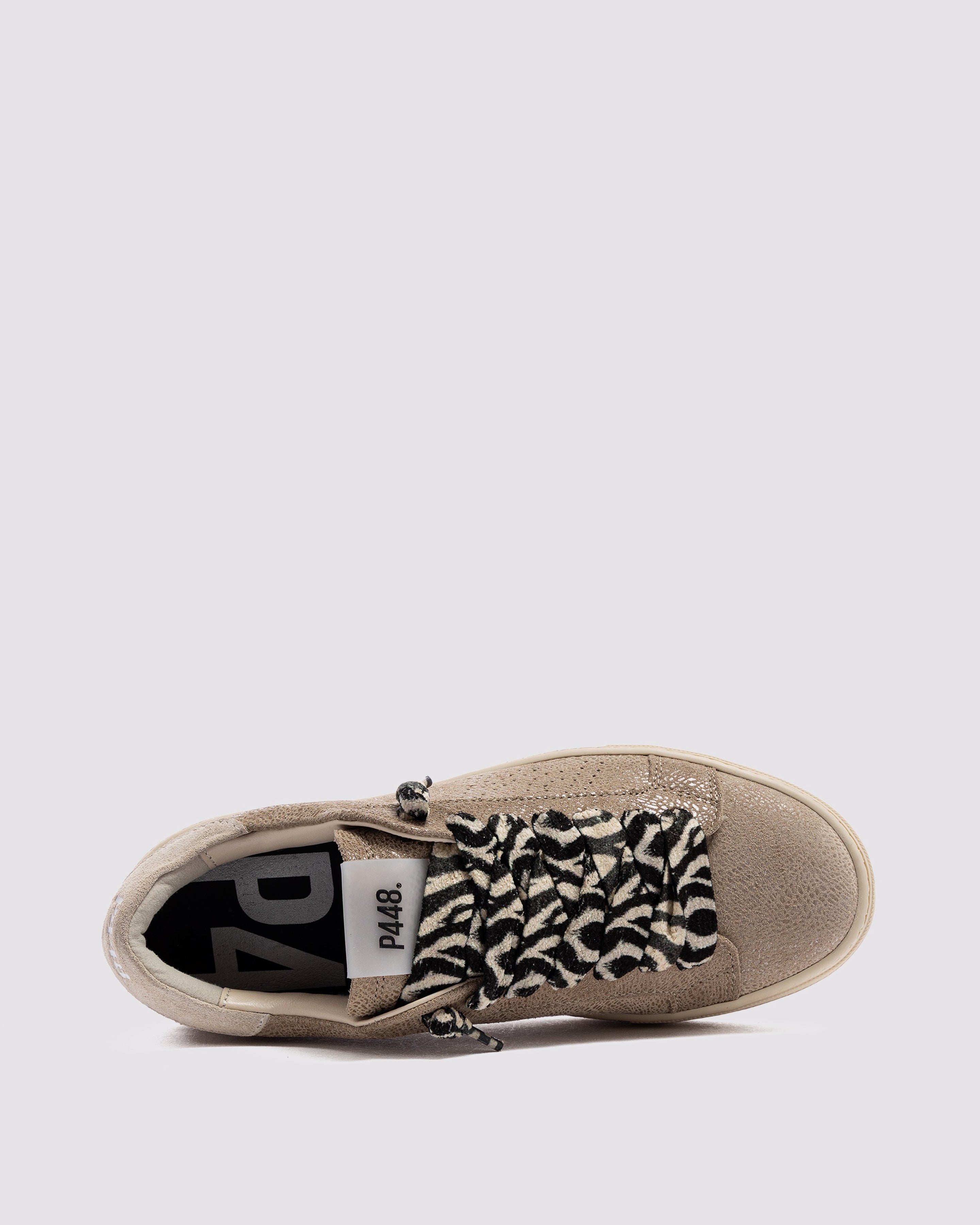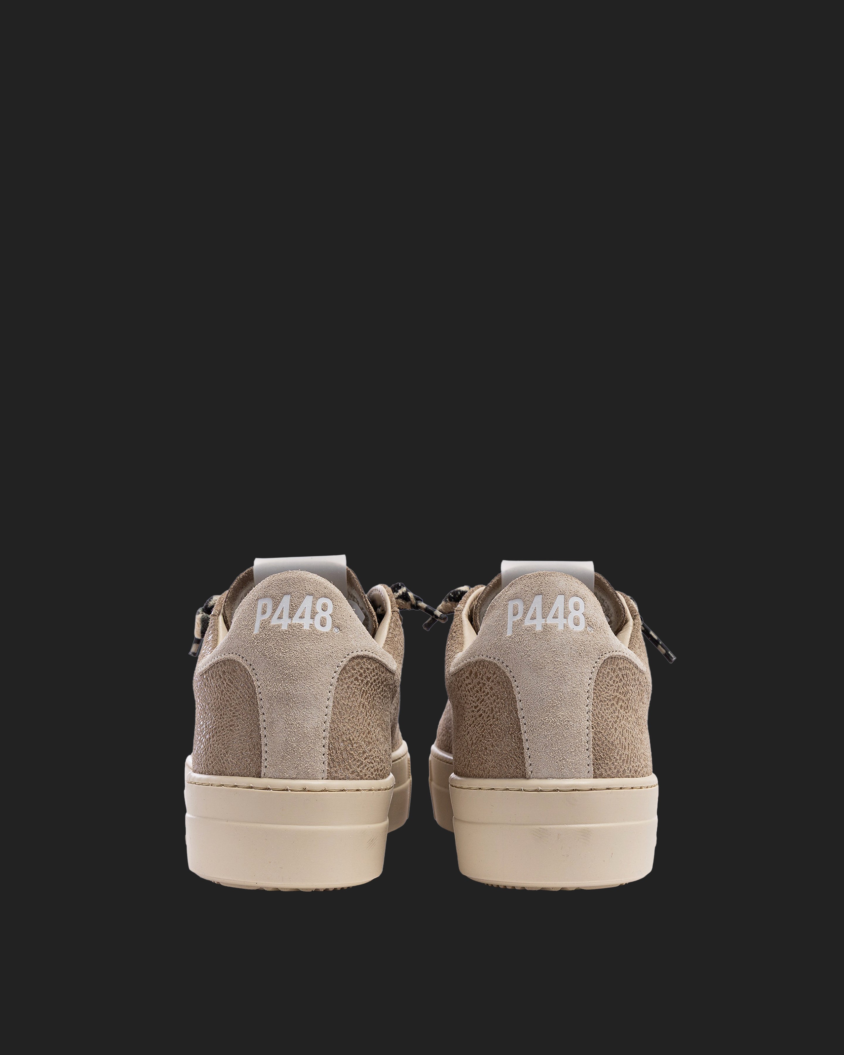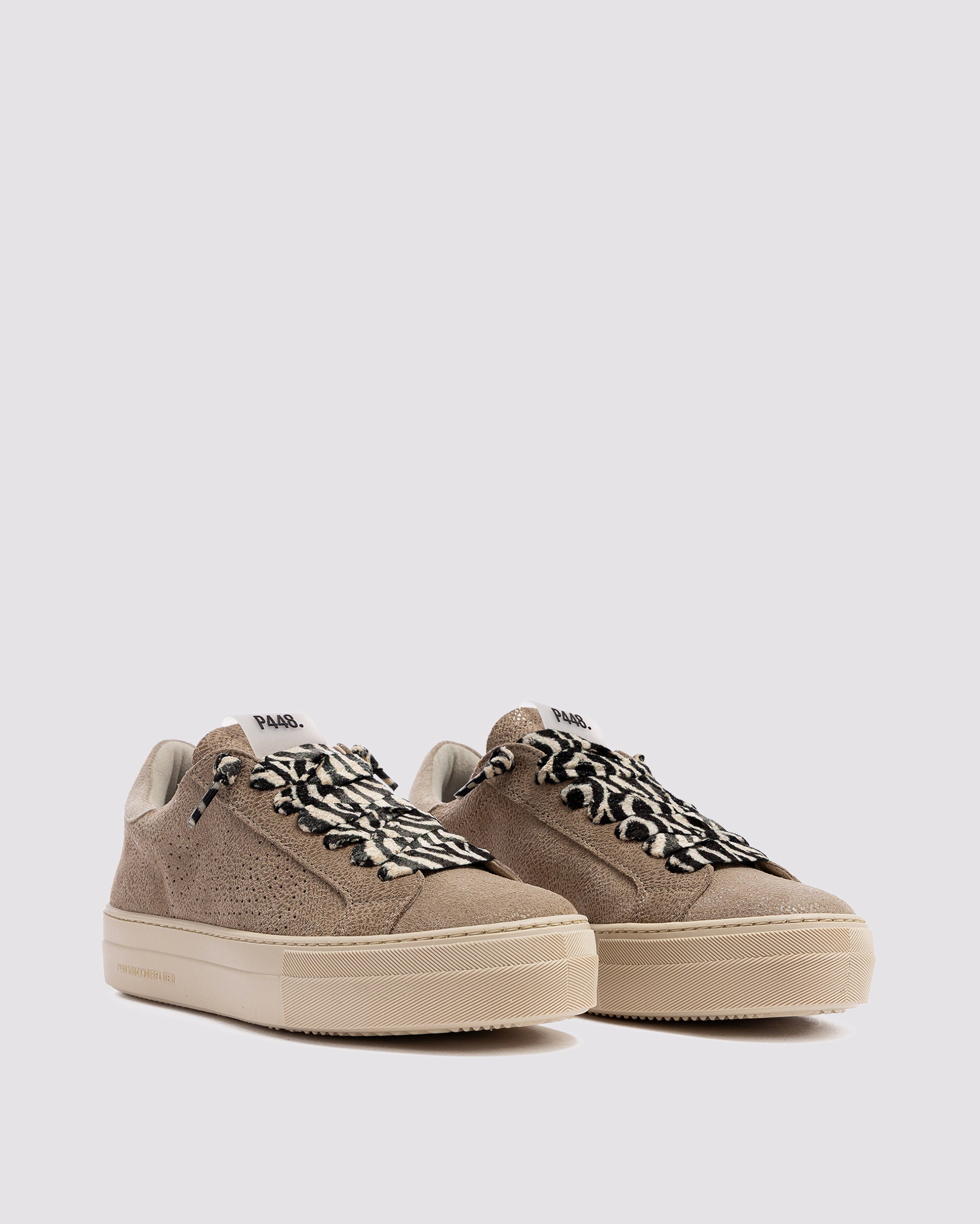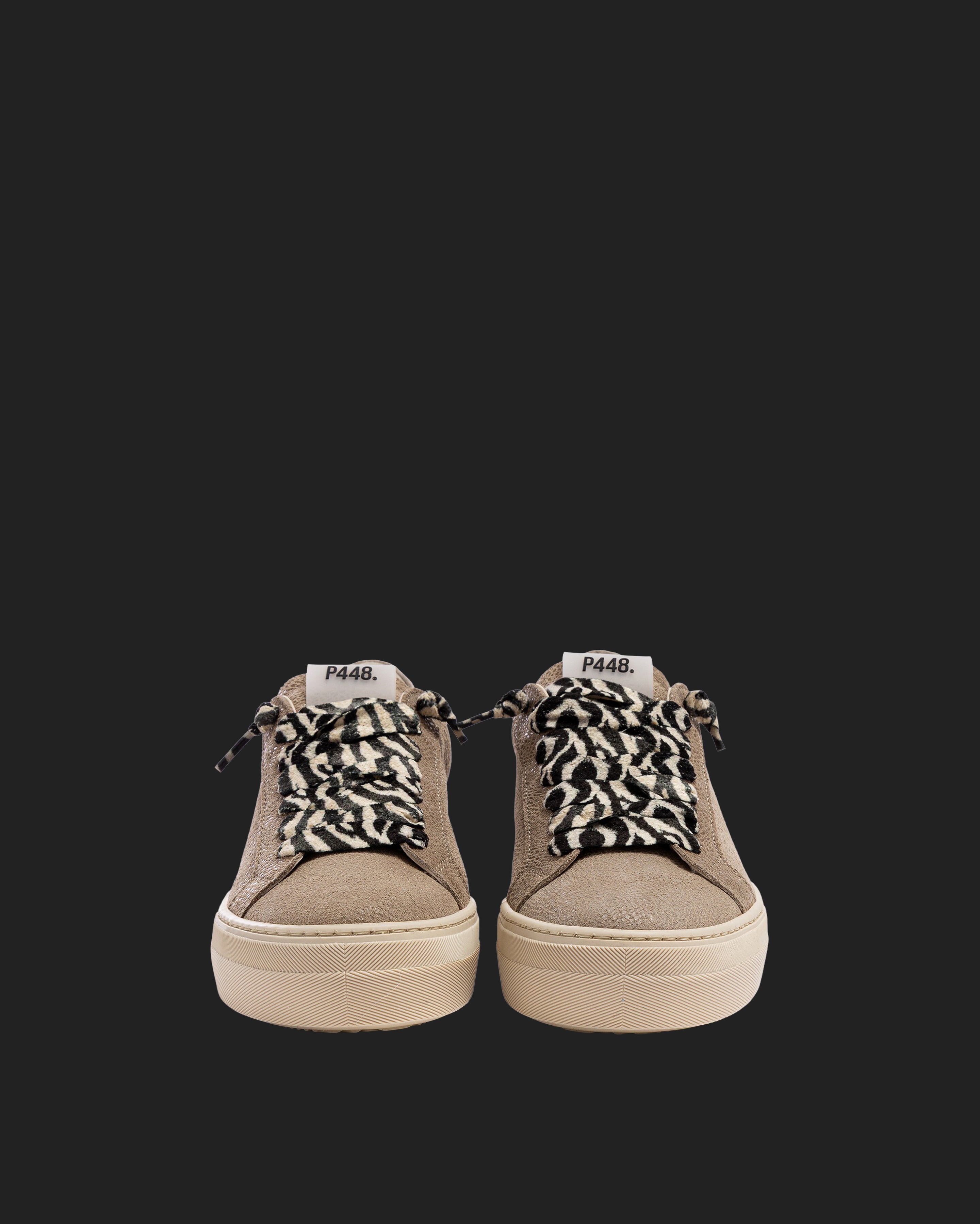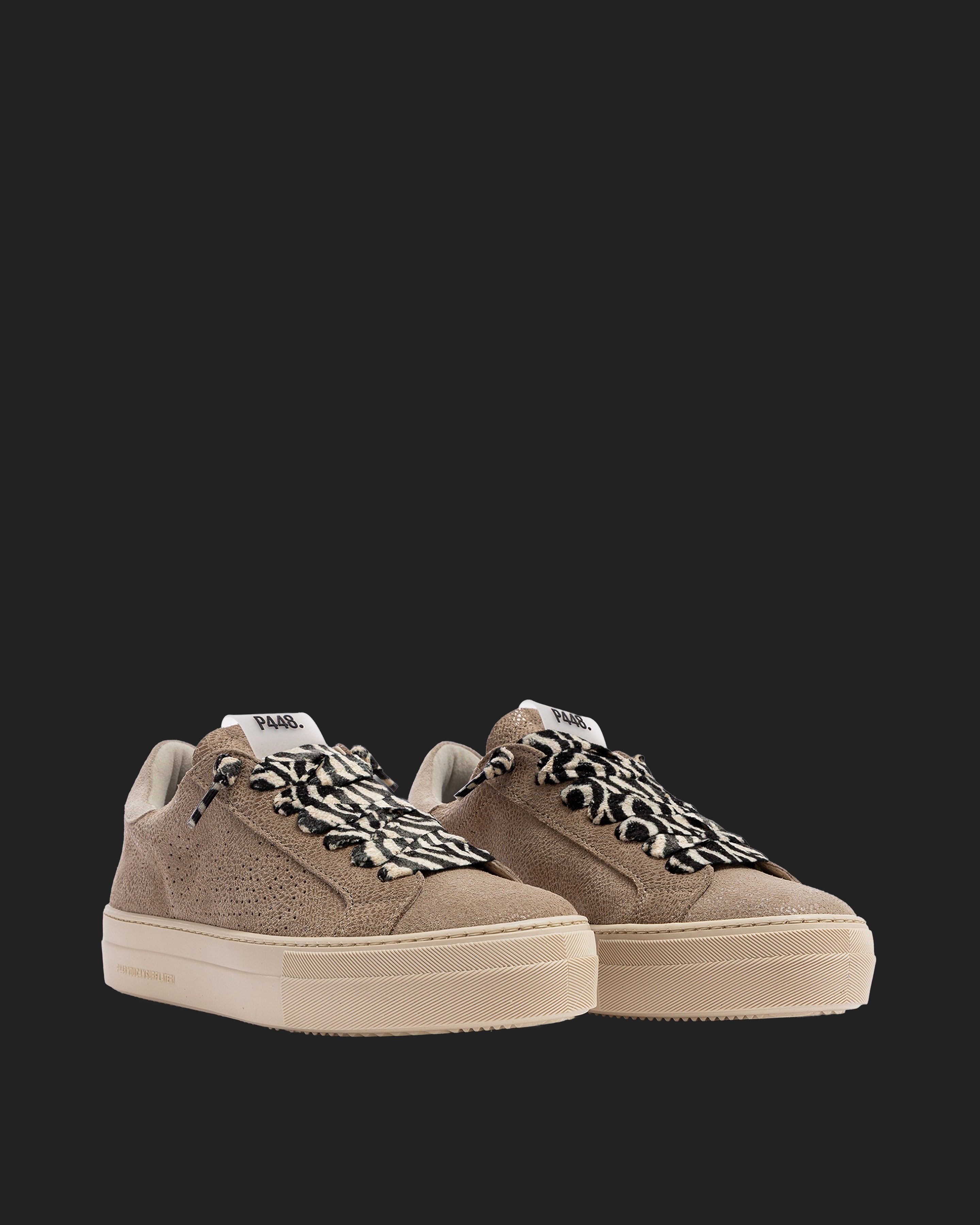 The Thea Stone is wrapped in beige suede with a sand suede heel tab, accented by a glitter leopard-printed beige suede tongue, trim, and toe. Black and sand laces, our signature P448 platform rubber sole and cream tread ground the look. Swap in the extra pair of cream laces to keep it simple. This playful platform runs small, so be sure to size up if you’re in between.